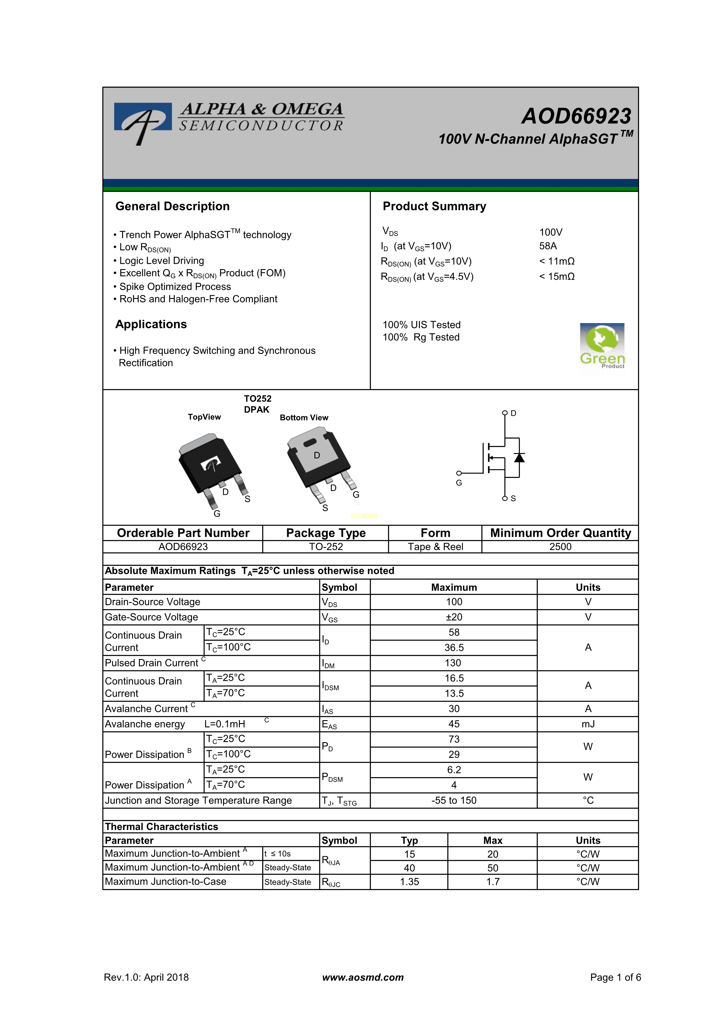 AOD66923数据手册TO-252封装AOSPDF规格书,中英文下载