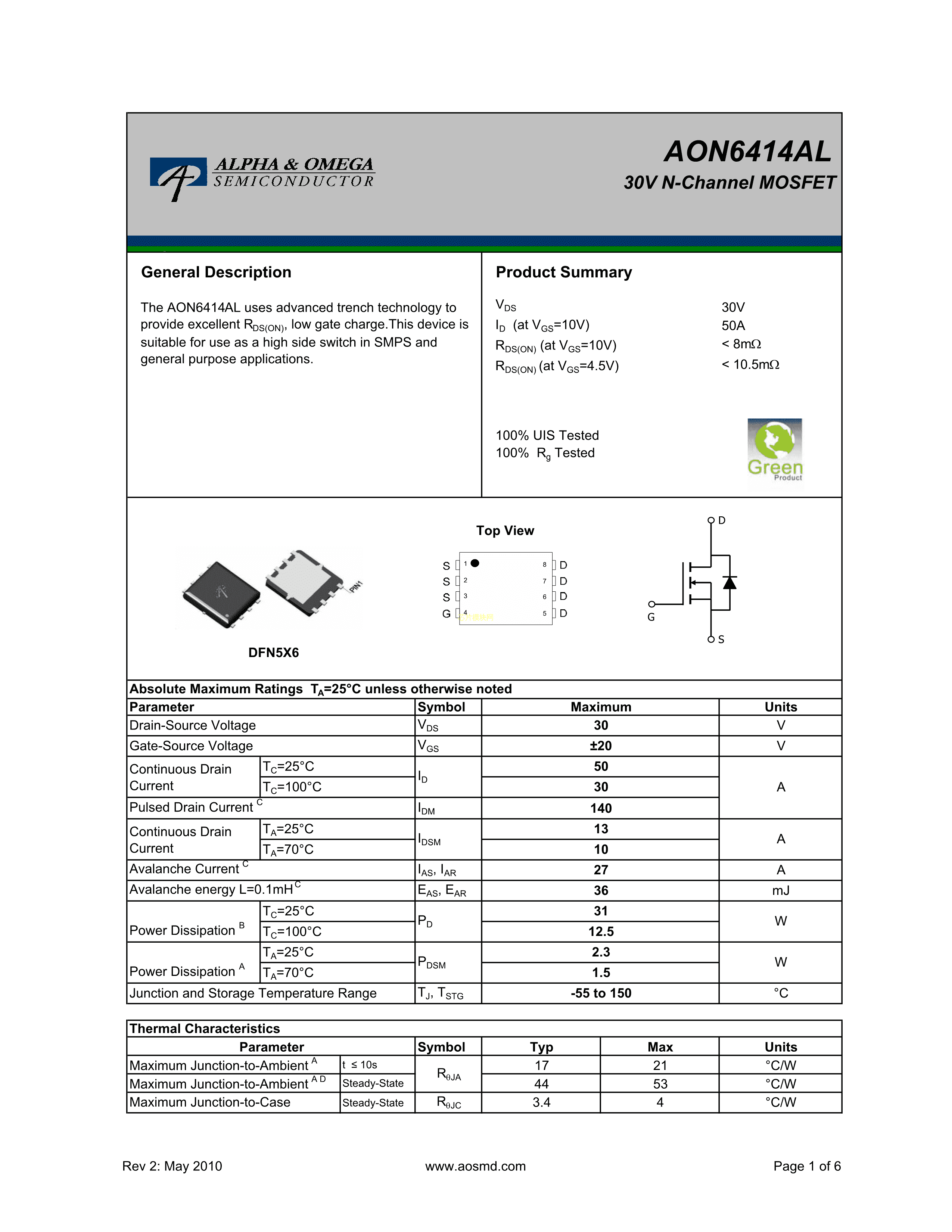 AON6414AL数据手册DFN(5x6)封装AOSPDF规格书,中英文下载