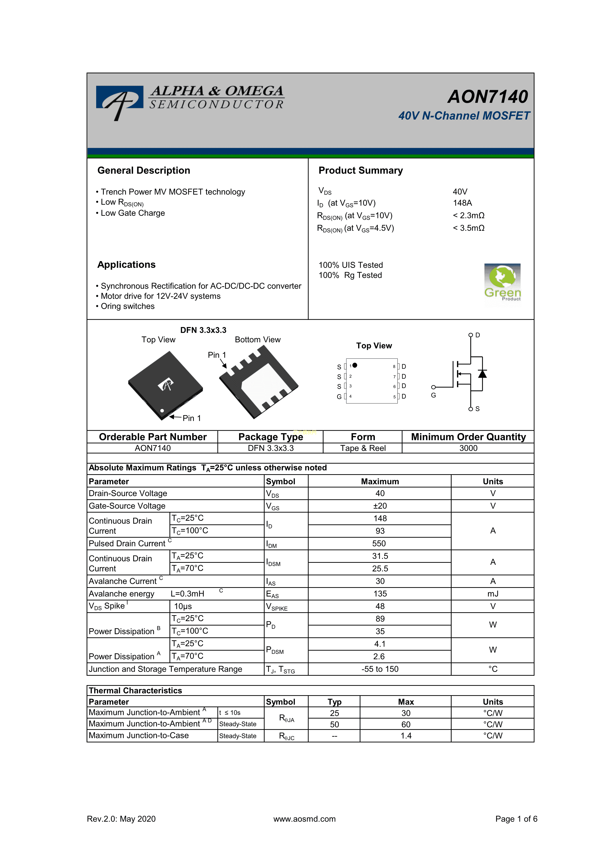 AON7140数据手册DFN 3.3x3.3封装AOSPDF规格书,中英文下载