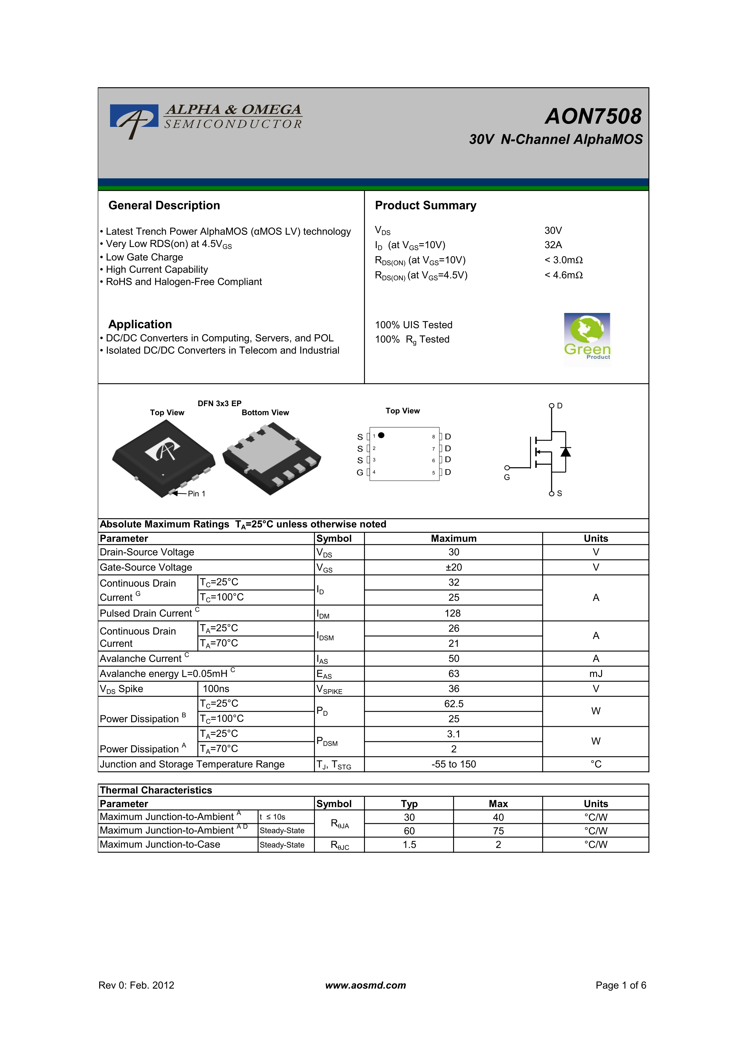 AON7508数据手册DFN 3x3封装AOSPDF规格书,中英文下载
