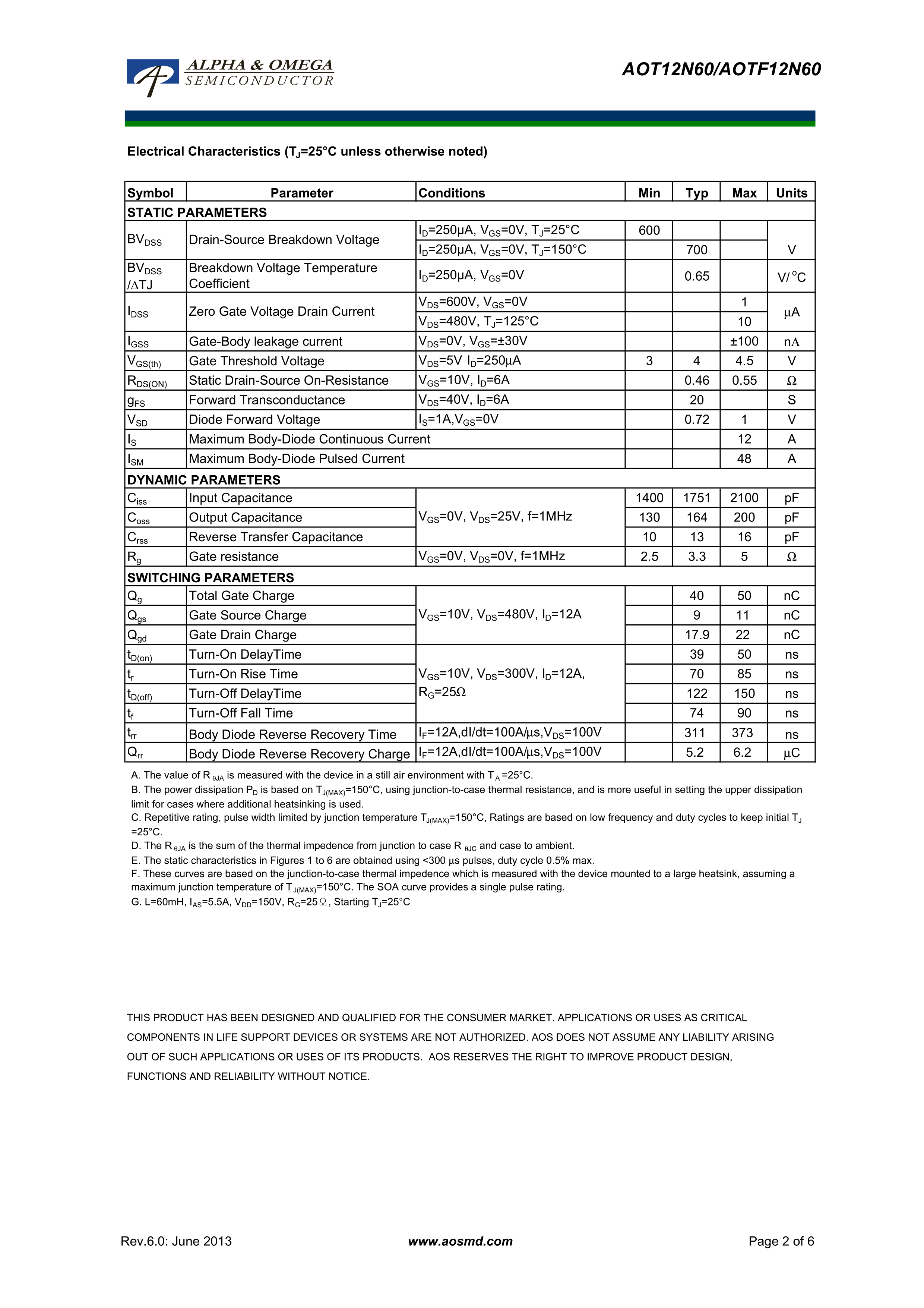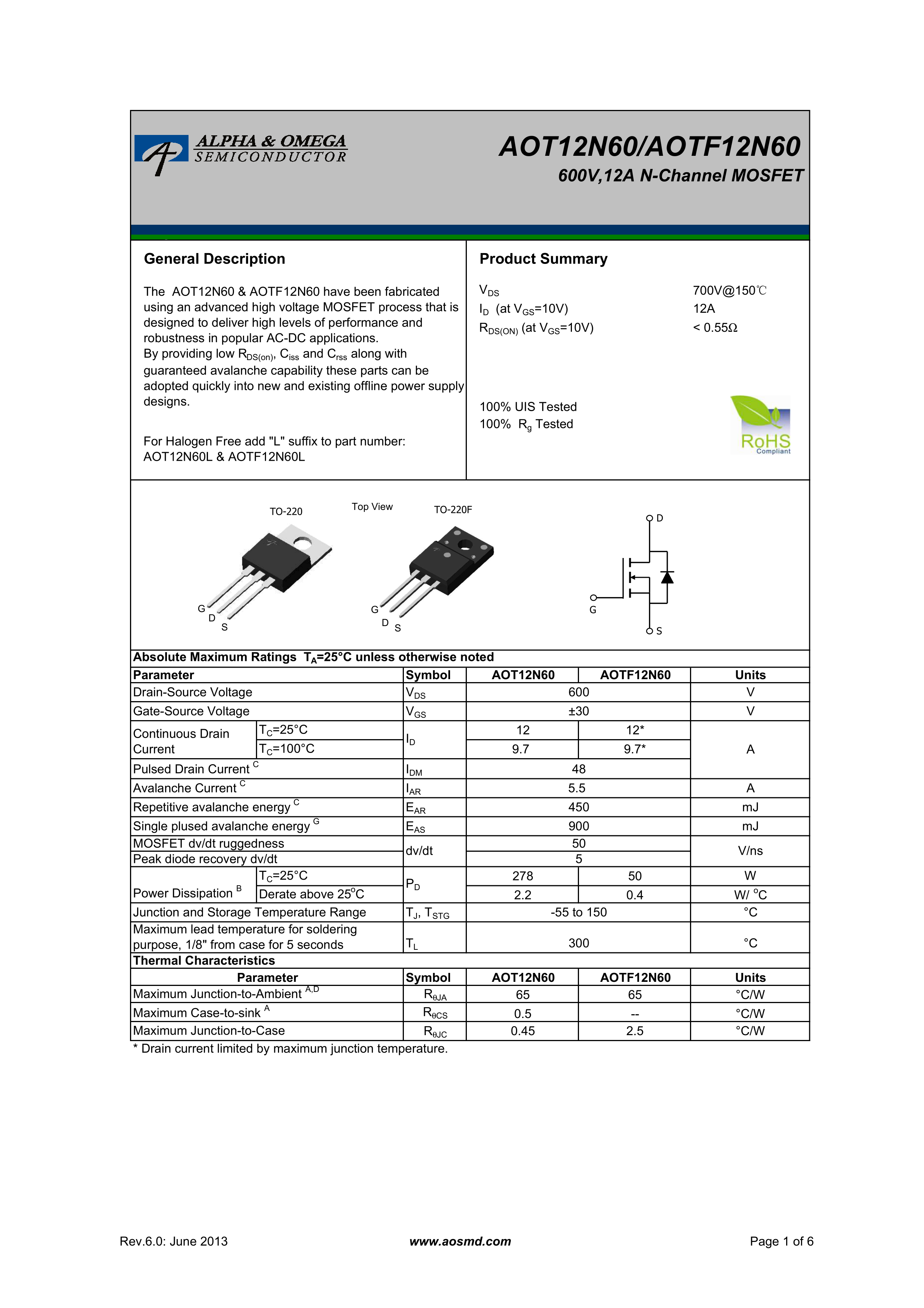AOTF12N60数据手册TO-220F(TO-220IS)封装AOSPDF规格书,中英文下载