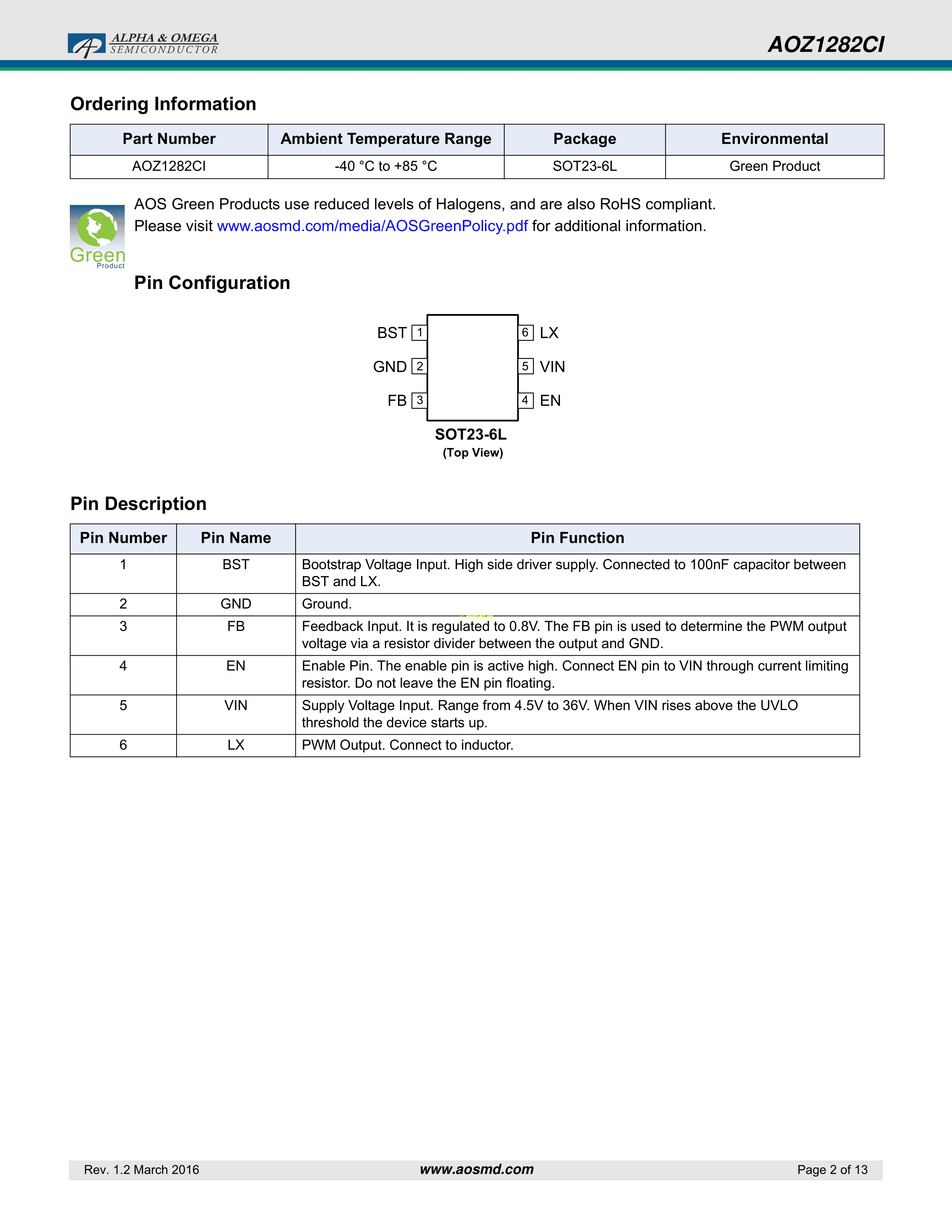 AOZ1282CI数据手册SOT-23-6封装AOSPDF规格书,中英文下载
