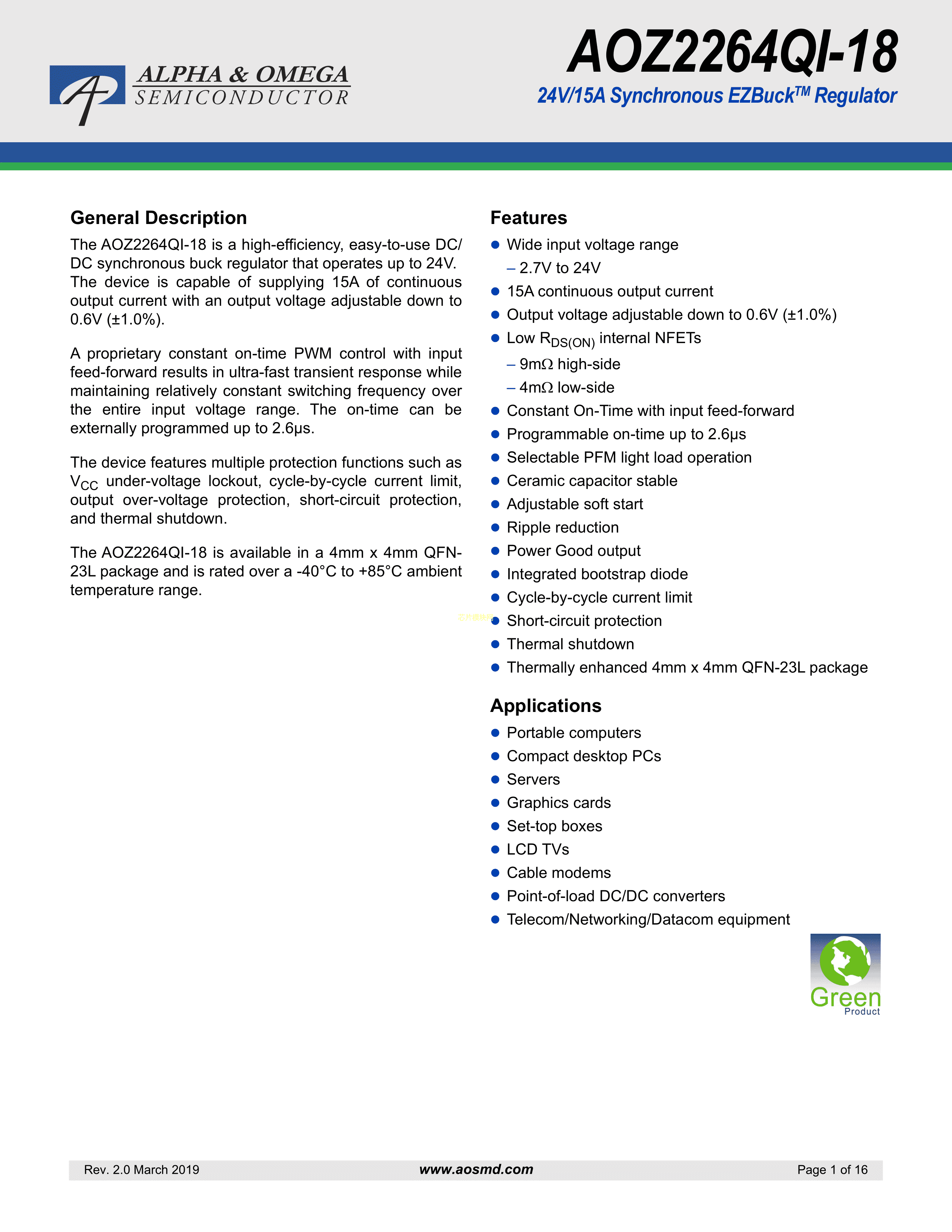 AOZ2264QI-18数据手册QFNB-23(4x4)封装AOSPDF规格书,中英文下载