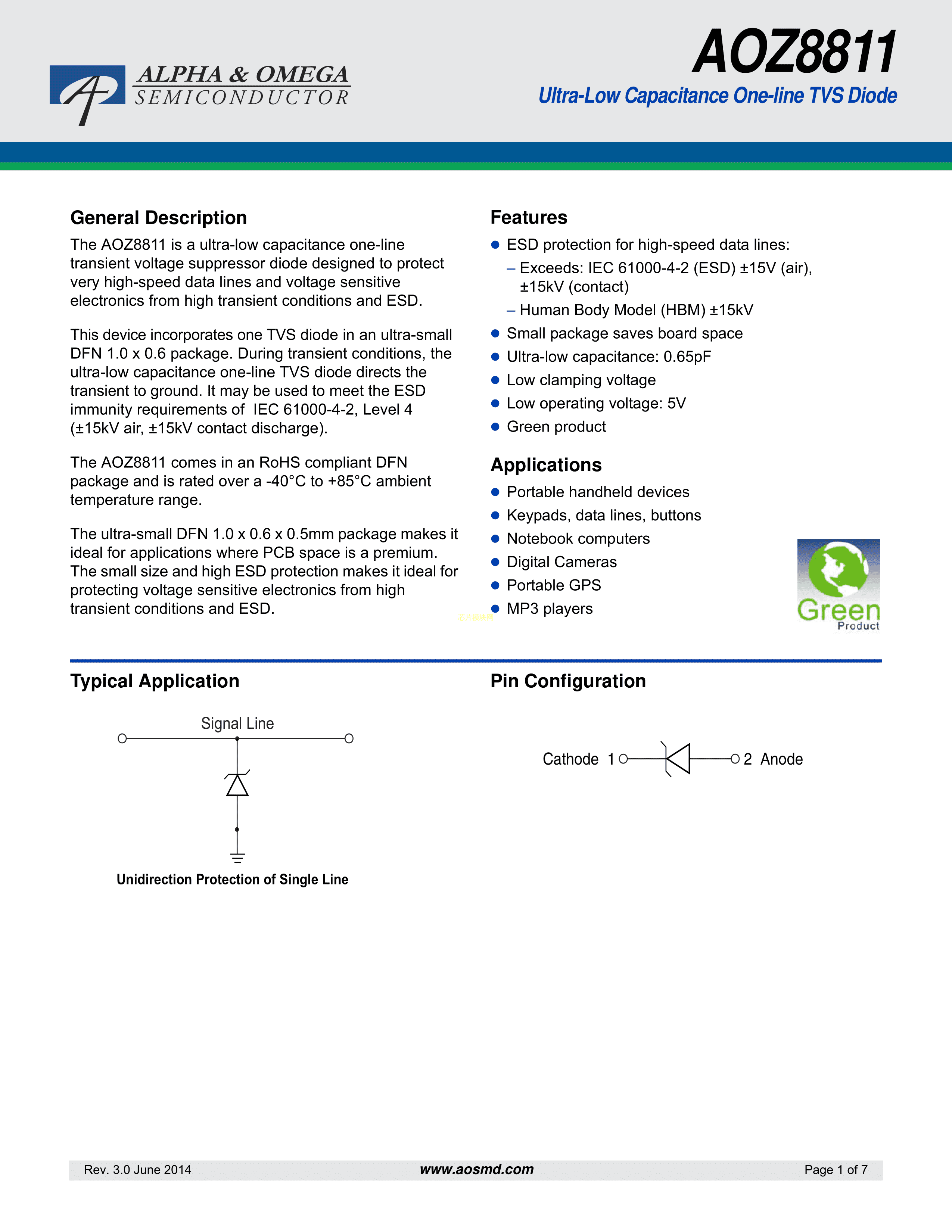 AOZ8811DI-05数据手册DFN-2(1x0.6)封装AOSPDF规格书,中英文下载