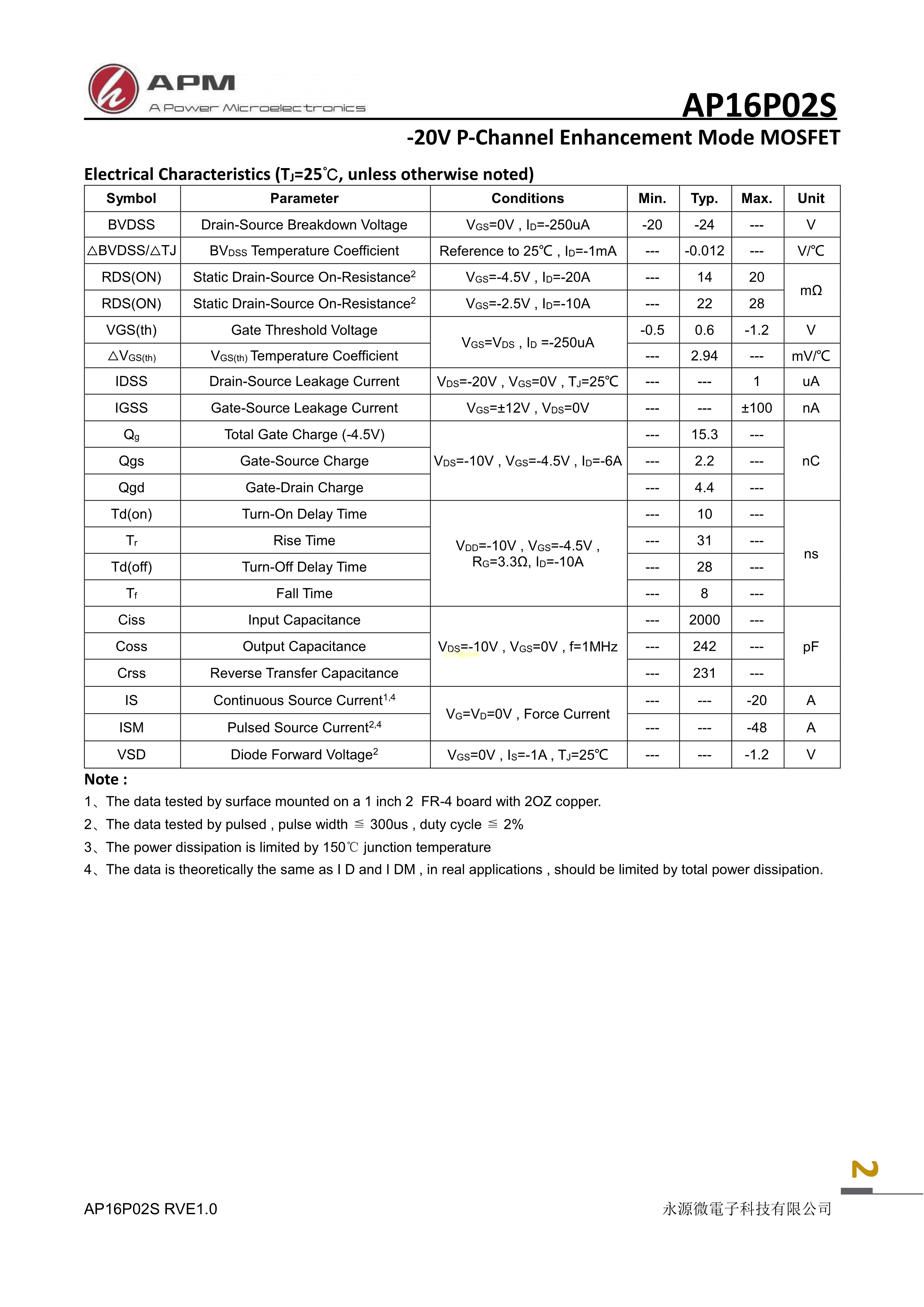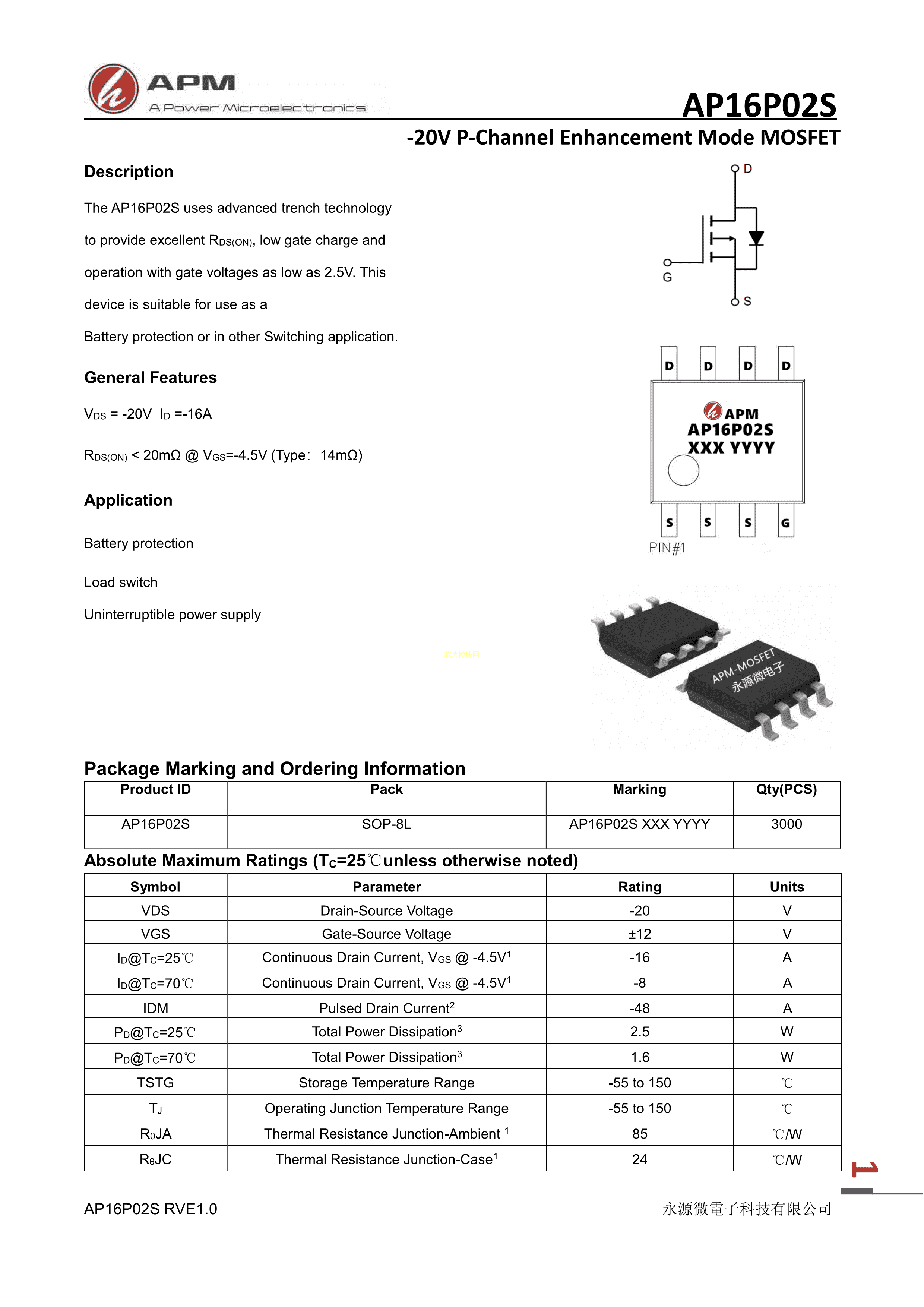 AP16P02S数据手册SOP-8封装APM(永源微电子)PDF规格书,中英文下载