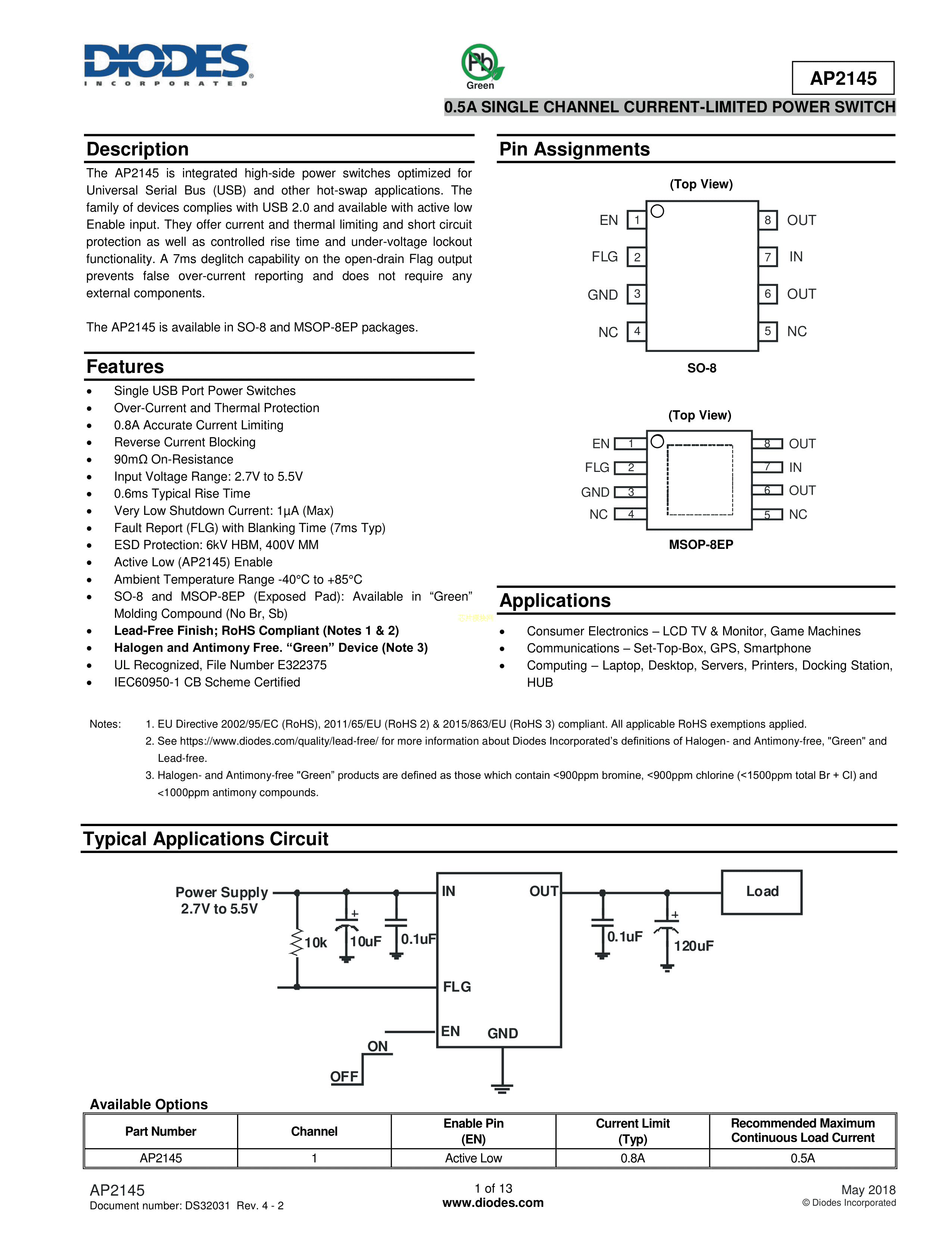 AP2145MPG-13数据手册MSOP-8EP封装DIODES(美台)PDF规格书,中英文下载