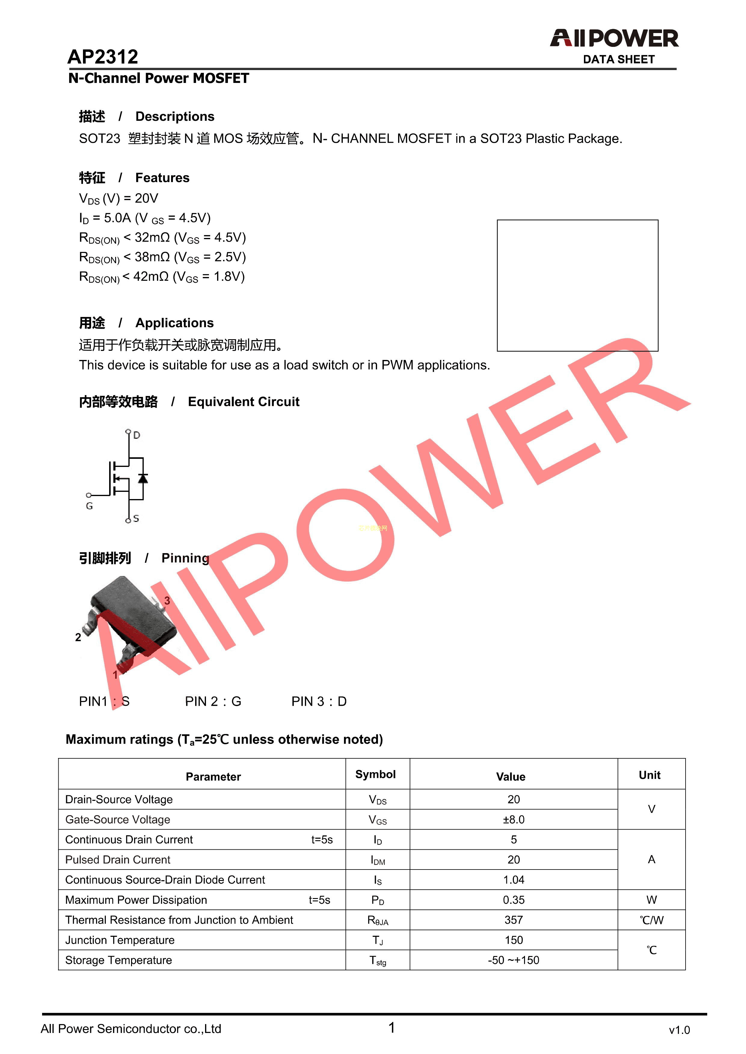 AP2312数据手册SOT-23封装ALLPOWER(铨力)PDF规格书,中英文下载