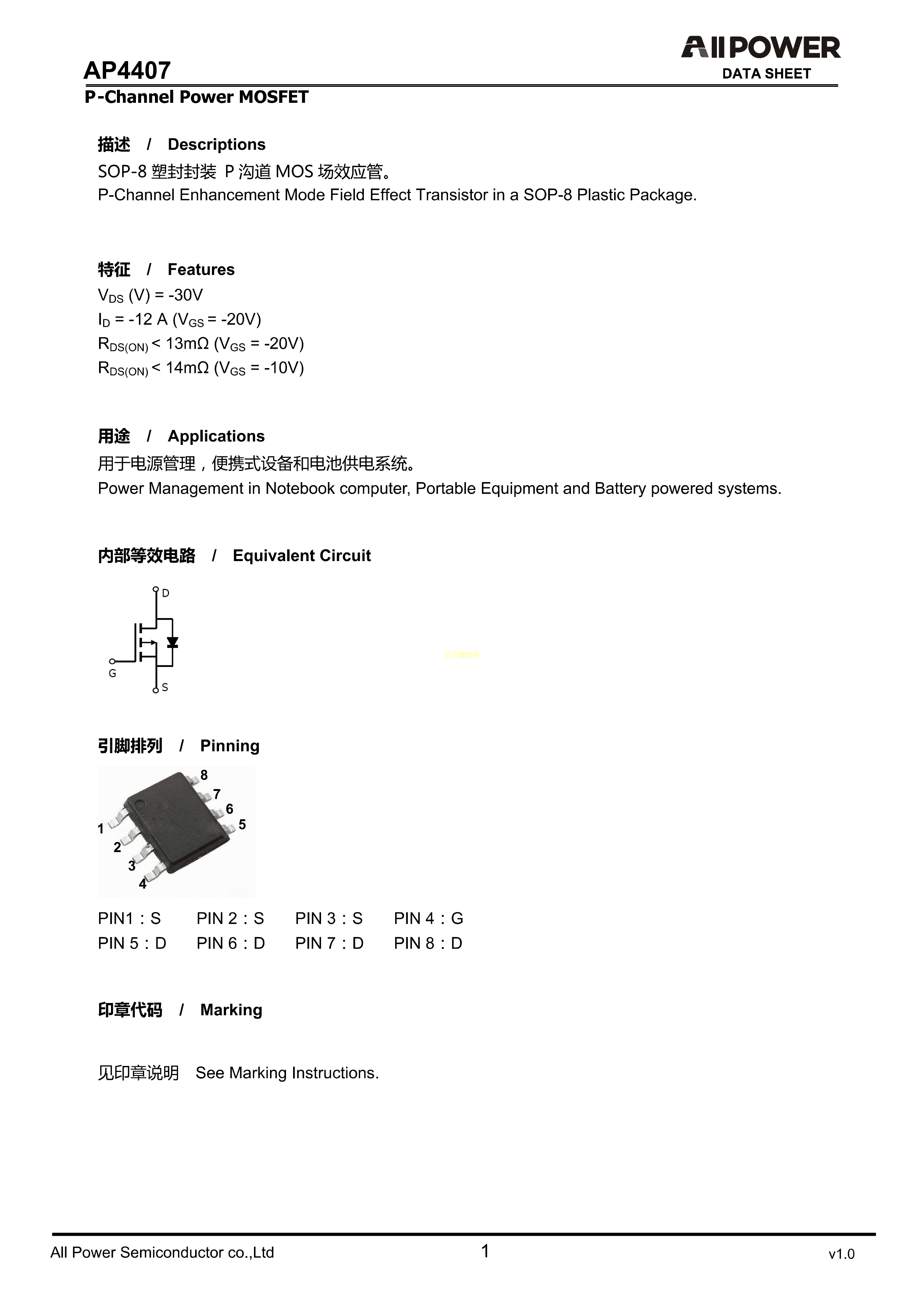 AP4407数据手册SOP-8封装ALLPOWER(铨力)PDF规格书,中英文下载