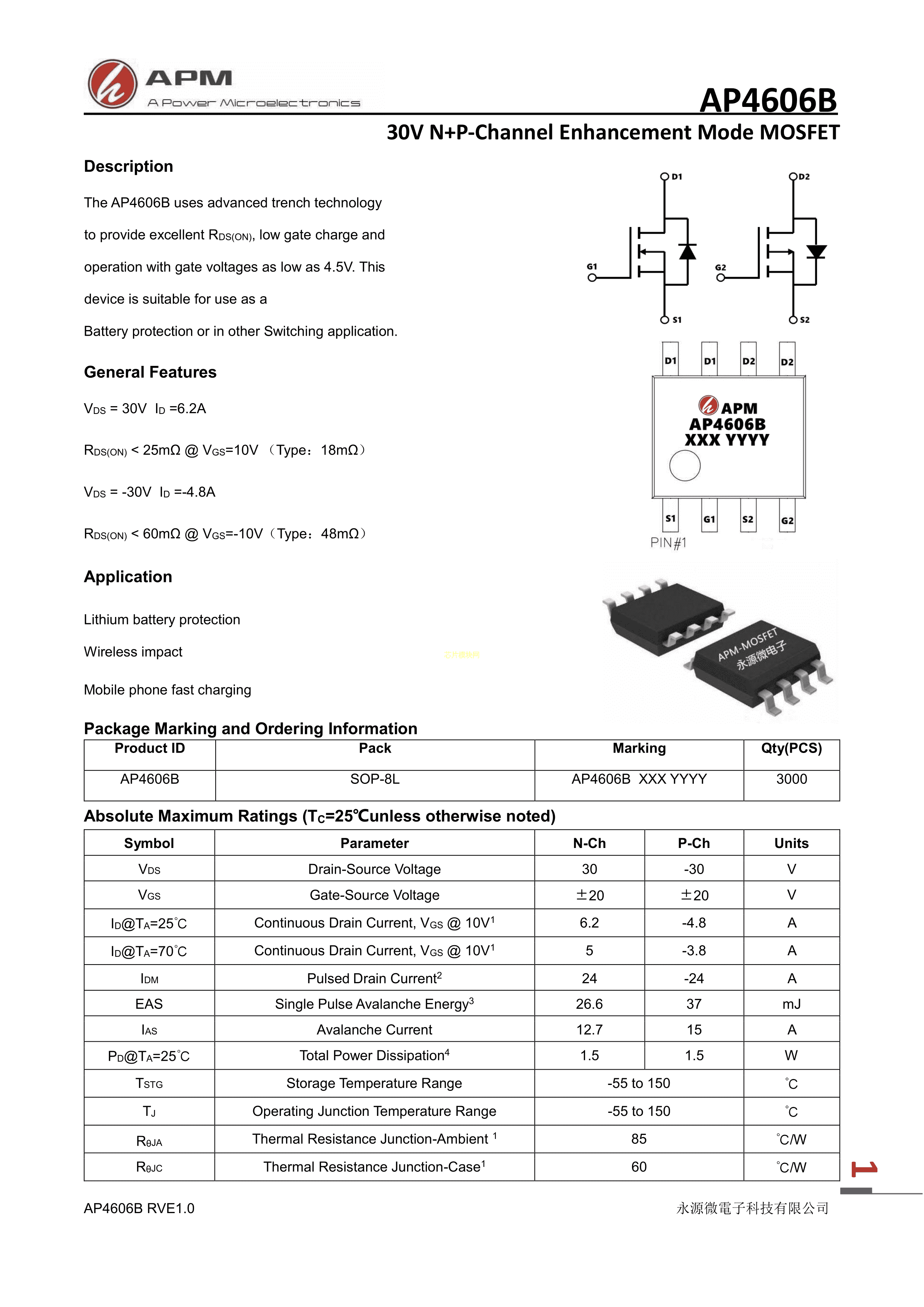 AP4606B数据手册SOP-8L封装APM(永源微电子)PDF规格书,中英文下载
