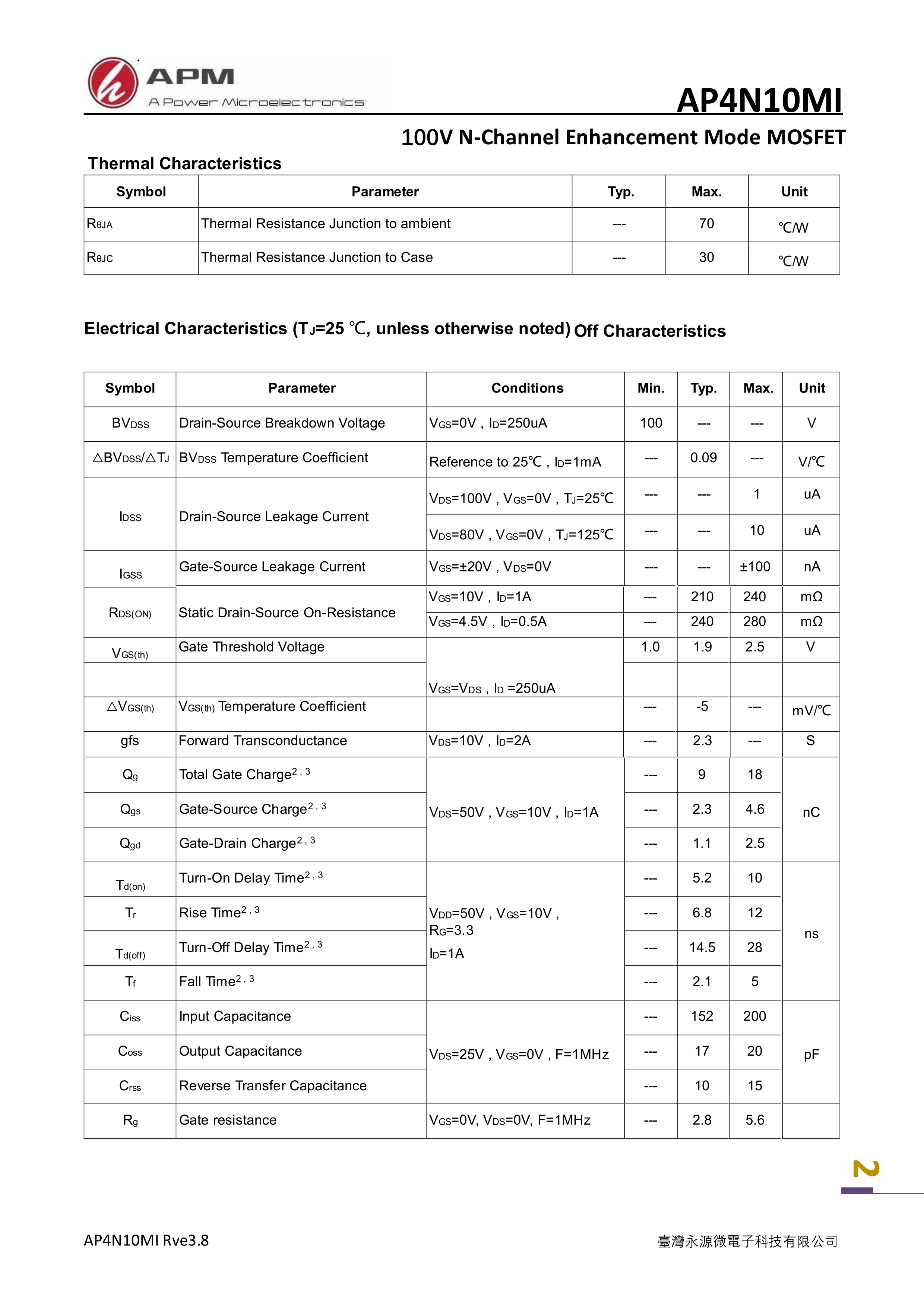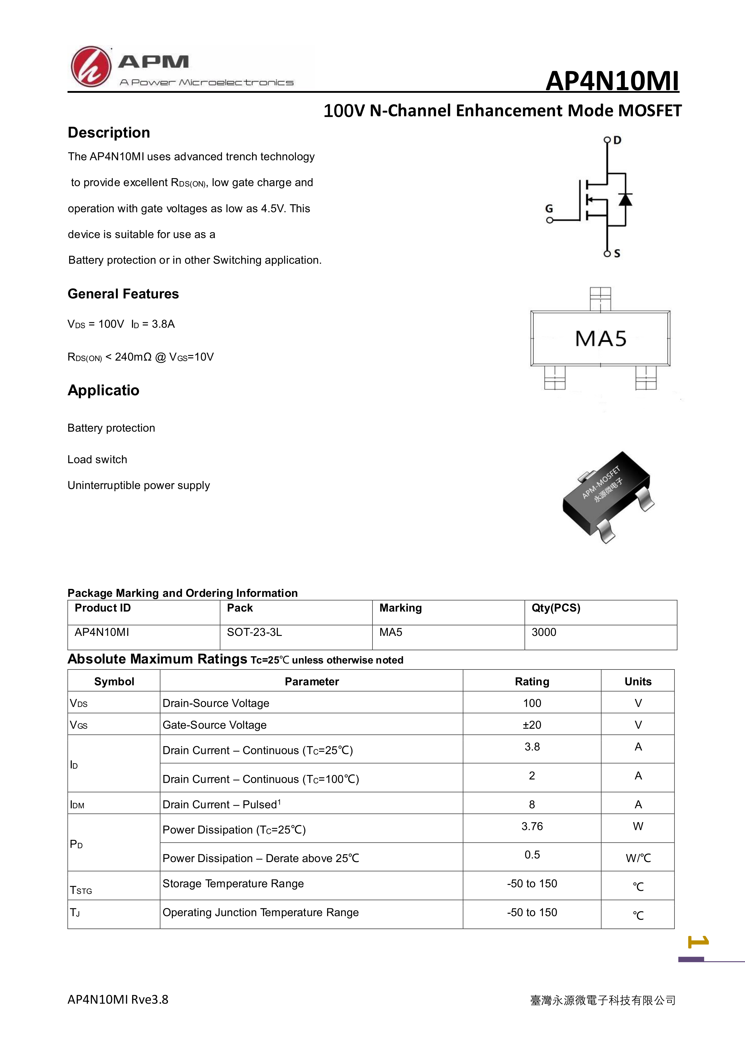 AP4N10MI数据手册SOT-23-3L封装APM(永源微电子)PDF规格书,中英文下载