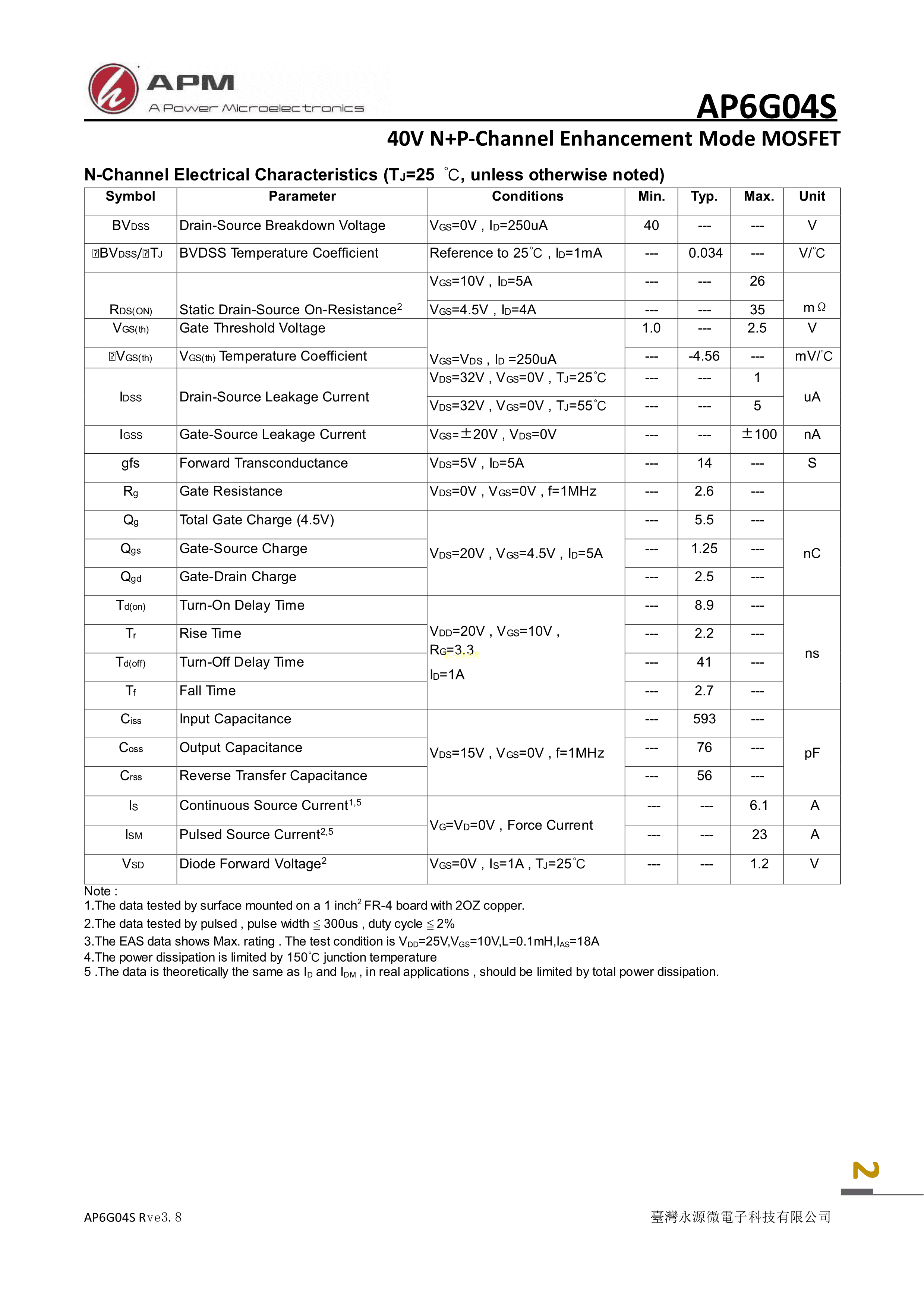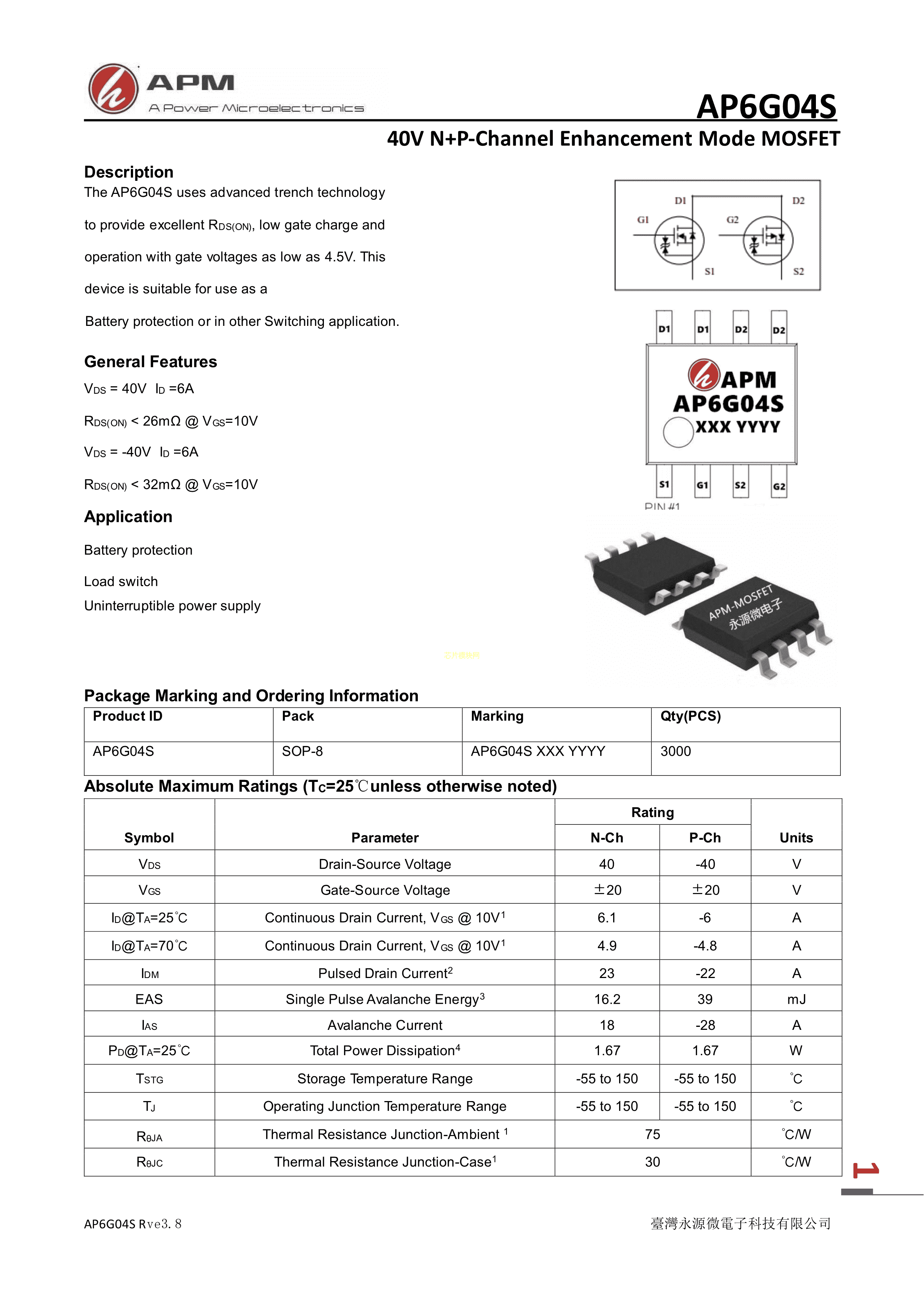 AP6G04S数据手册SOP-8封装APM(永源微电子)PDF规格书,中英文下载