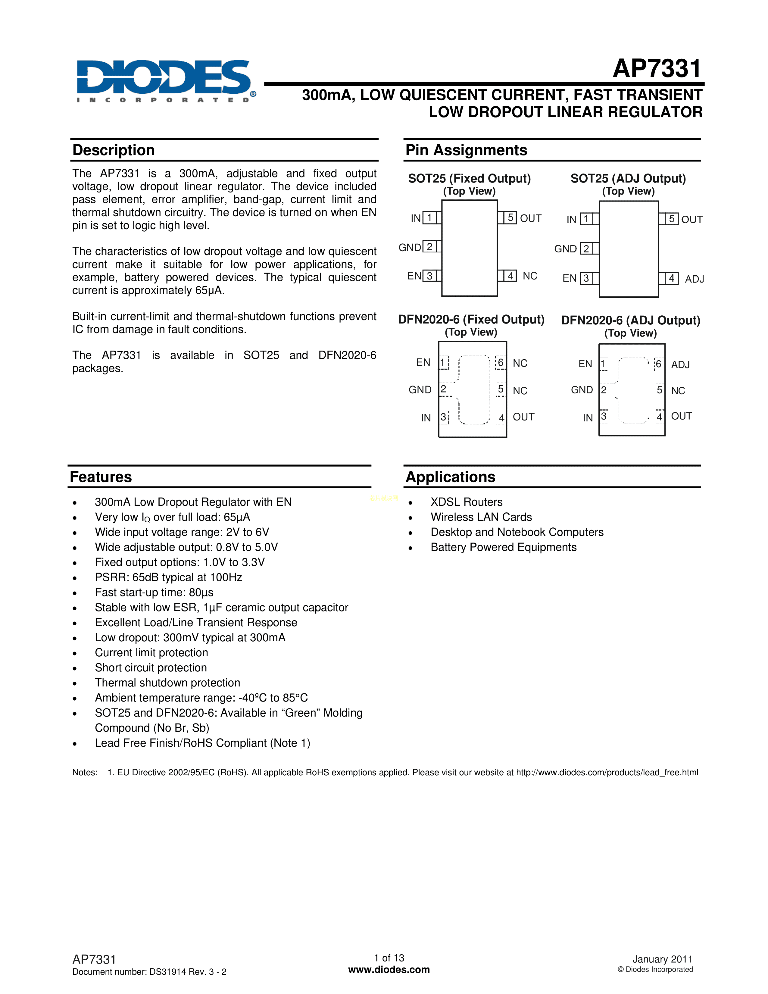 AP7331-25WG-7数据手册SOT-25封装DIODES(美台)PDF规格书,中英文下载