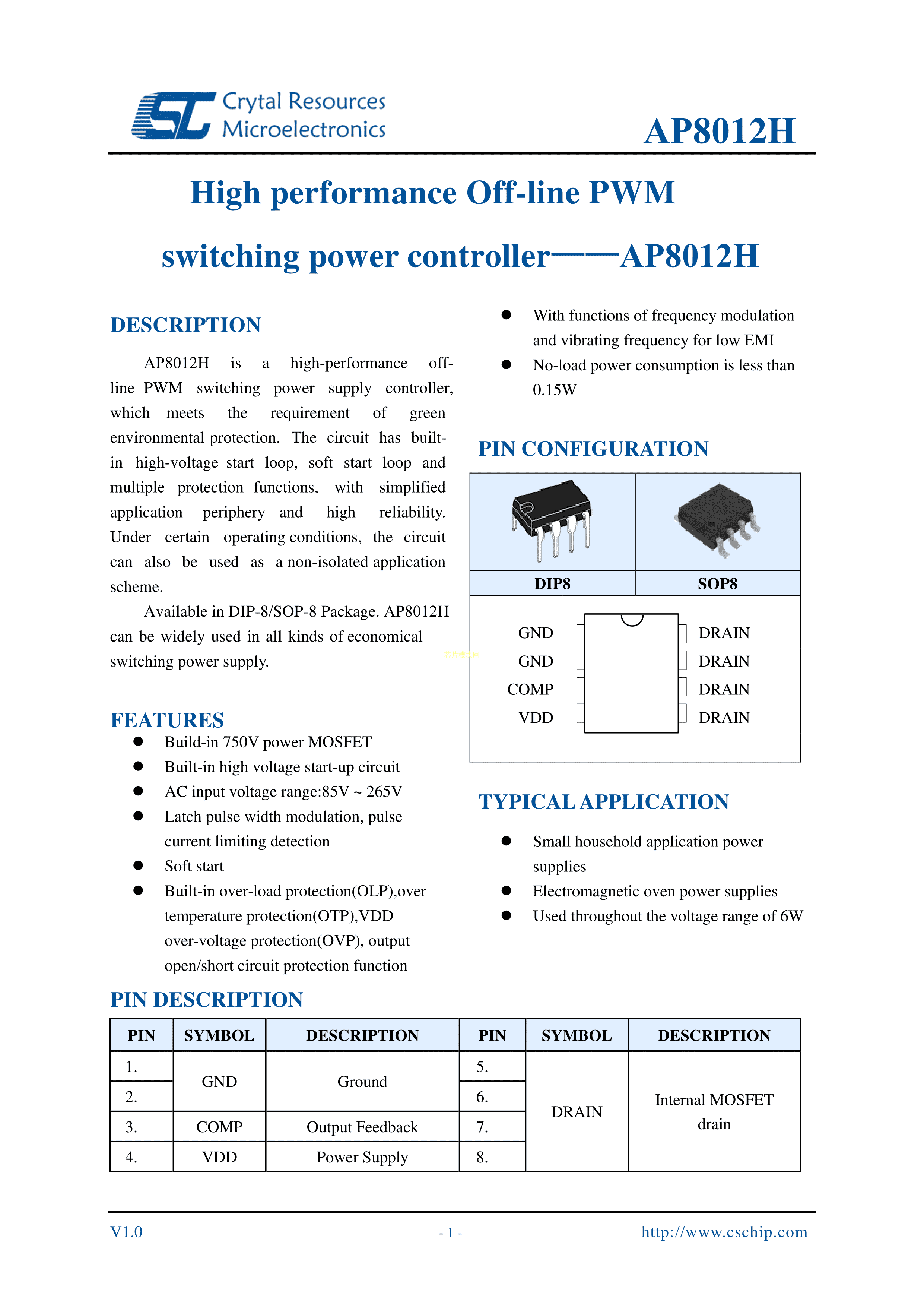 AP8012H数据手册DIP-8封装cschip(晶源微)PDF规格书,中英文下载