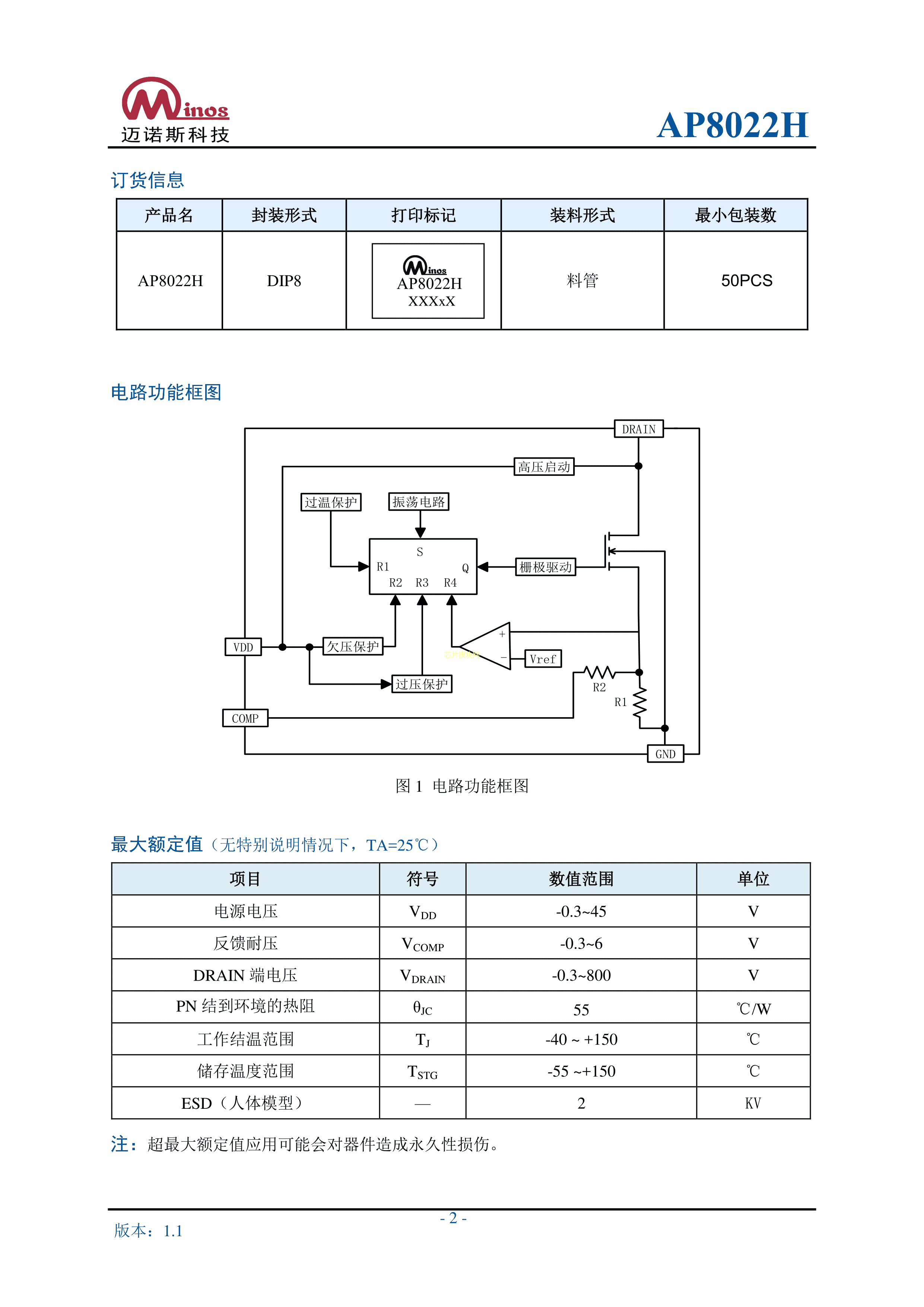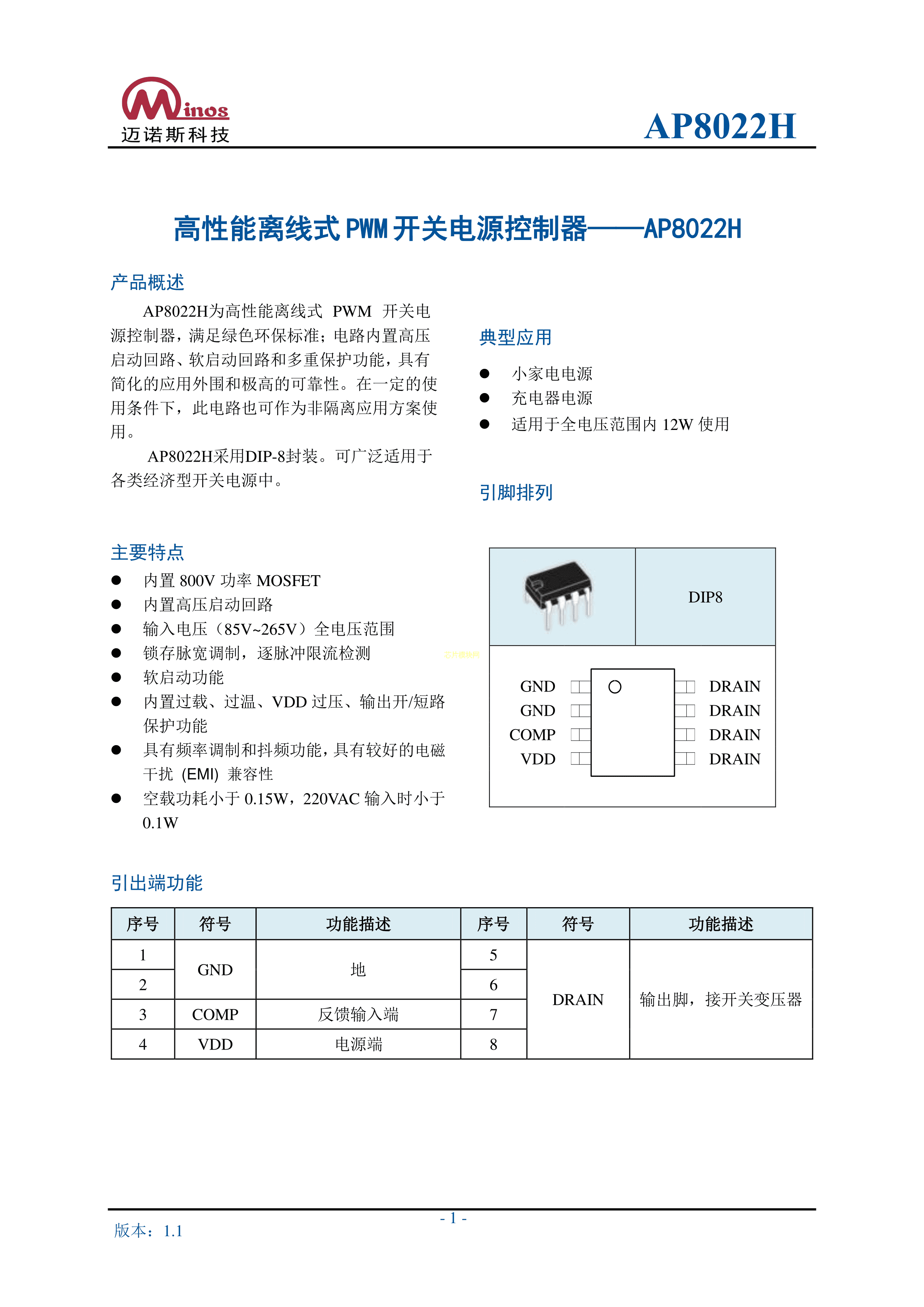 AP8022H数据手册DIP-8封装minos(迈诺斯)PDF规格书,中英文下载