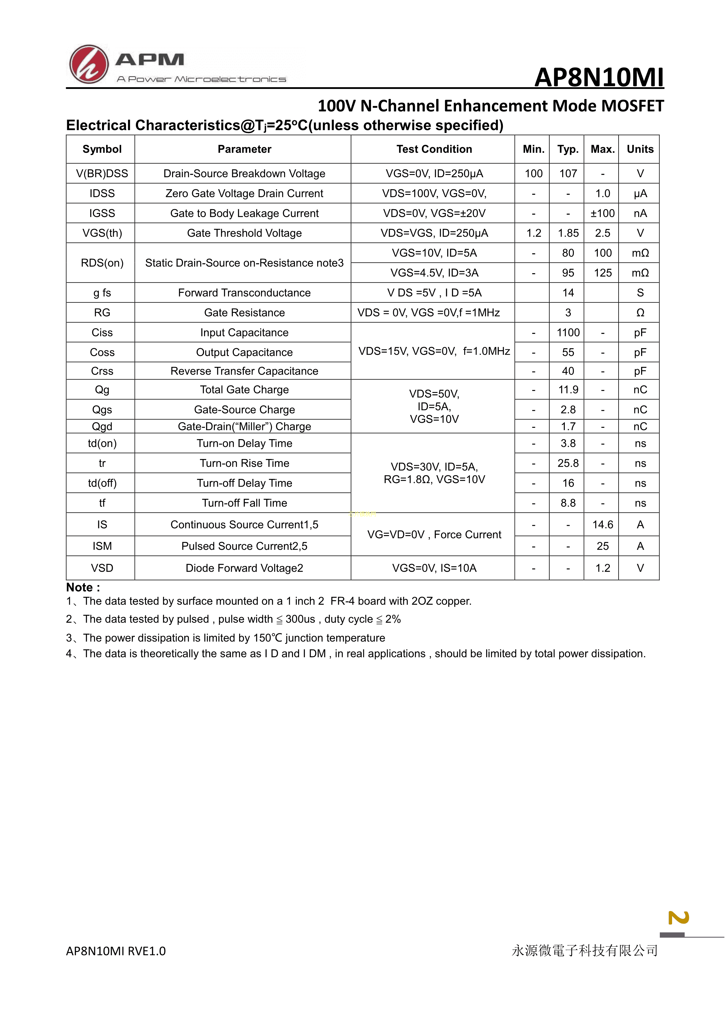 AP8N10MI数据手册SOT-23-3L封装APM(永源微电子)PDF规格书,中英文下载