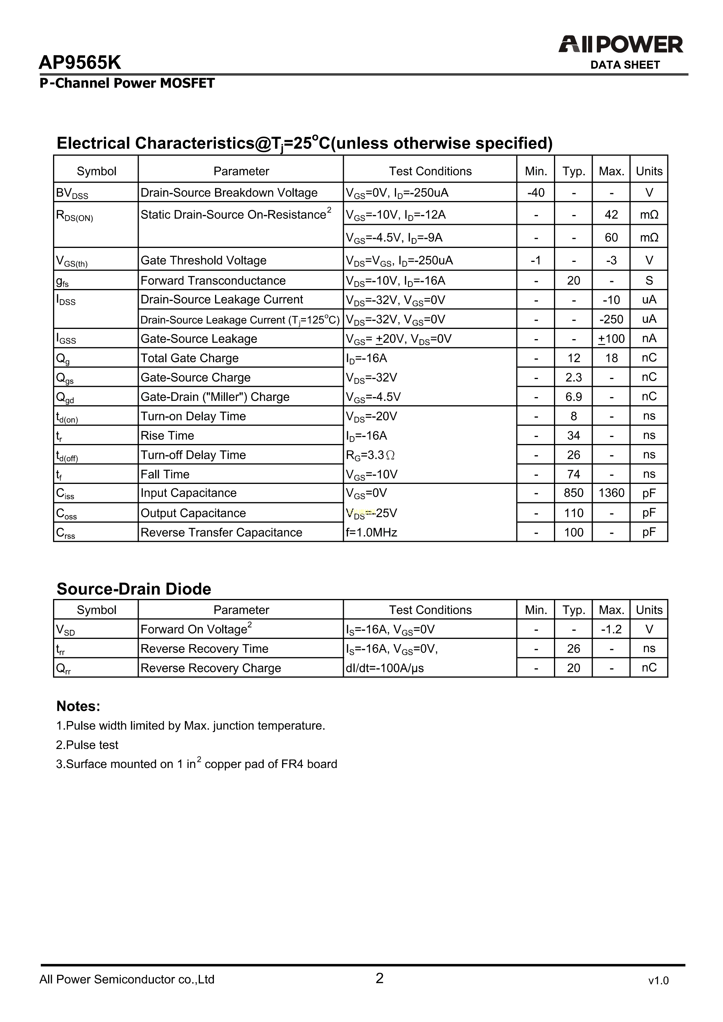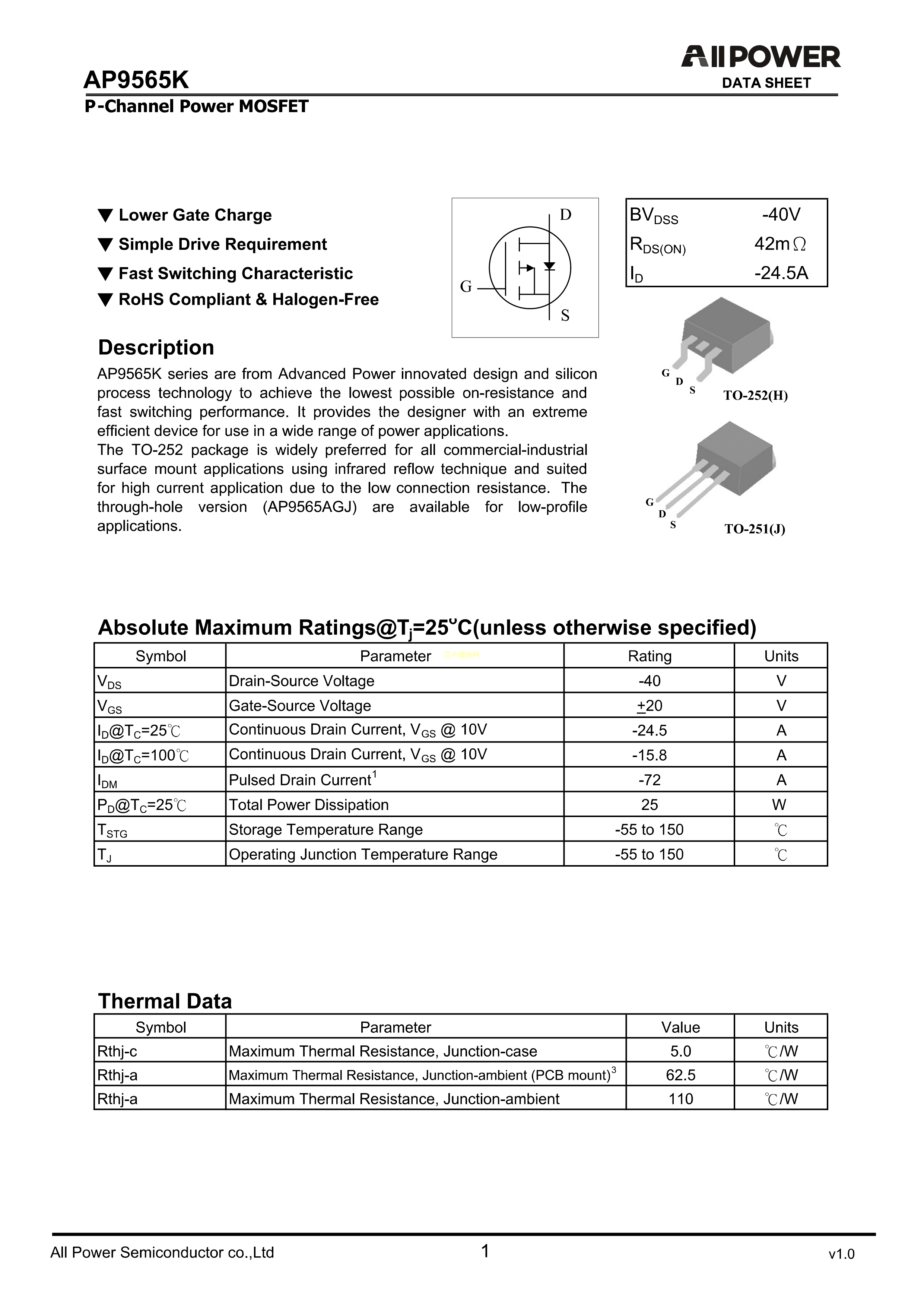 AP9565K数据手册TO-252封装ALLPOWER(铨力)PDF规格书,中英文下载