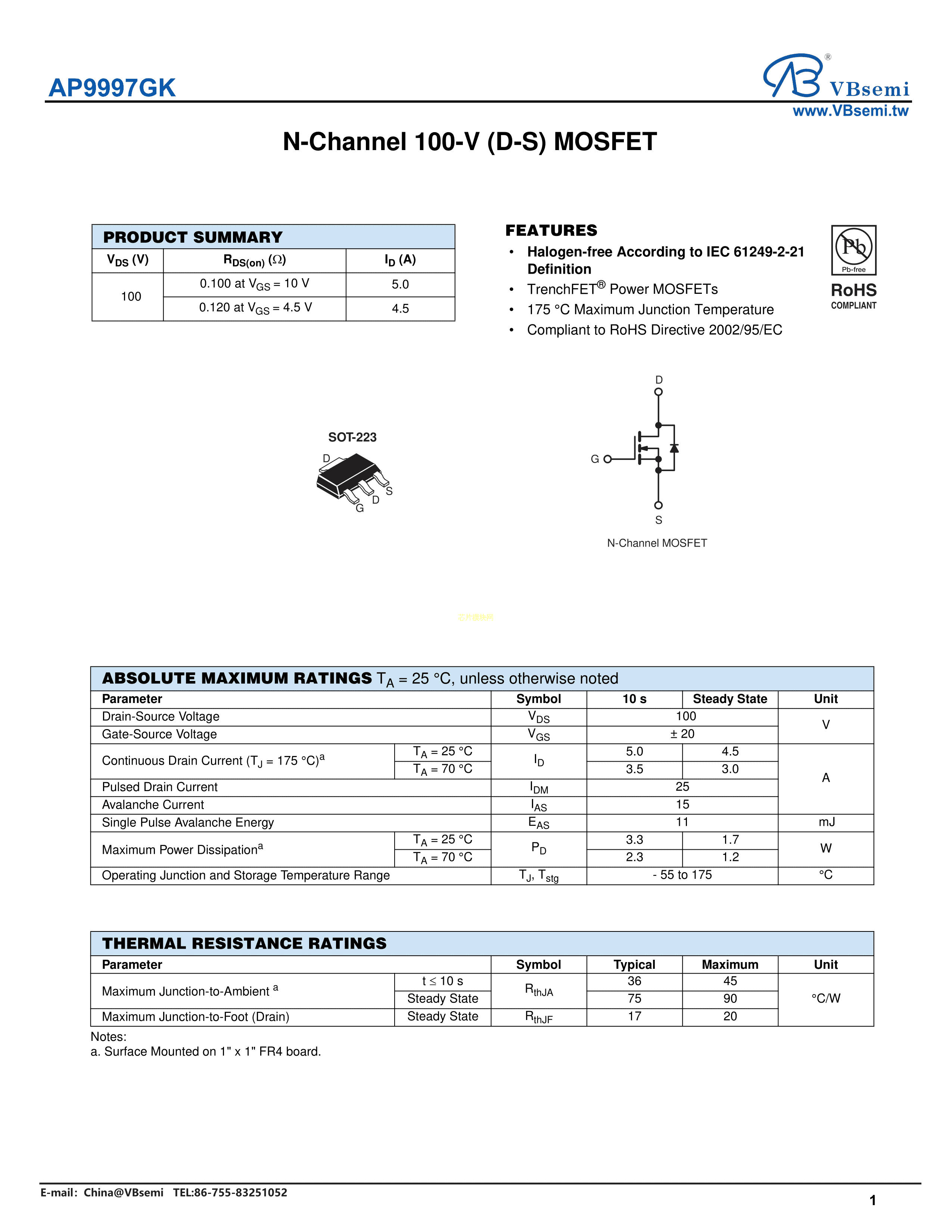 AP9997GK数据手册SOT-223-3封装VBsemi(台湾微碧)PDF规格书,中英文下载