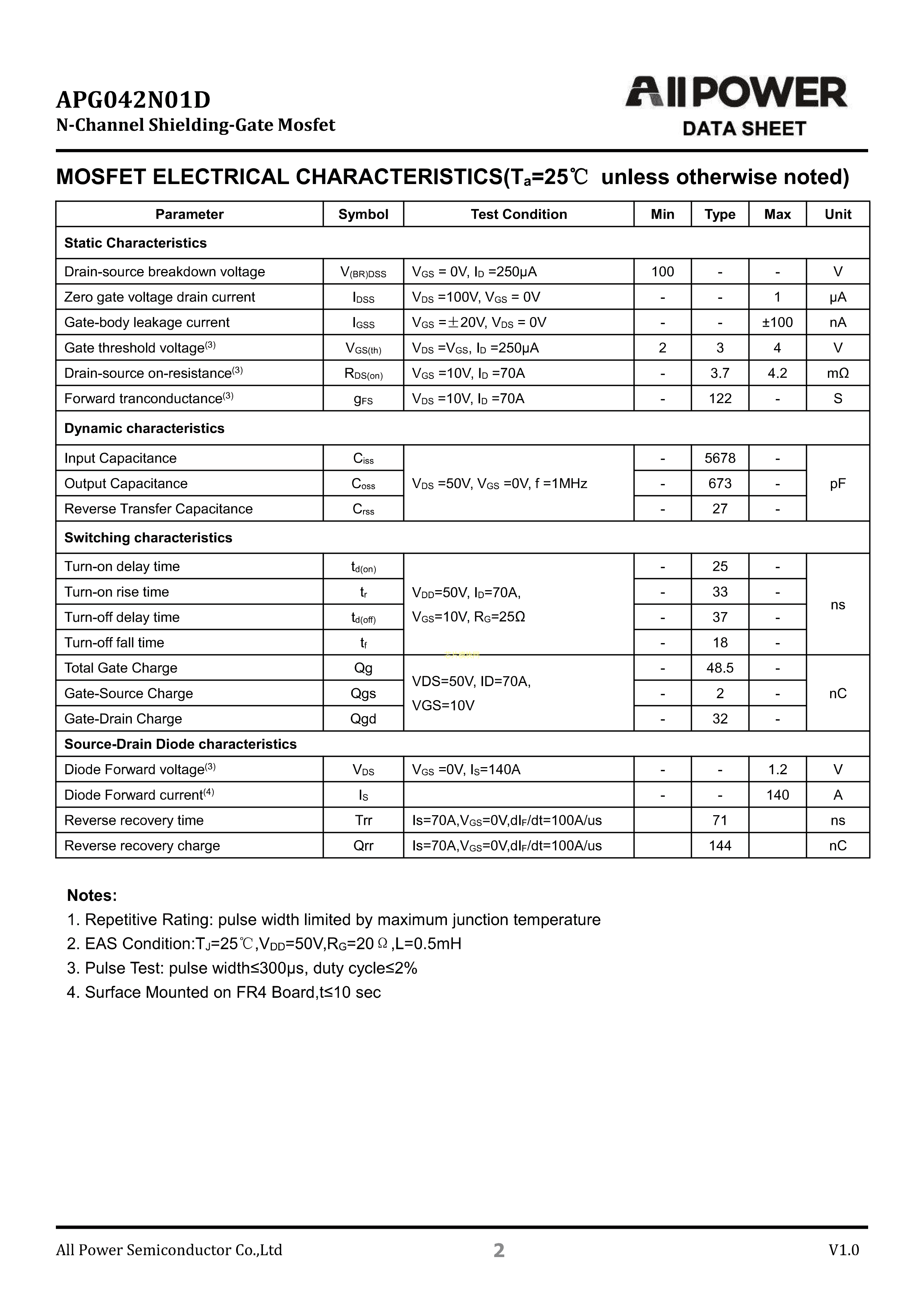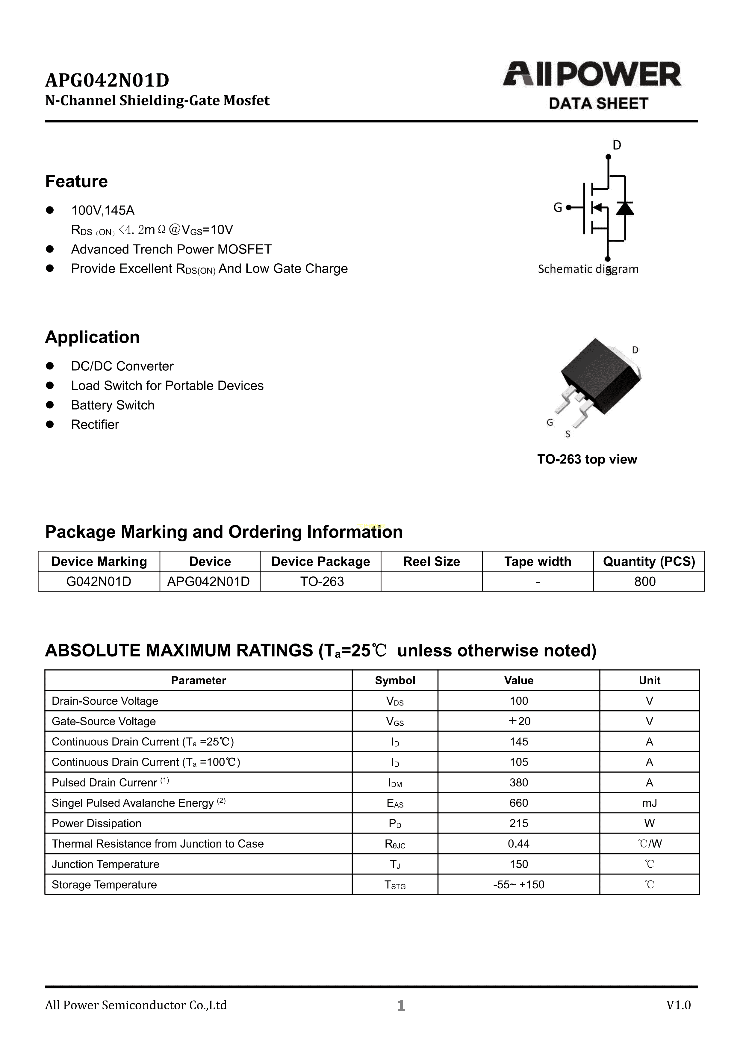 APG042N01D数据手册TO-263封装ALLPOWER(铨力)PDF规格书,中英文下载