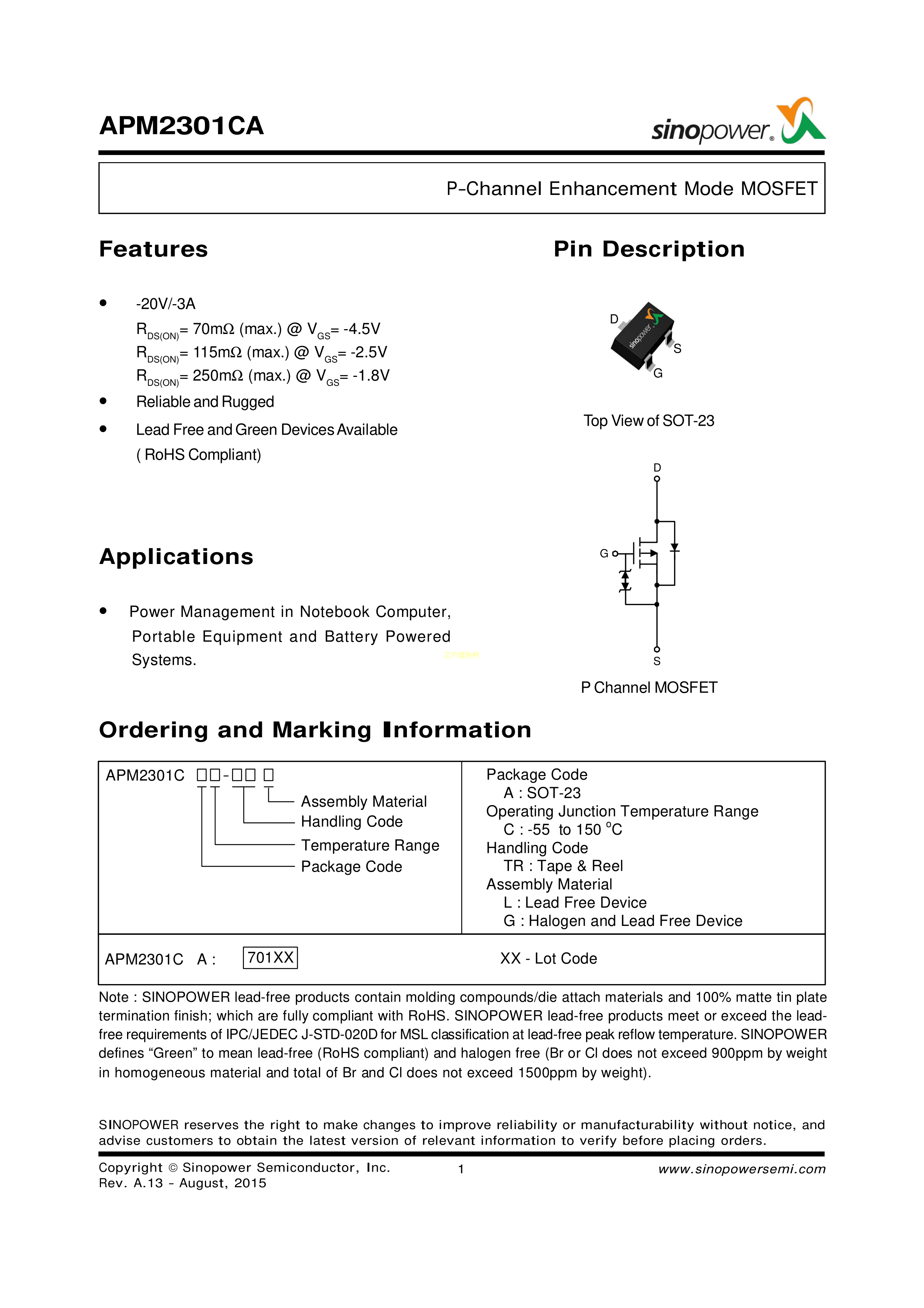 APM2301CAC-TRG数据手册SOT-23(SOT-23-3)封装Sinopower(大中)P