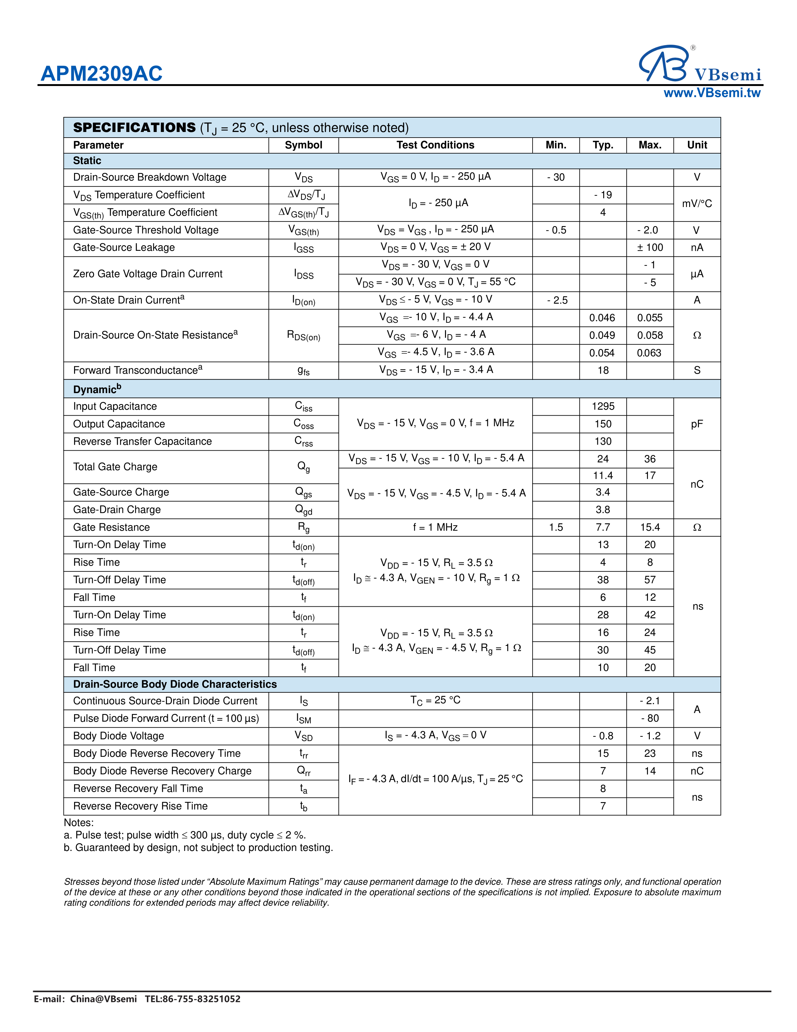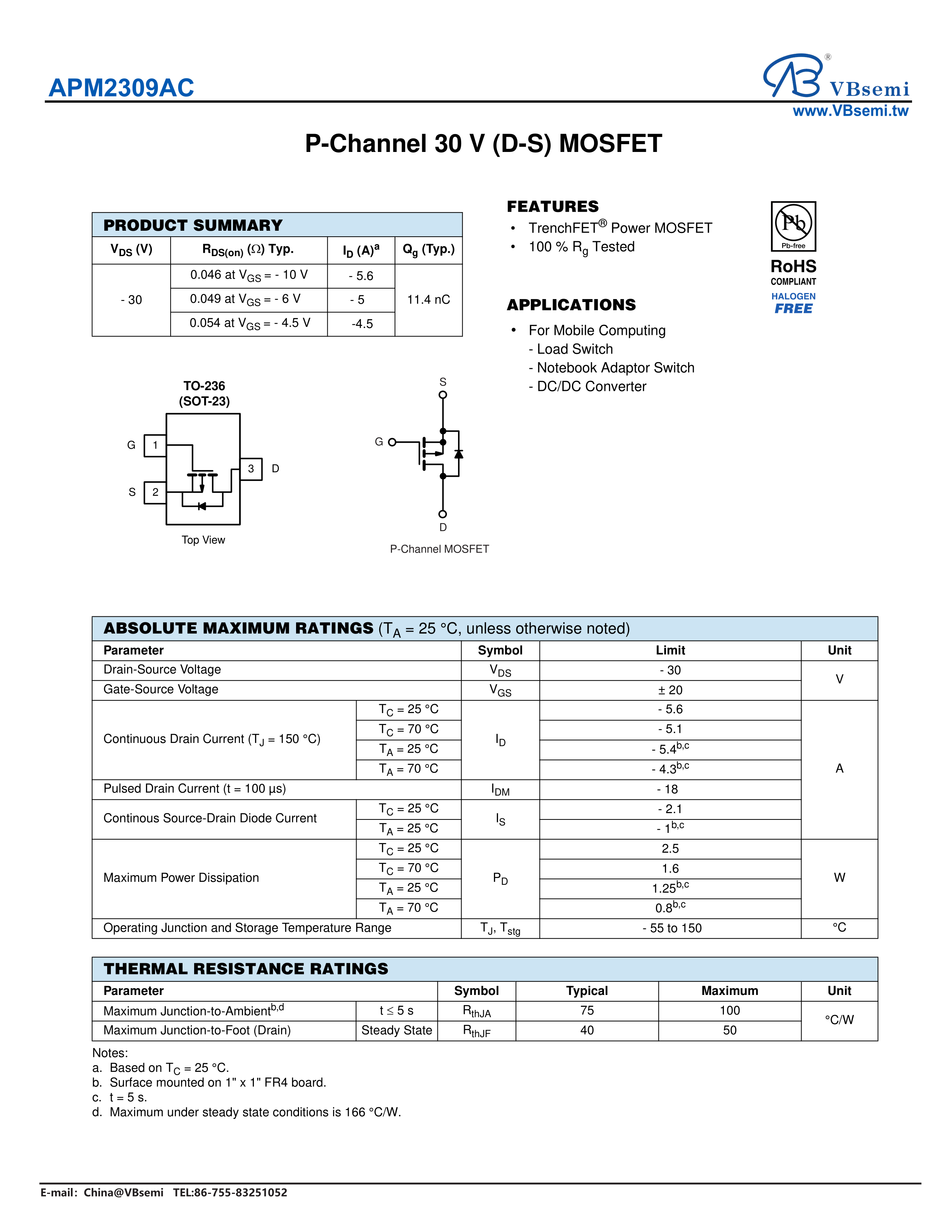 APM2309AC数据手册SOT-23-3封装VBsemi(台湾微碧)PDF规格书,中英文下载