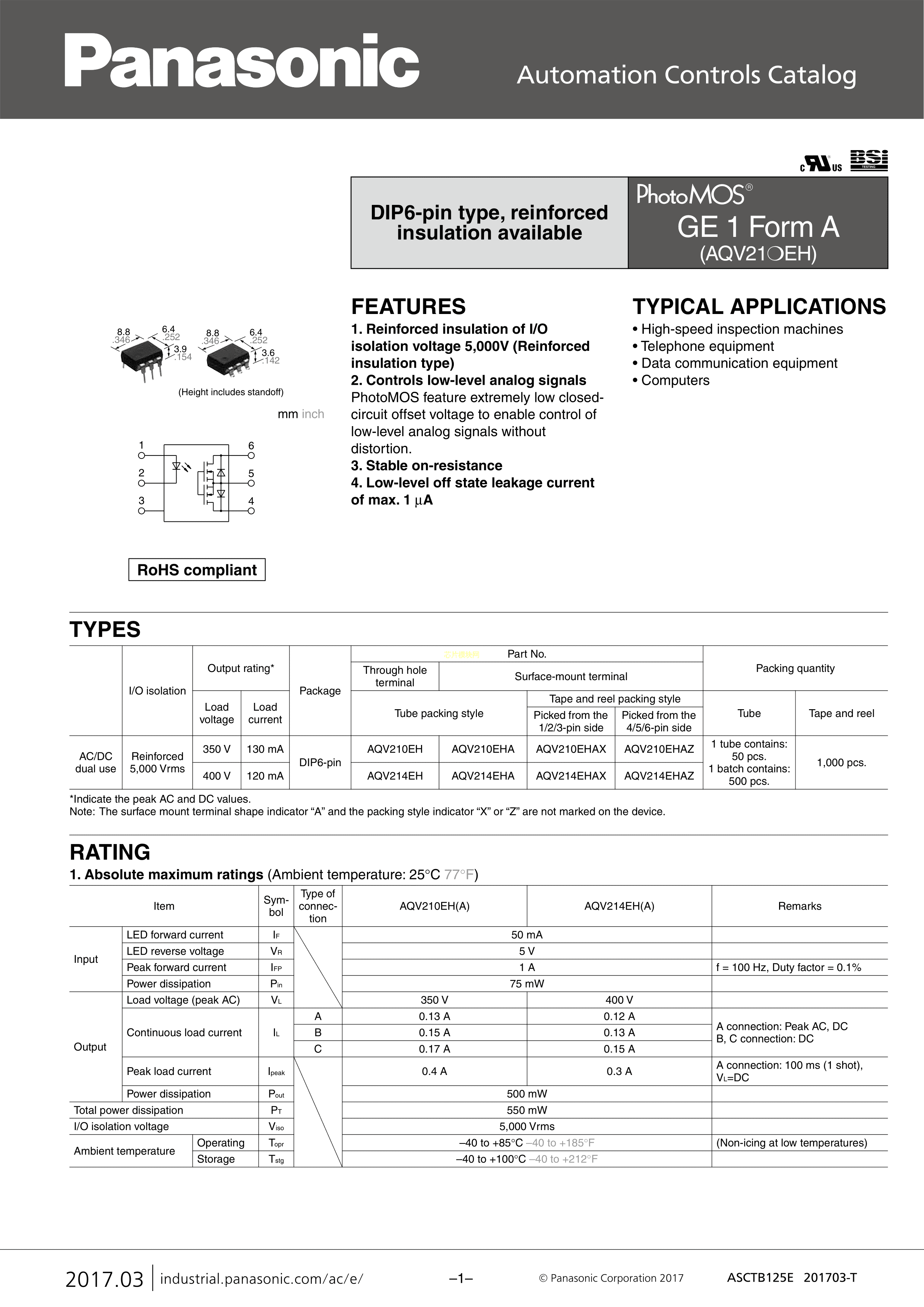 AQV210EAX数据手册DIP-6封装PANASONIC(松下)PDF规格书,中英文下载