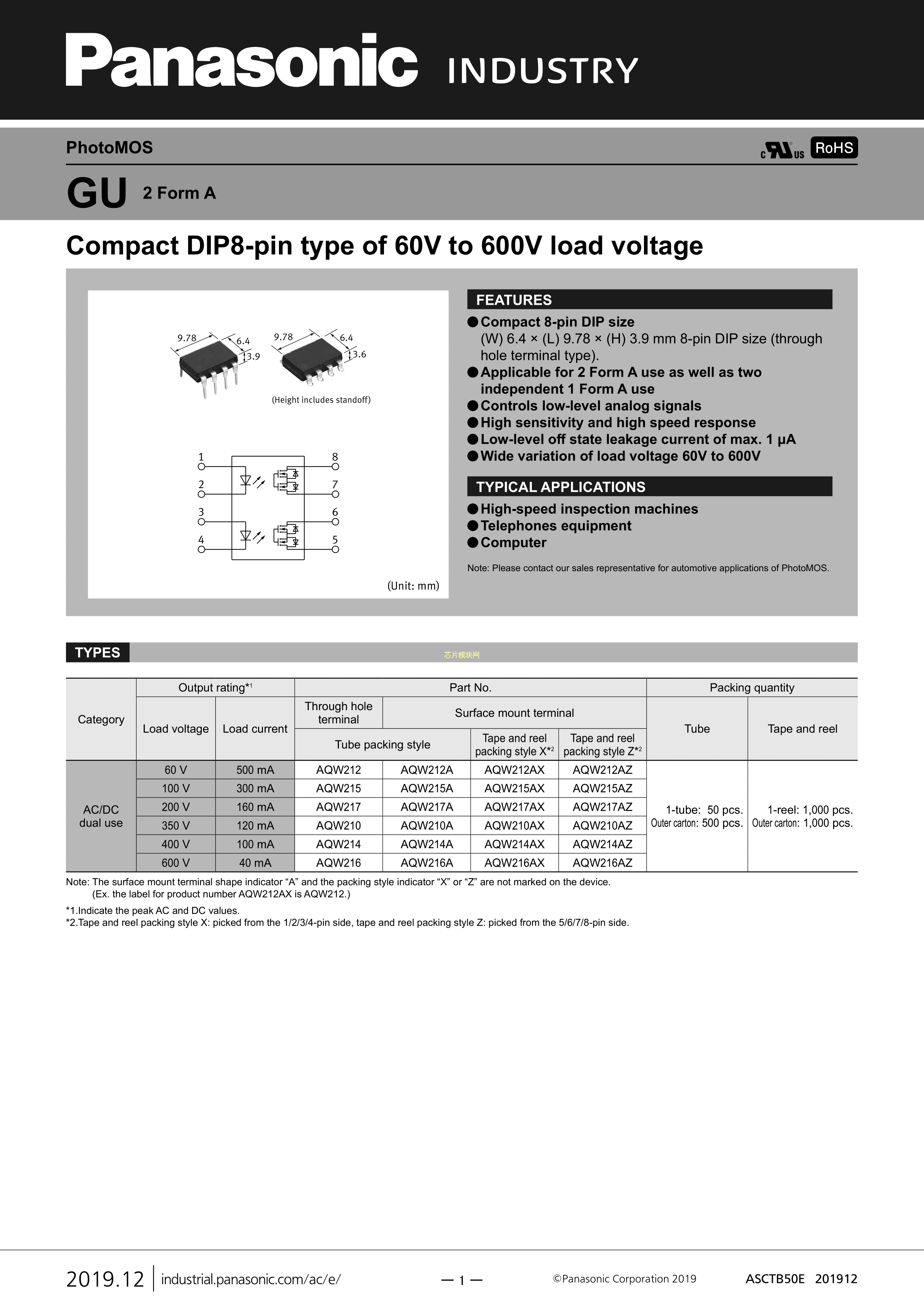 AQW215数据手册DIP-8封装PANASONIC(松下)PDF规格书,中英文下载