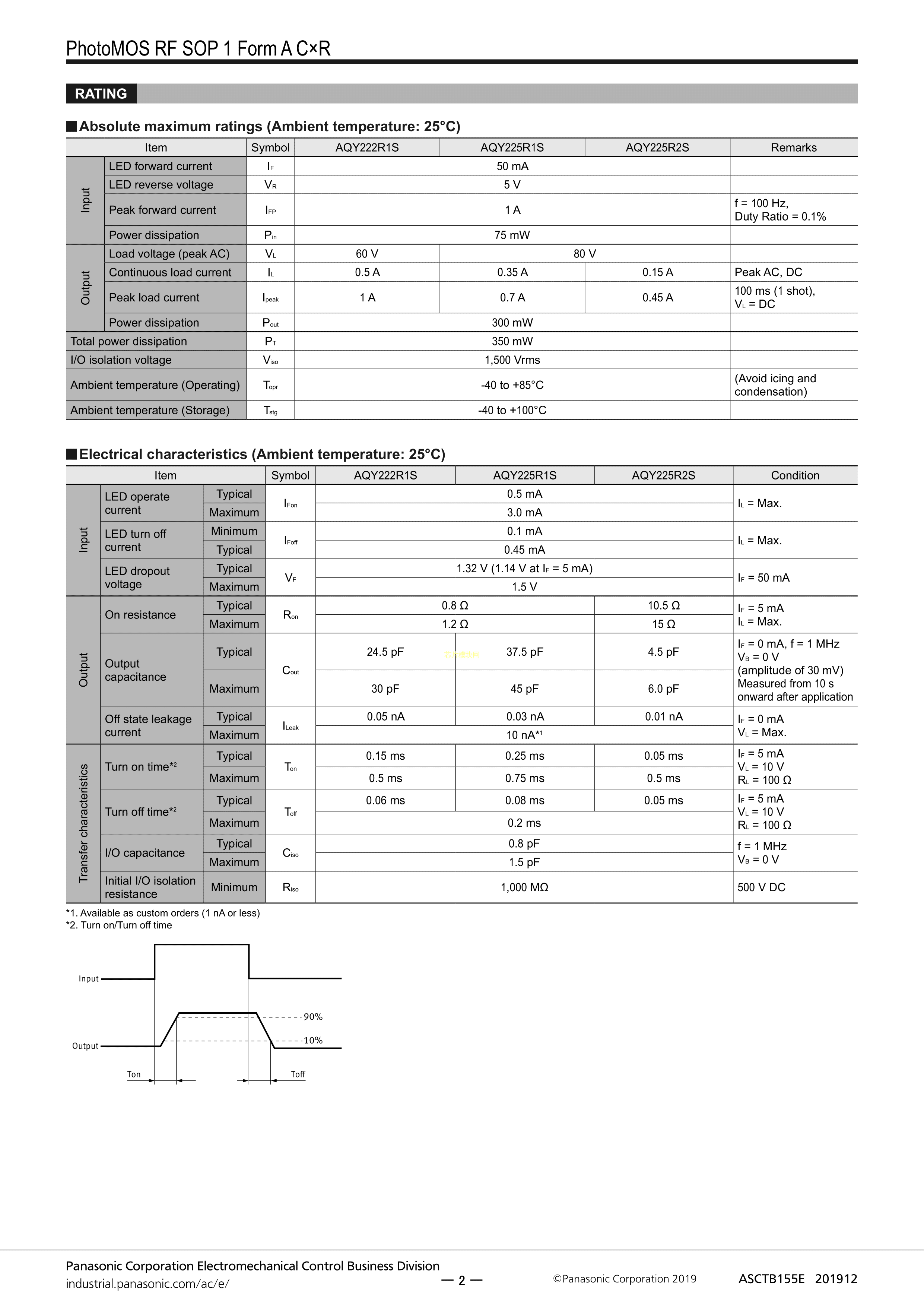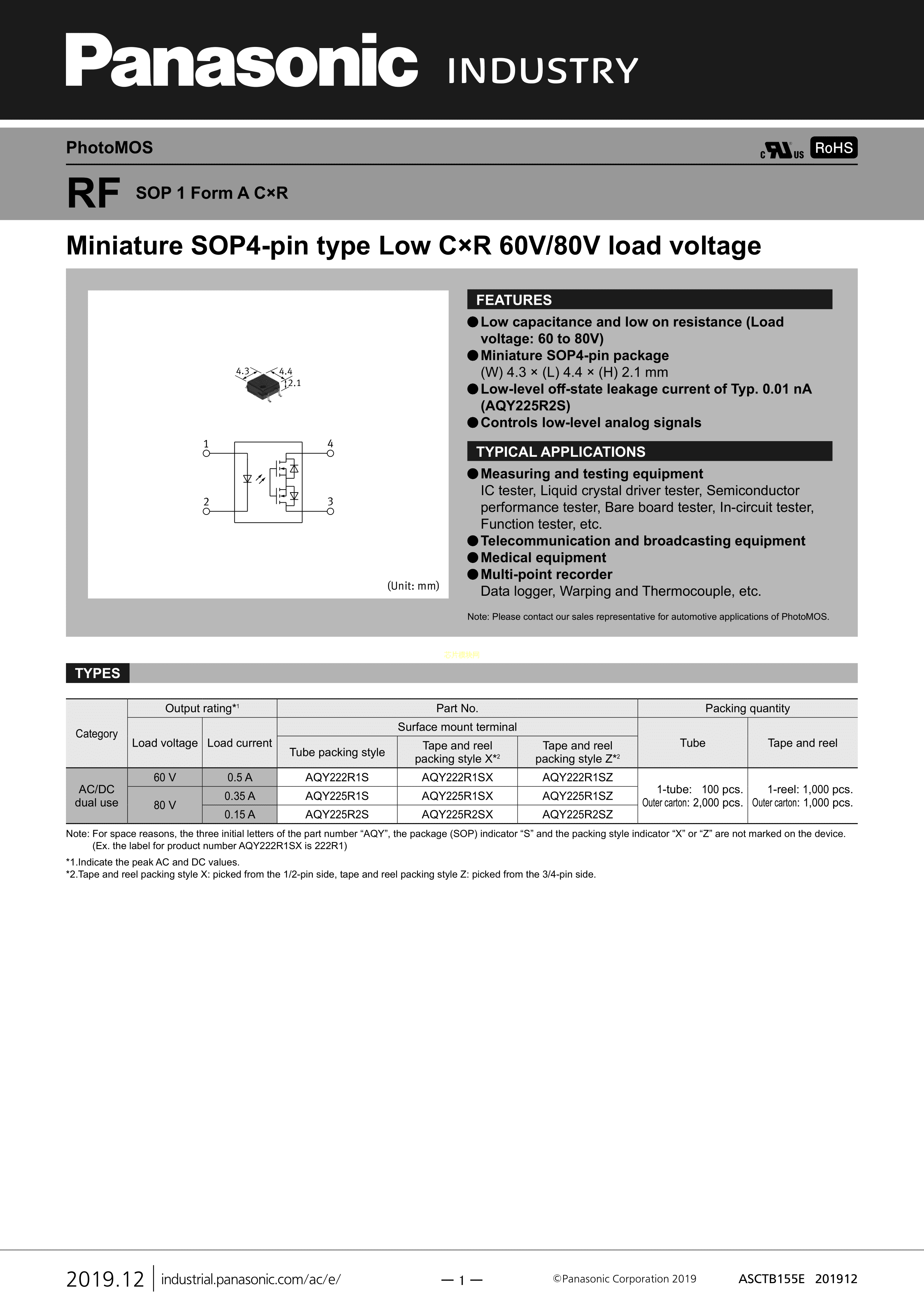 AQY225R1S数据手册SOP-4封装PANASONIC(松下)PDF规格书,中英文下载