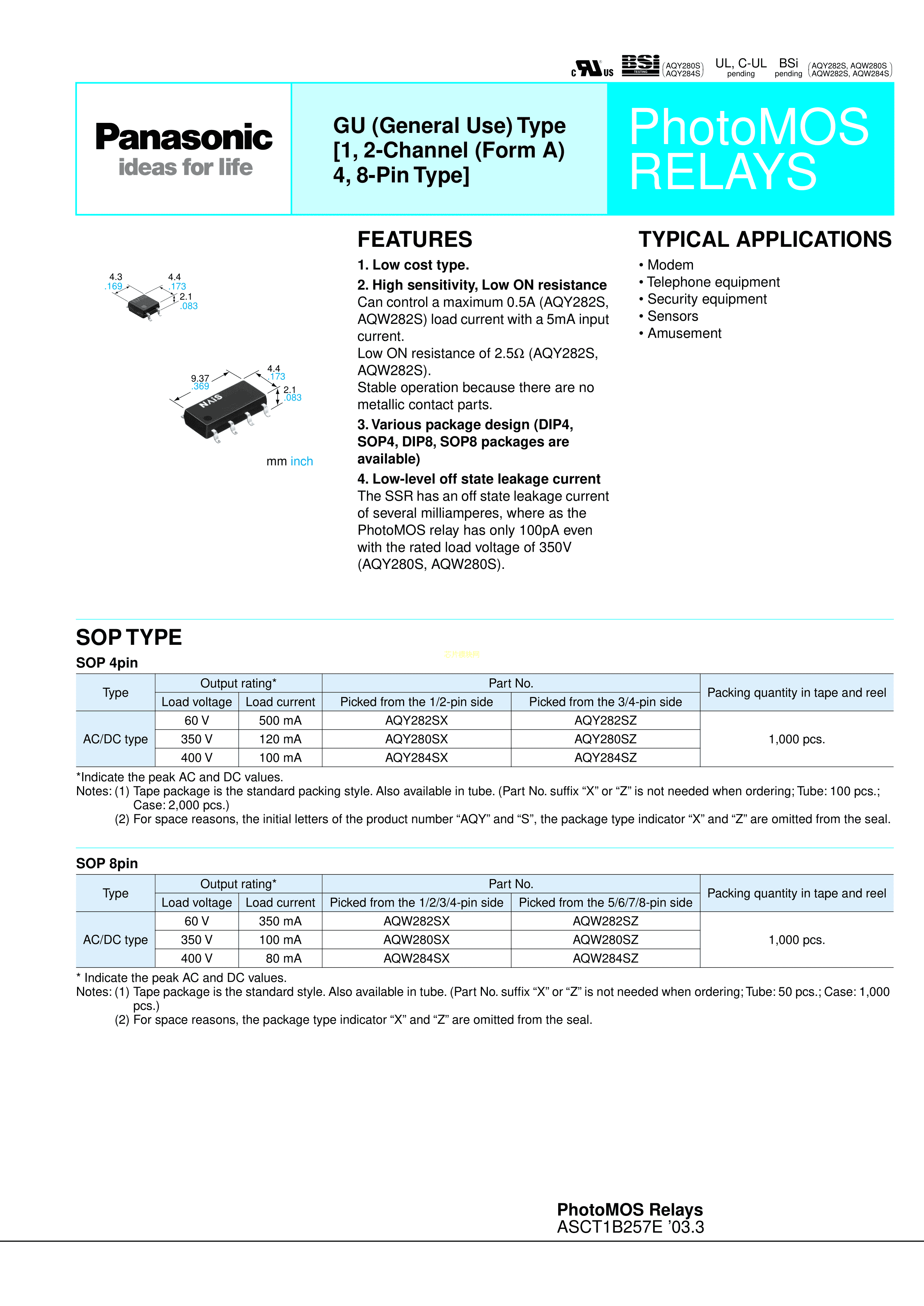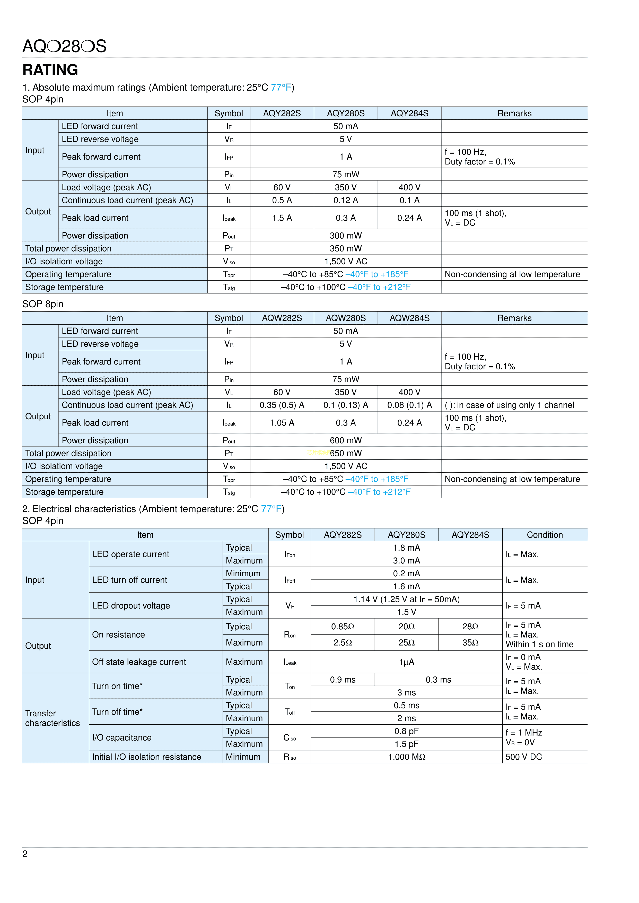 AQY282S数据手册SOP-4_2.54封装PANASONIC(松下)PDF规格书,中英文下载