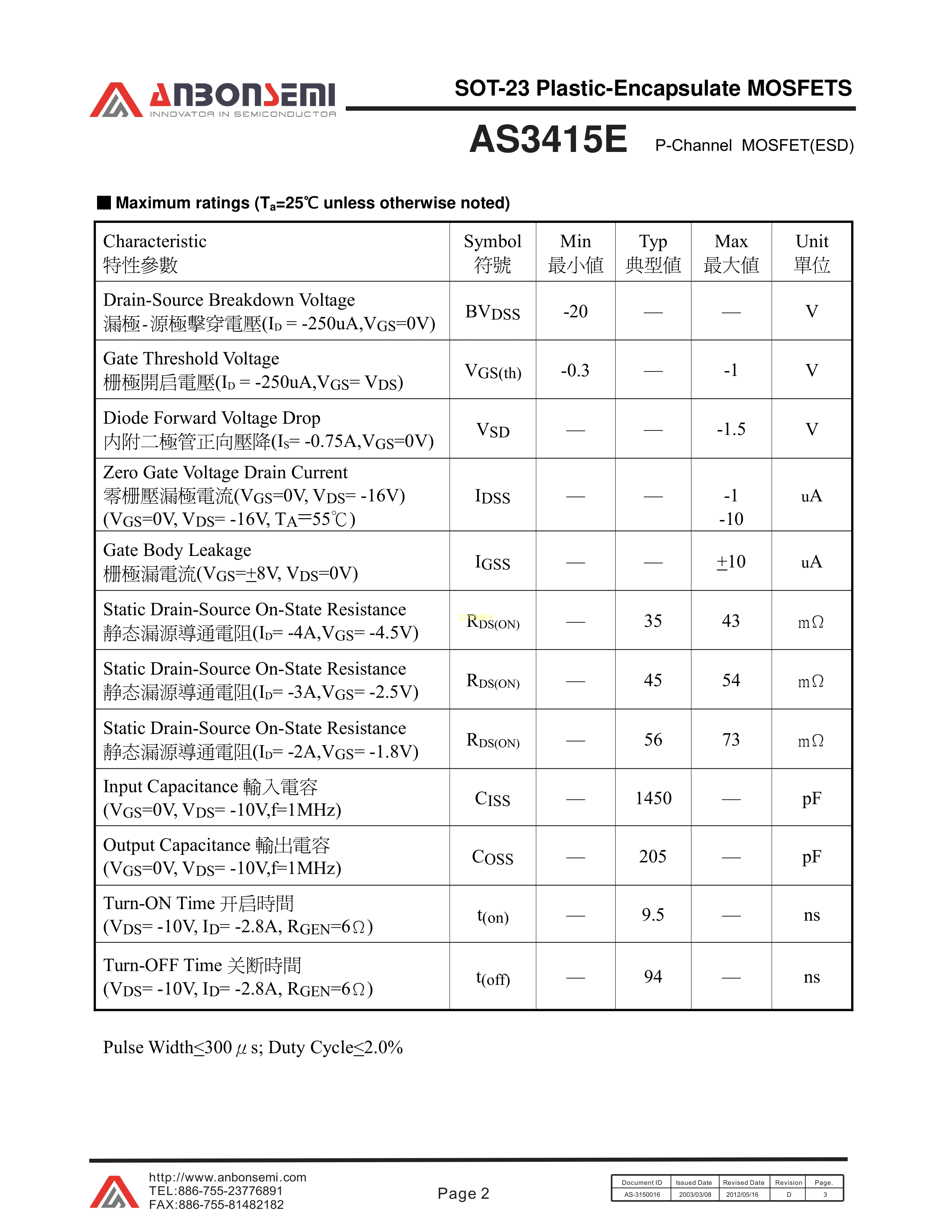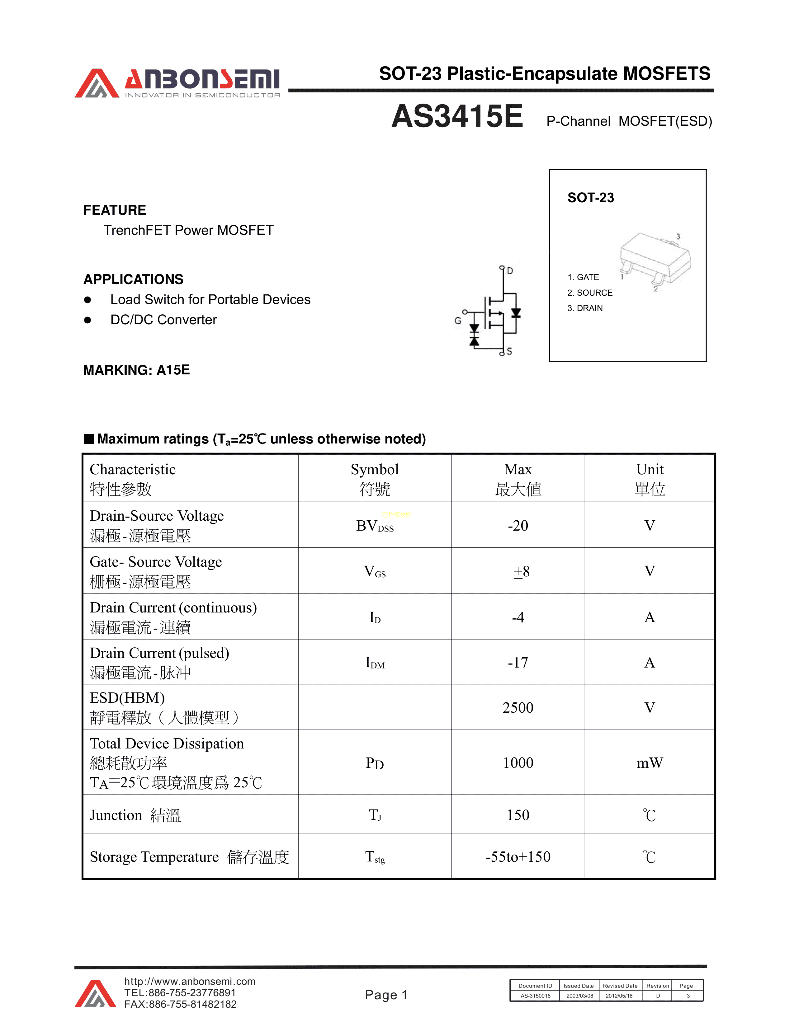 AS3415E数据手册SOT-23(SOT-23-3)封装FMS(台湾美丽微)PDF规格书,中英文下