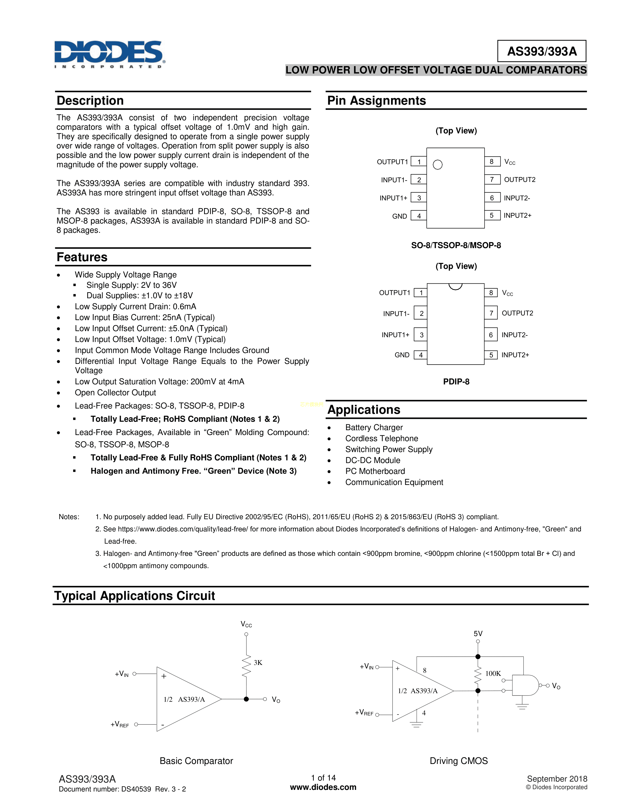 AS393P-E1数据手册PDIP-8封装DIODES(美台)PDF规格书,中英文下载