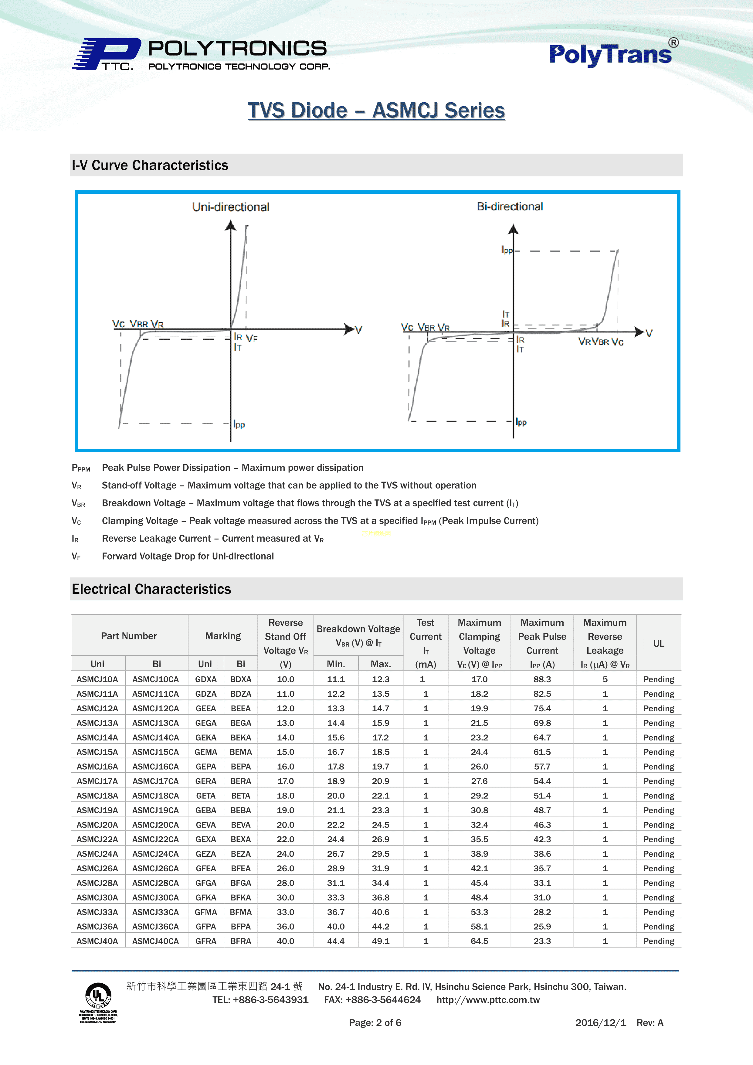 ASMCJ24CA数据手册SMCJ封装PTTC(聚鼎)PDF规格书,中英文下载