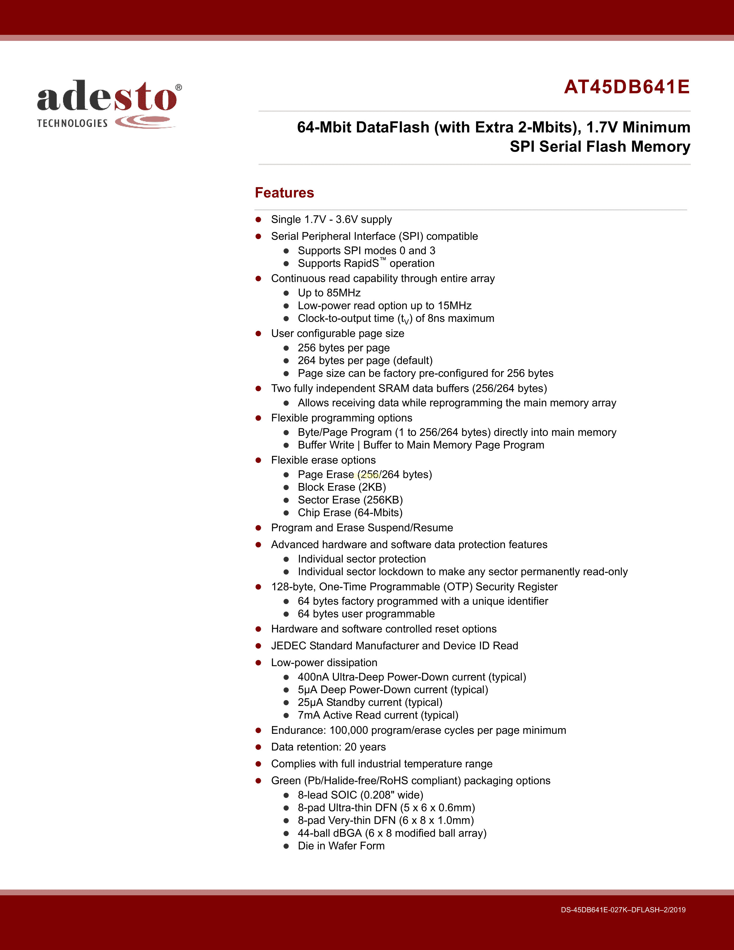 AT45DB641E-MWHN-Y数据手册VDFN-8(6x8)封装AdestoPDF规格书,中英文下载