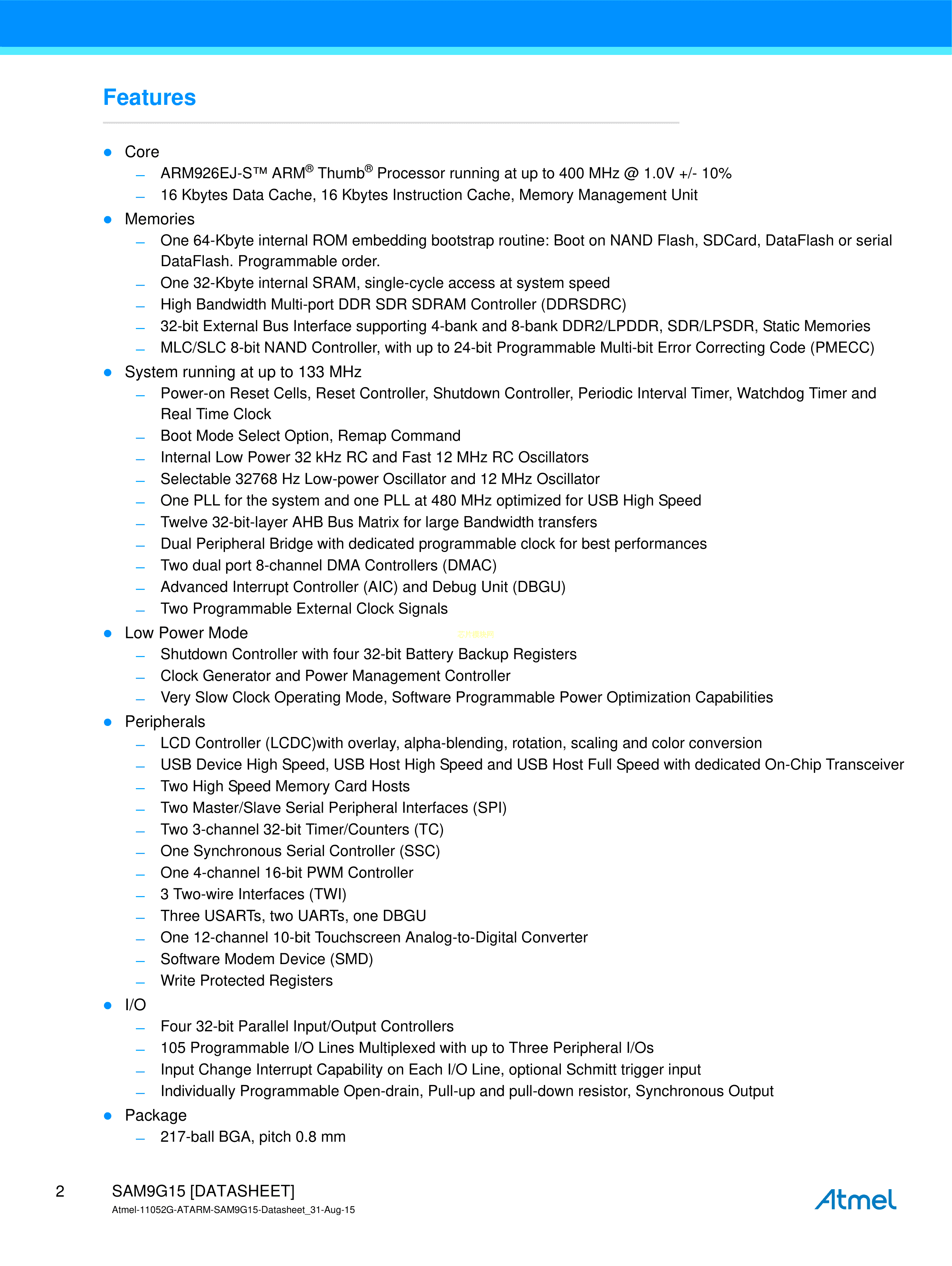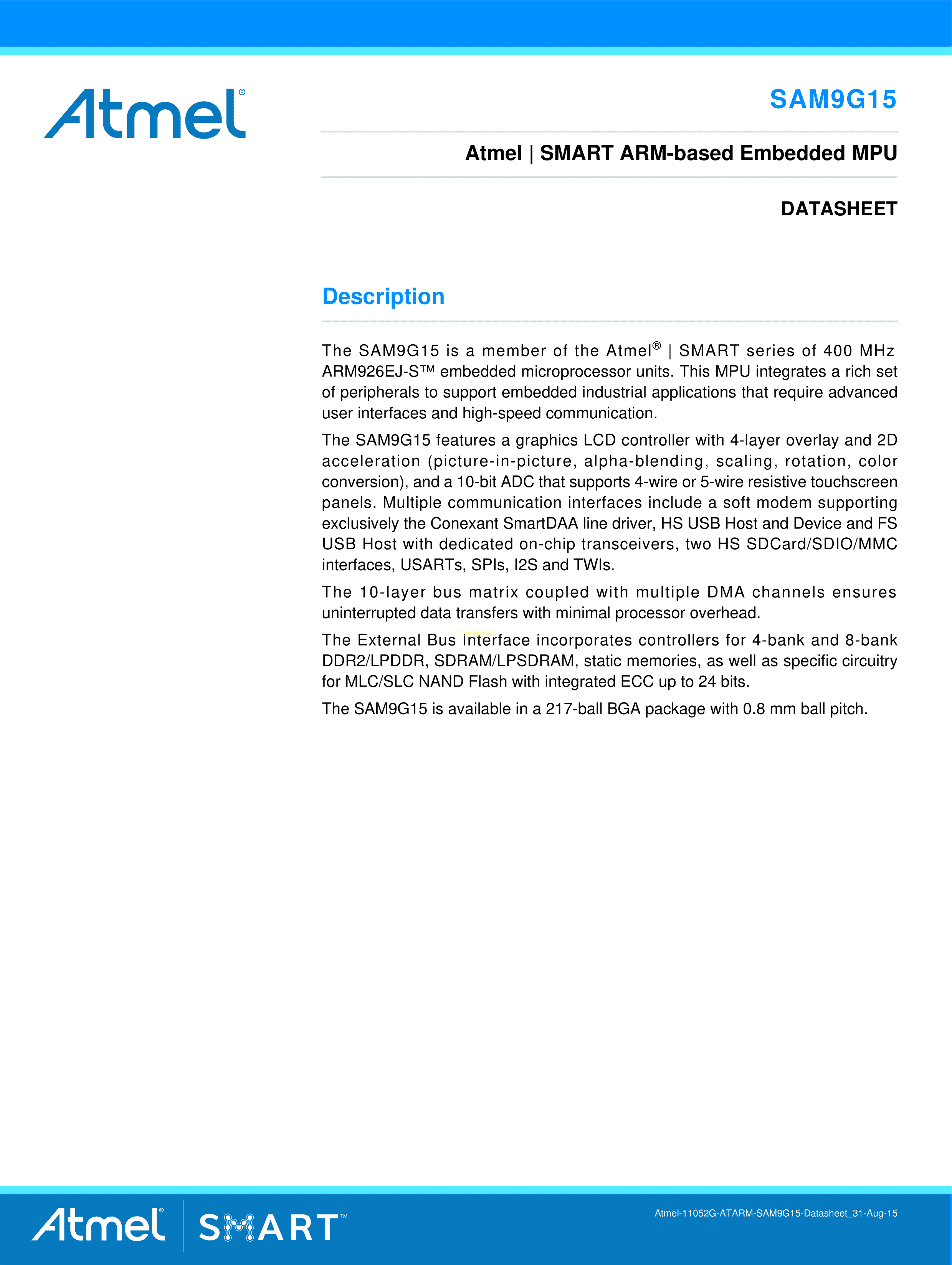 AT91SAM9G15-CU数据手册BGA-217封装MICROCHIP(美国微芯)PDF规格书,中英文下载