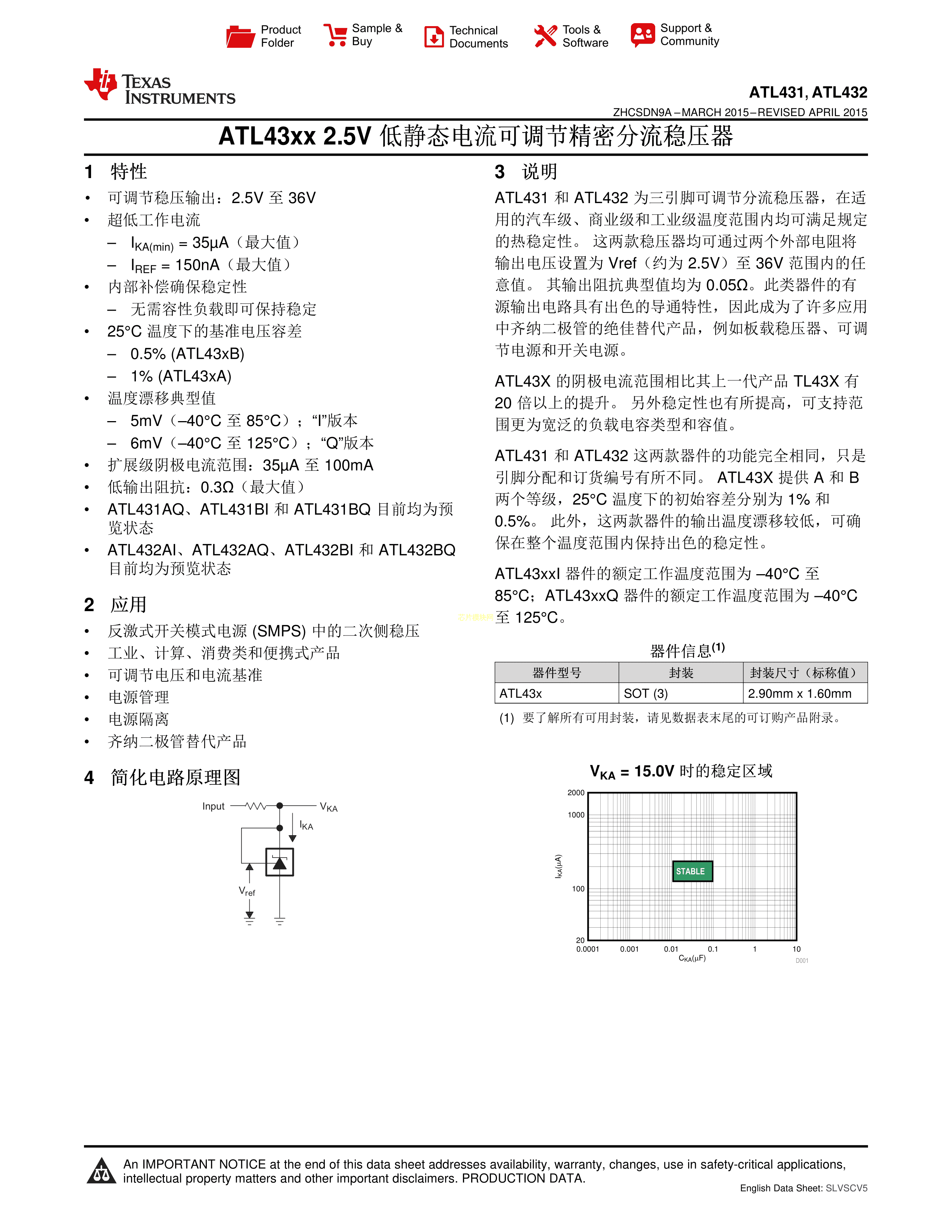 ATL431AIDBZR数据手册SOT-23(SOT-23-3)封装TI(德州仪器)PDF规格书,中