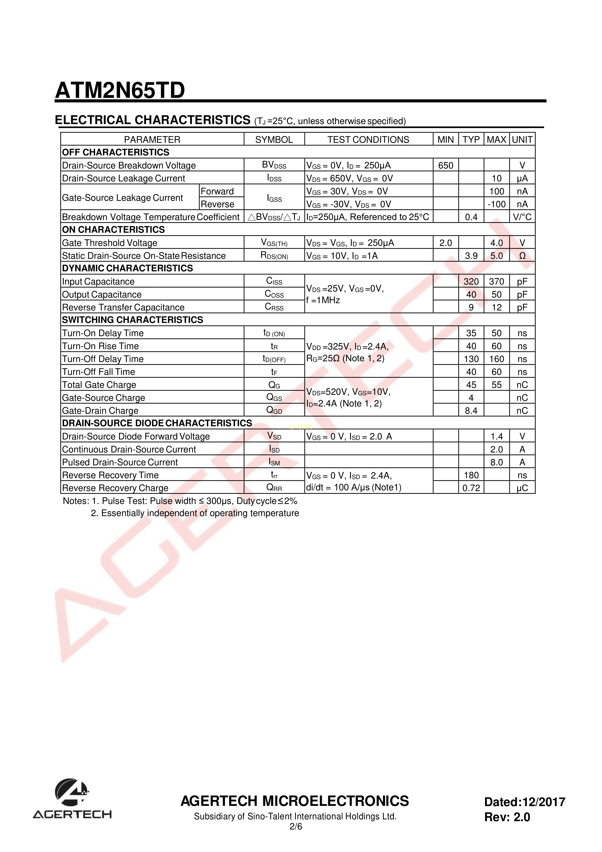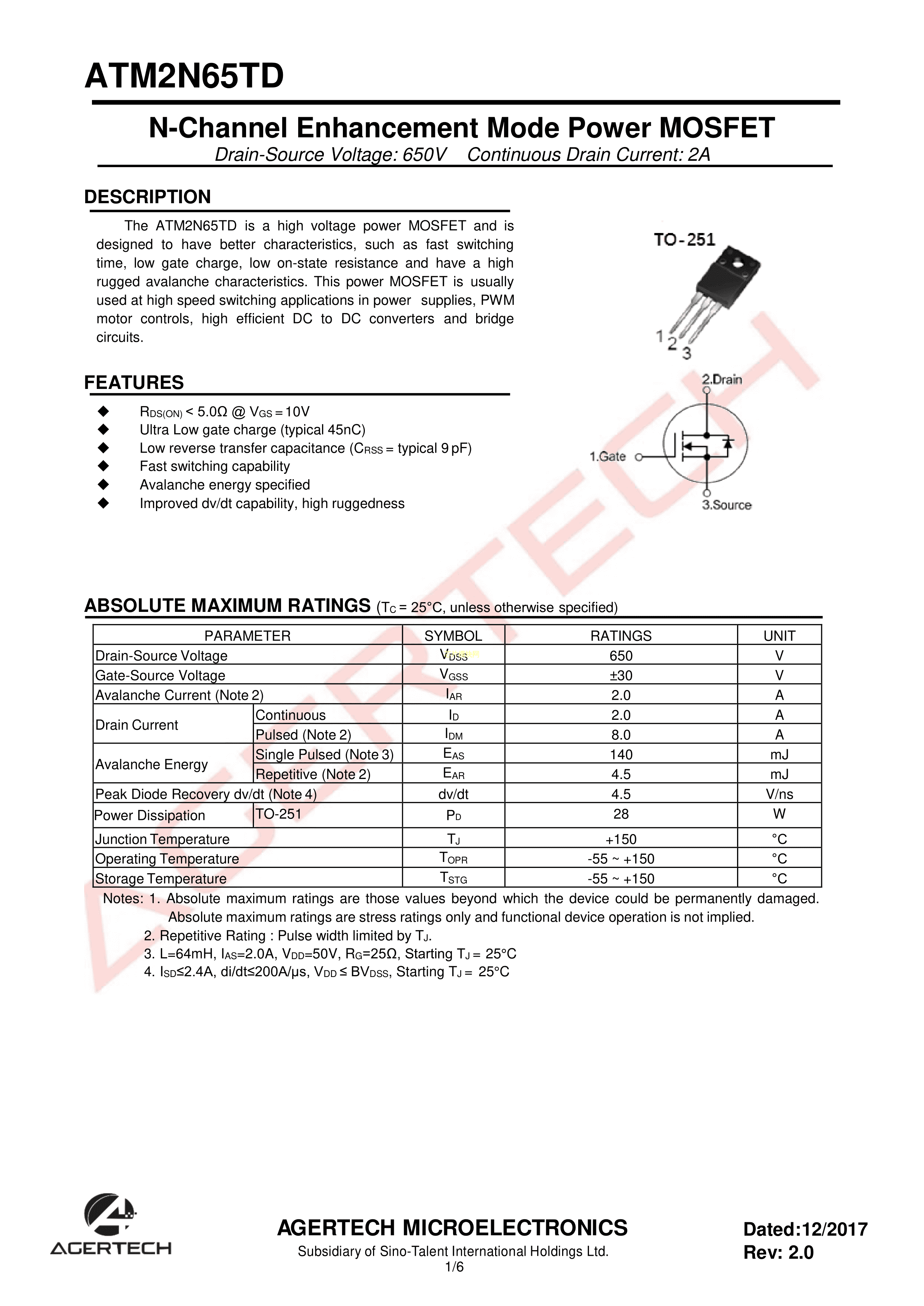 ATM2N65TD数据手册TO-251封装Agertech(艾吉芯)PDF规格书,中英文下载