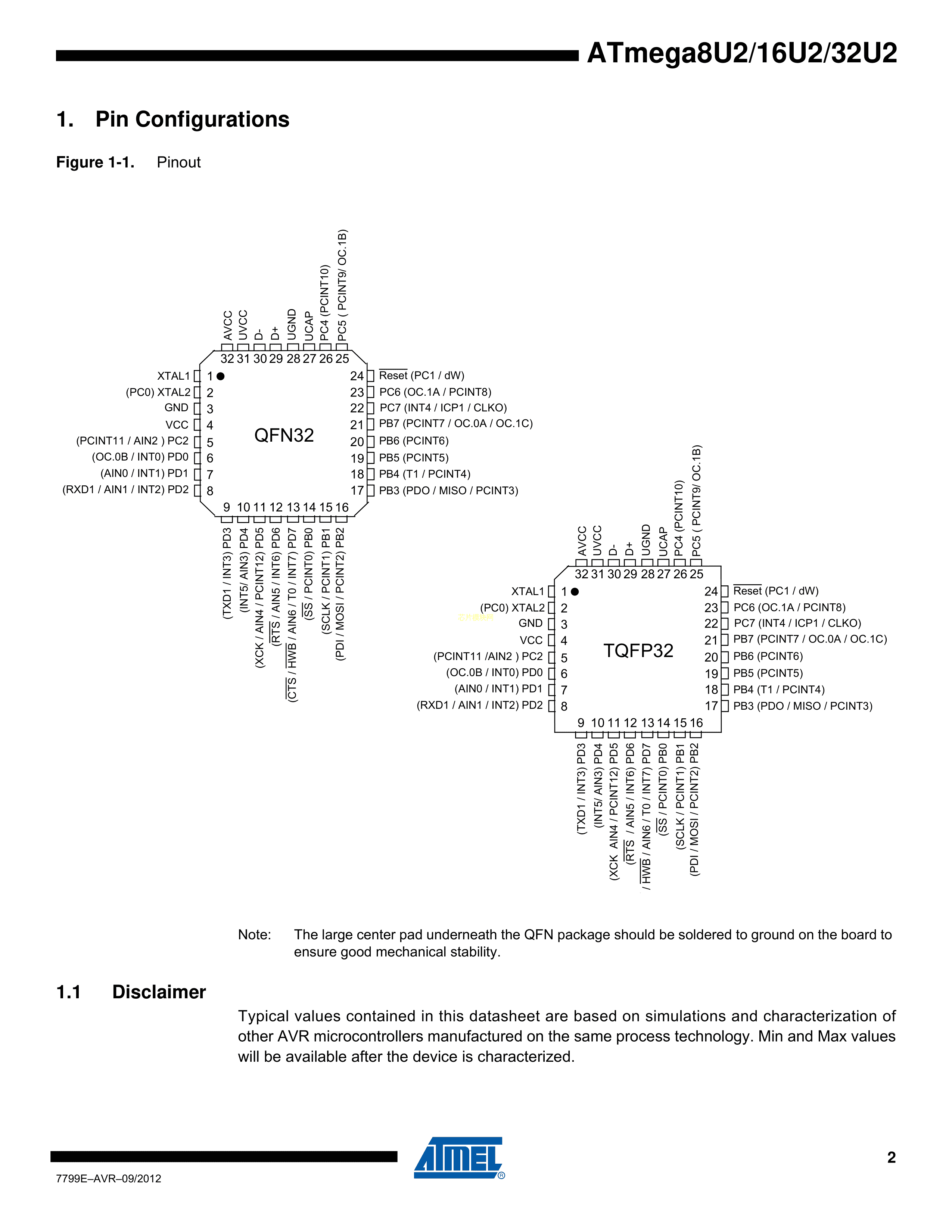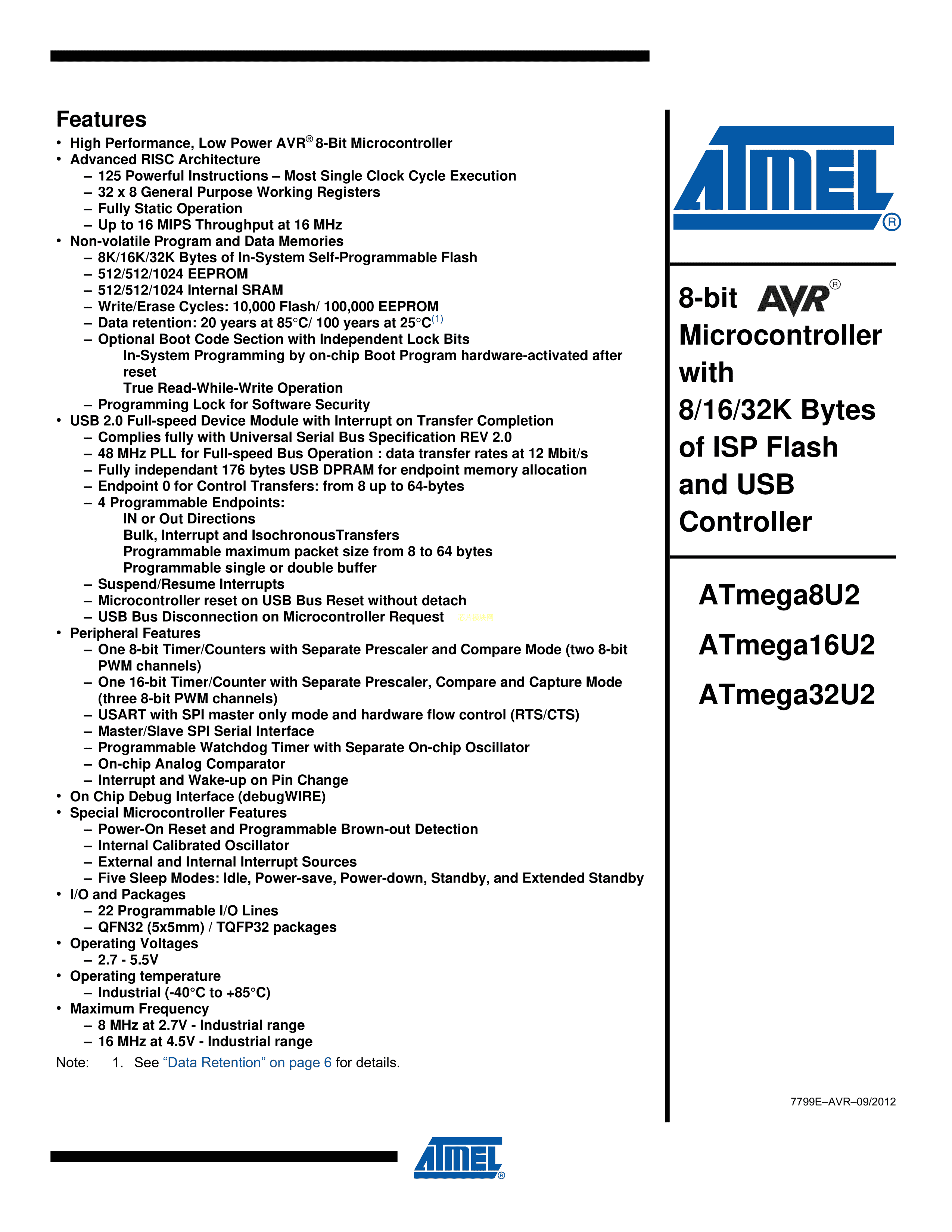 ATMEGA16U2-AU数据手册TQFP-32_7x7x08P封装MICROCHIP(美国微芯)P