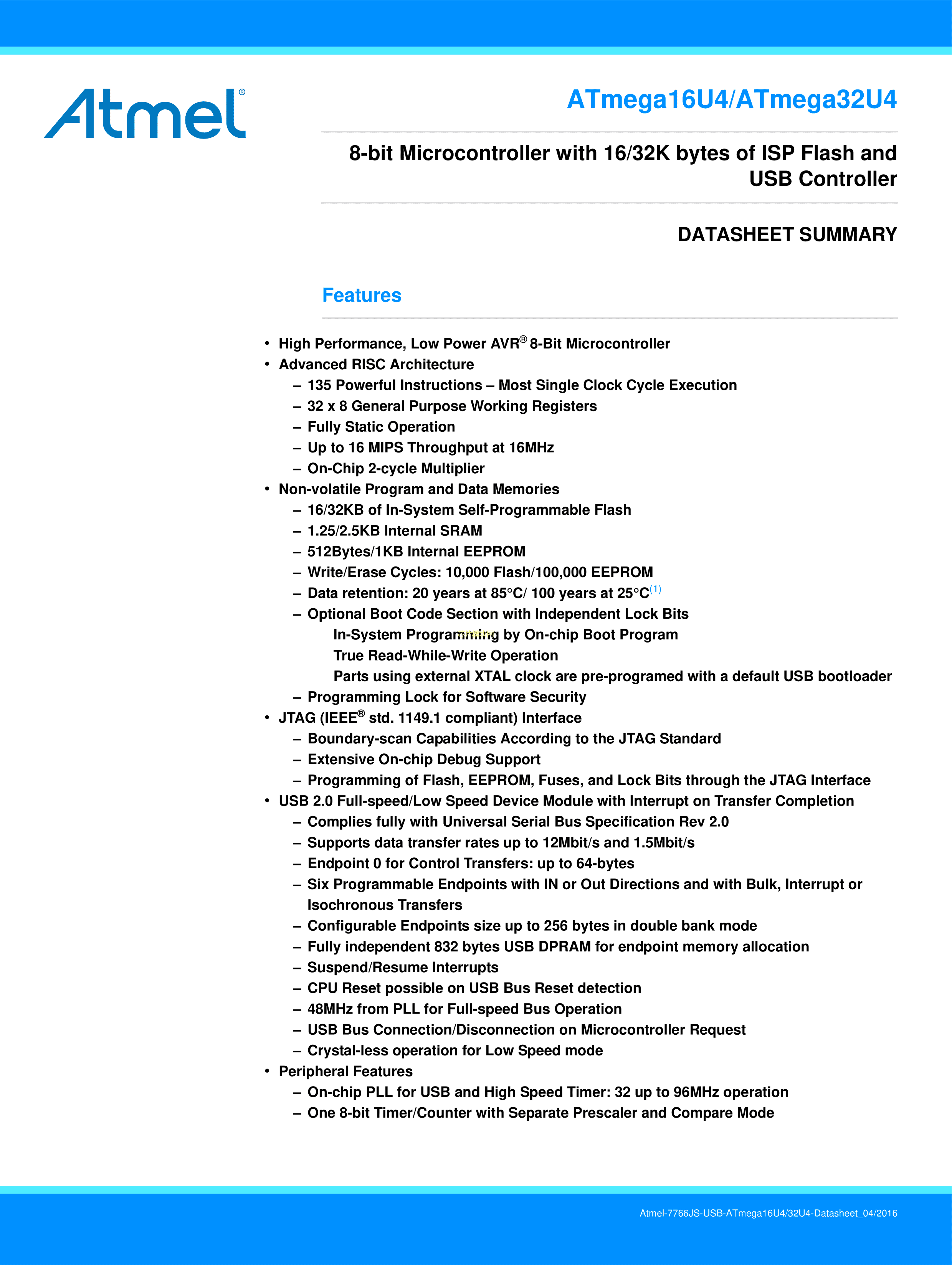ATMEGA32U4RC-MU数据手册VQFN-44封装MICROCHIP(美国微芯)PDF规格书,