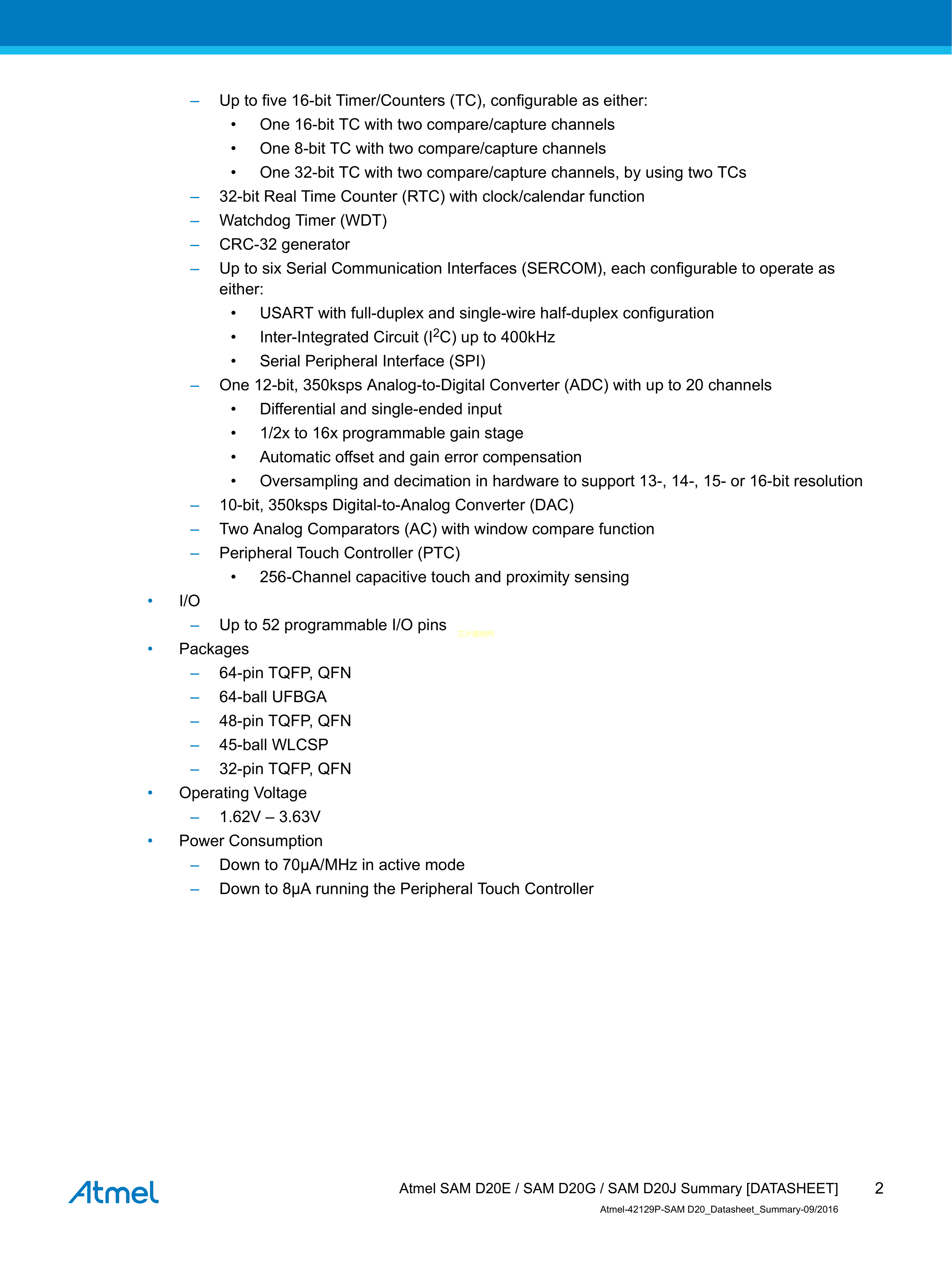 ATSAMD20G16A-ANT数据手册TQFP-48(7x7)封装MICROCHIP(美国微芯)P
