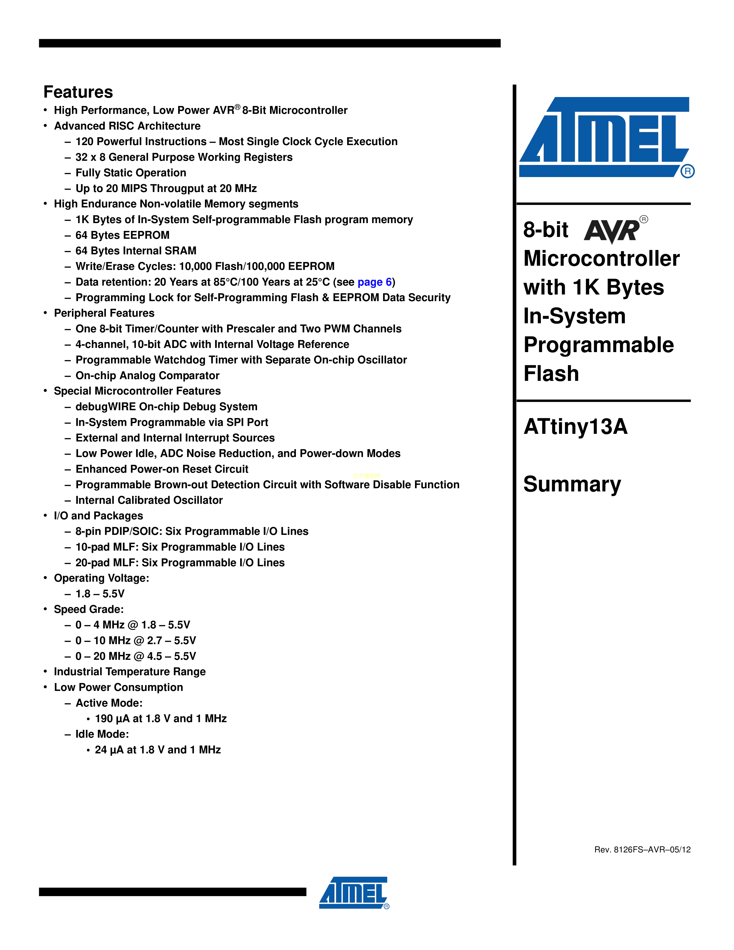 ATTINY13A-SSU数据手册SOIC-8_150mil封装MICROCHIP(美国微芯)PDF