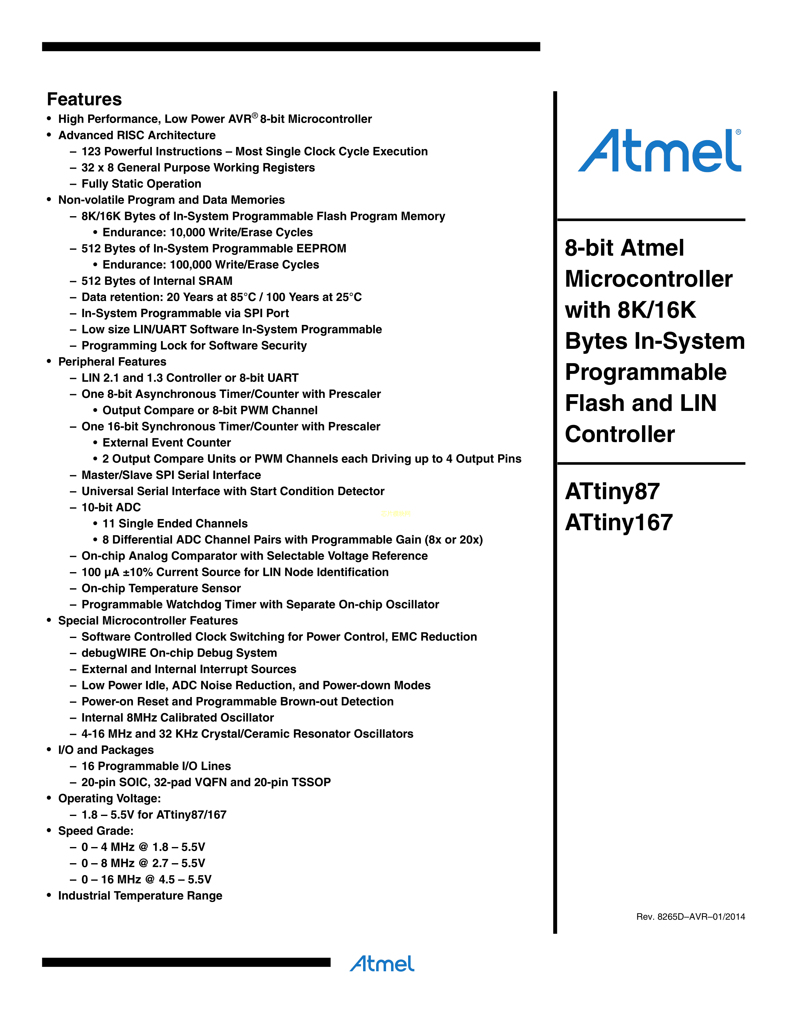 ATTINY167-XU数据手册TSSOP-20封装MICROCHIP(美国微芯)PDF规格书,中英文下载