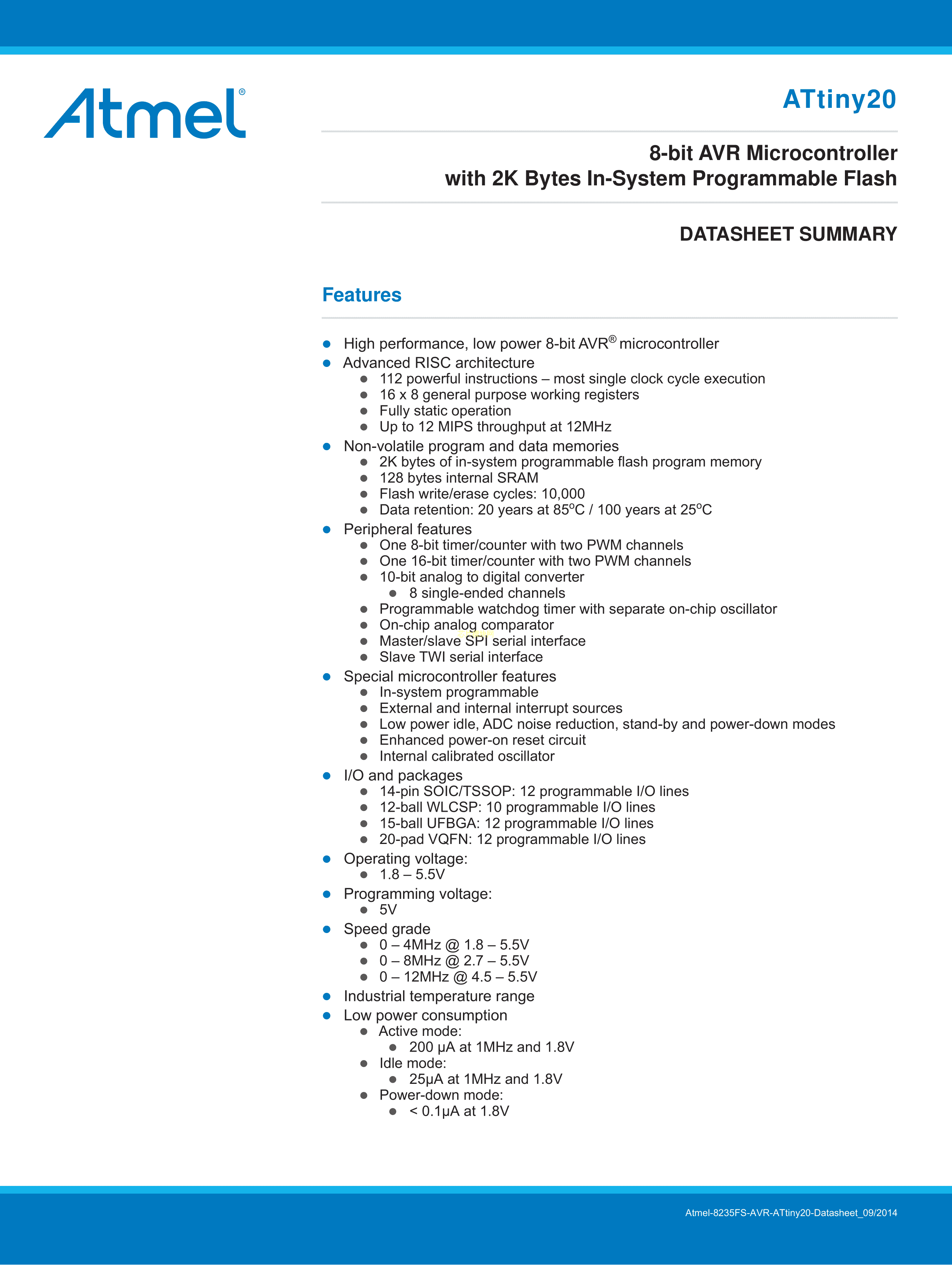 ATTINY20-SSUR数据手册SOIC-14封装MICROCHIP(美国微芯)PDF规格书,中英