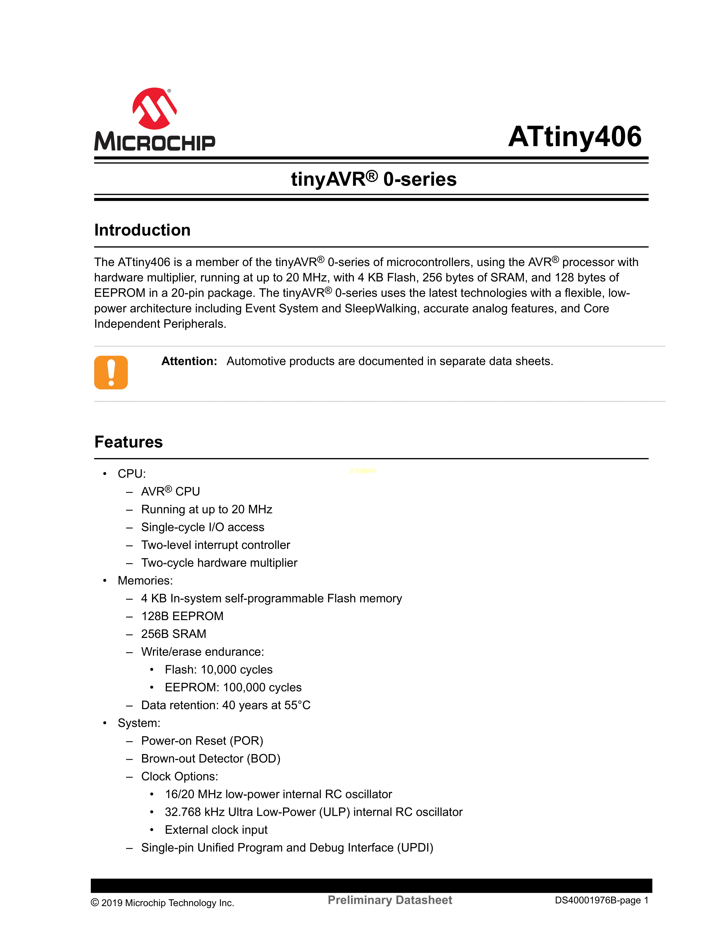ATTINY406-SN数据手册SOIC-20封装MICROCHIP(美国微芯)PDF规格书,中英文