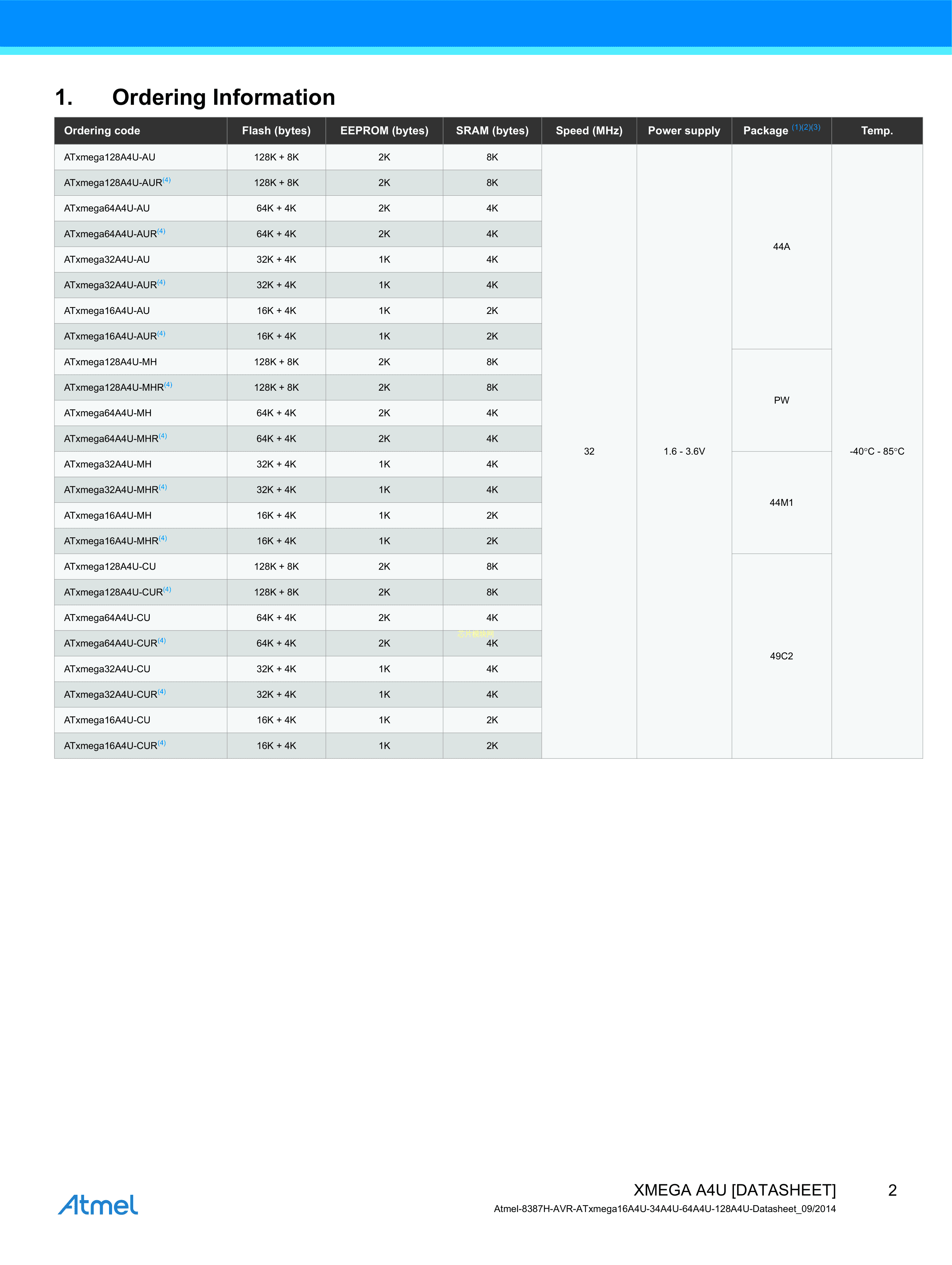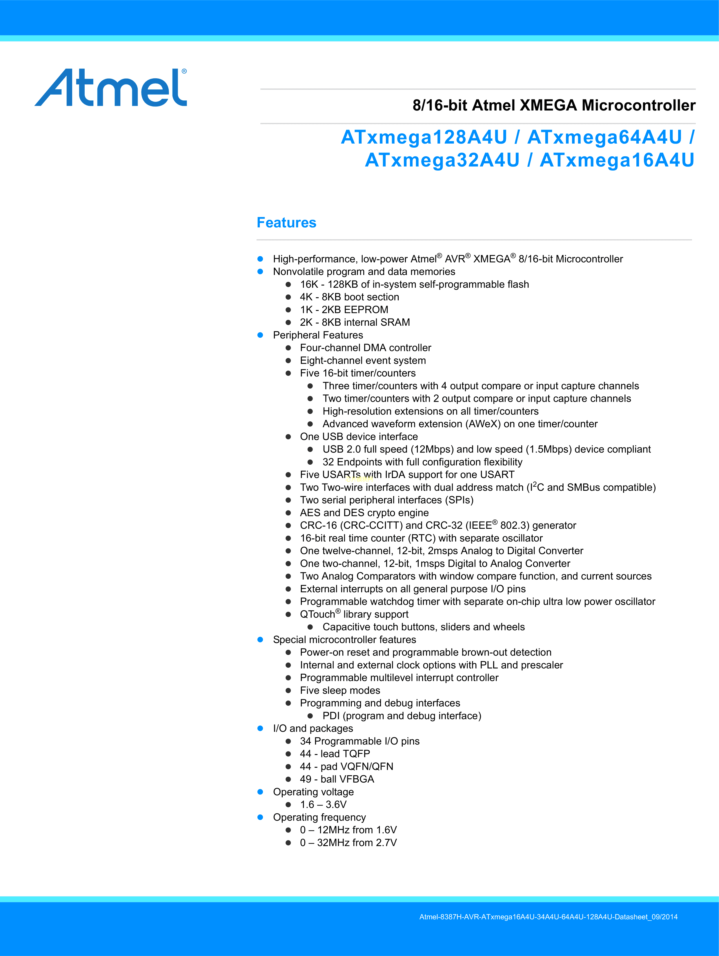 ATXMEGA16A4U-AU数据手册TQFP-44封装MICROCHIP(美国微芯)PDF规格书,