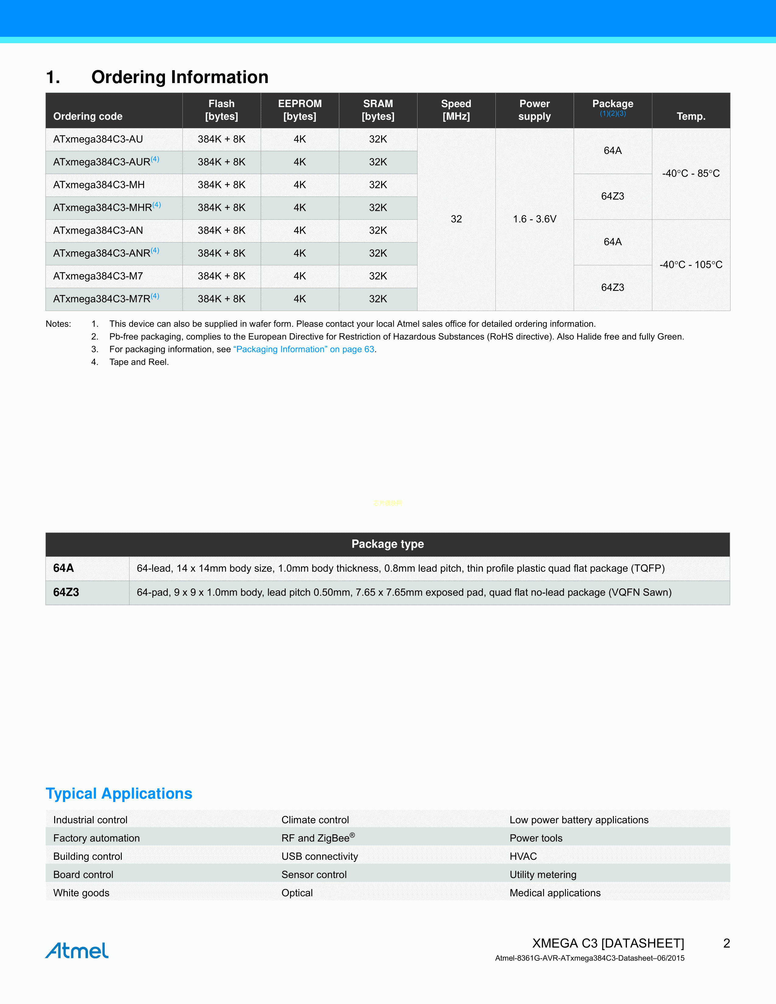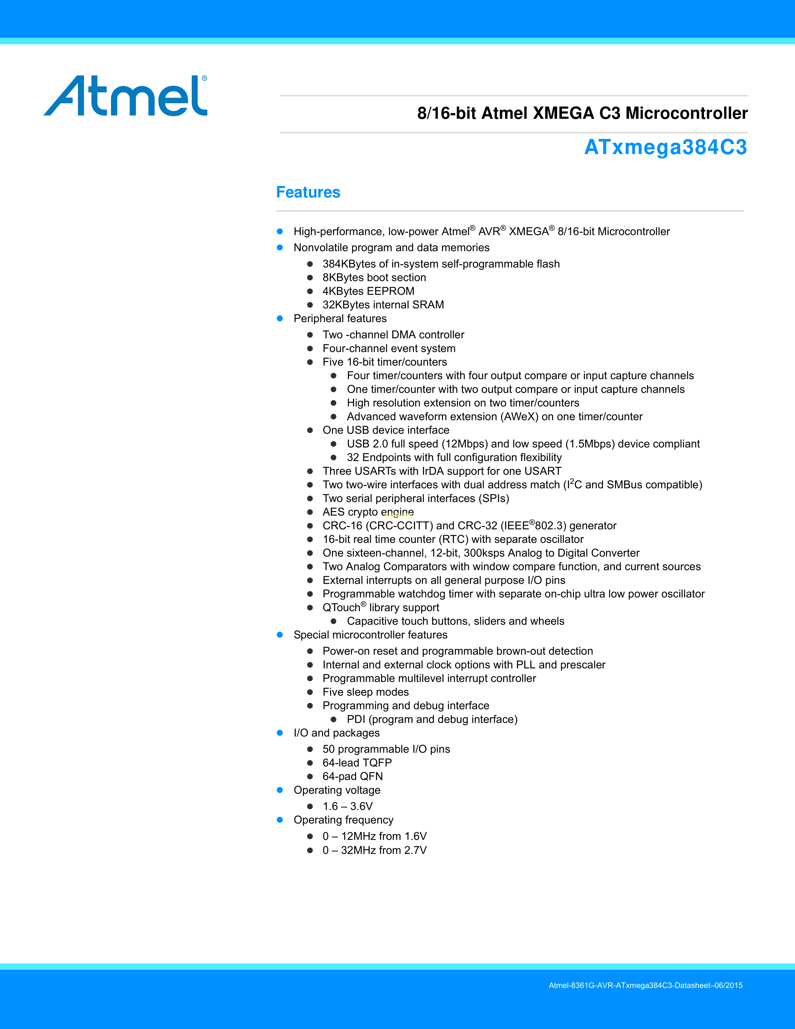 ATXMEGA384C3-ANR数据手册TQFP-64(14x14)封装MICROCHIP(美国微芯)PDF规格书,中英文下载