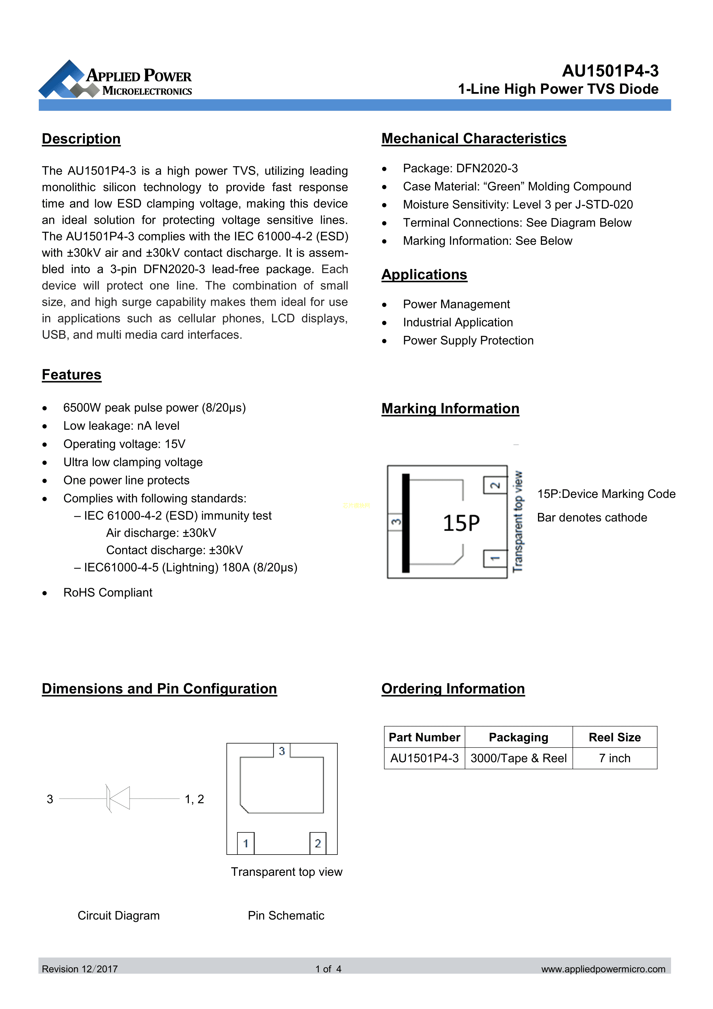 AU1501P4-3数据手册DFN2020-3封装AppliedPower(应能微)PDF规格书,中