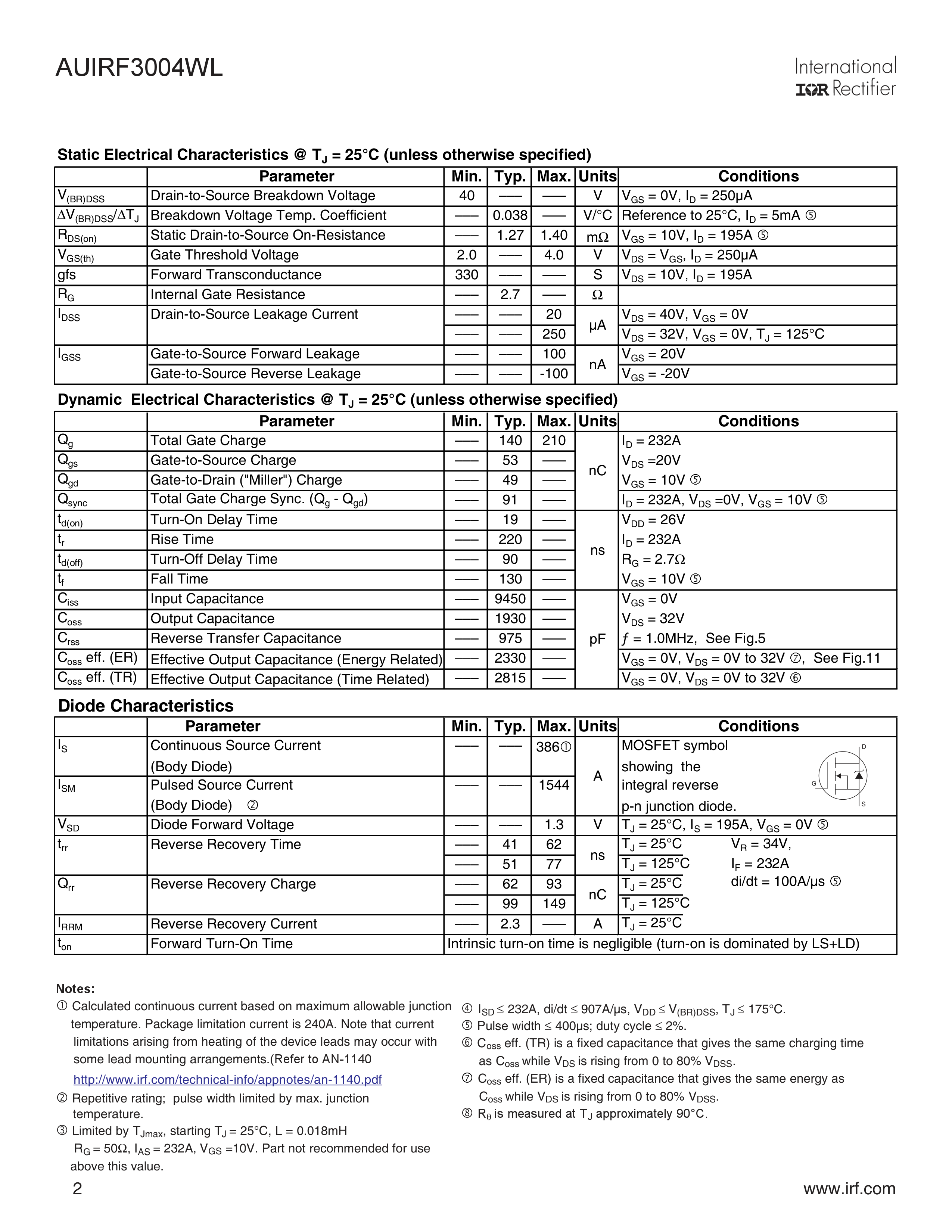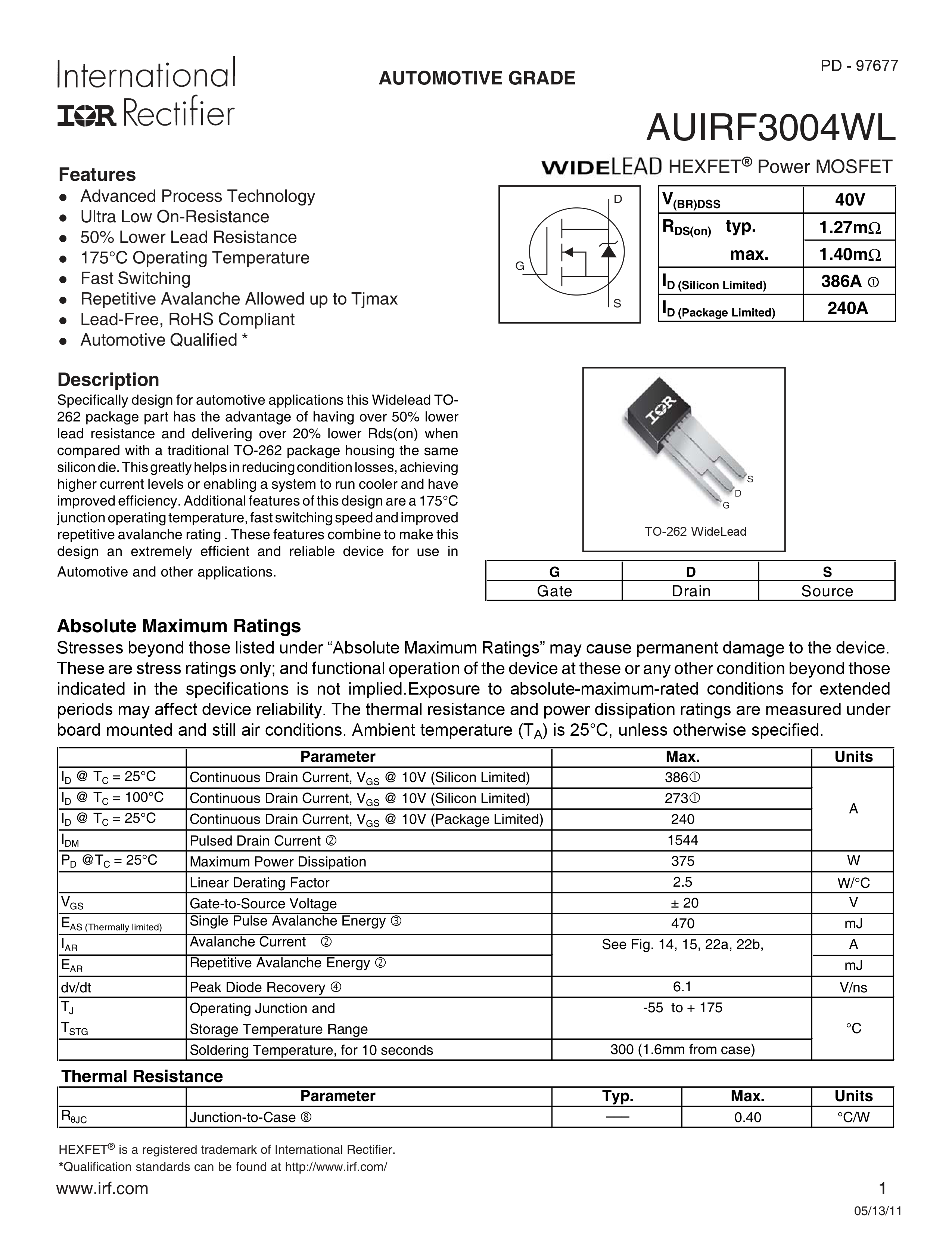 AUIRF3004WL数据手册TO-262 Wide封装Infineon(英飞凌)PDF规格书,中英