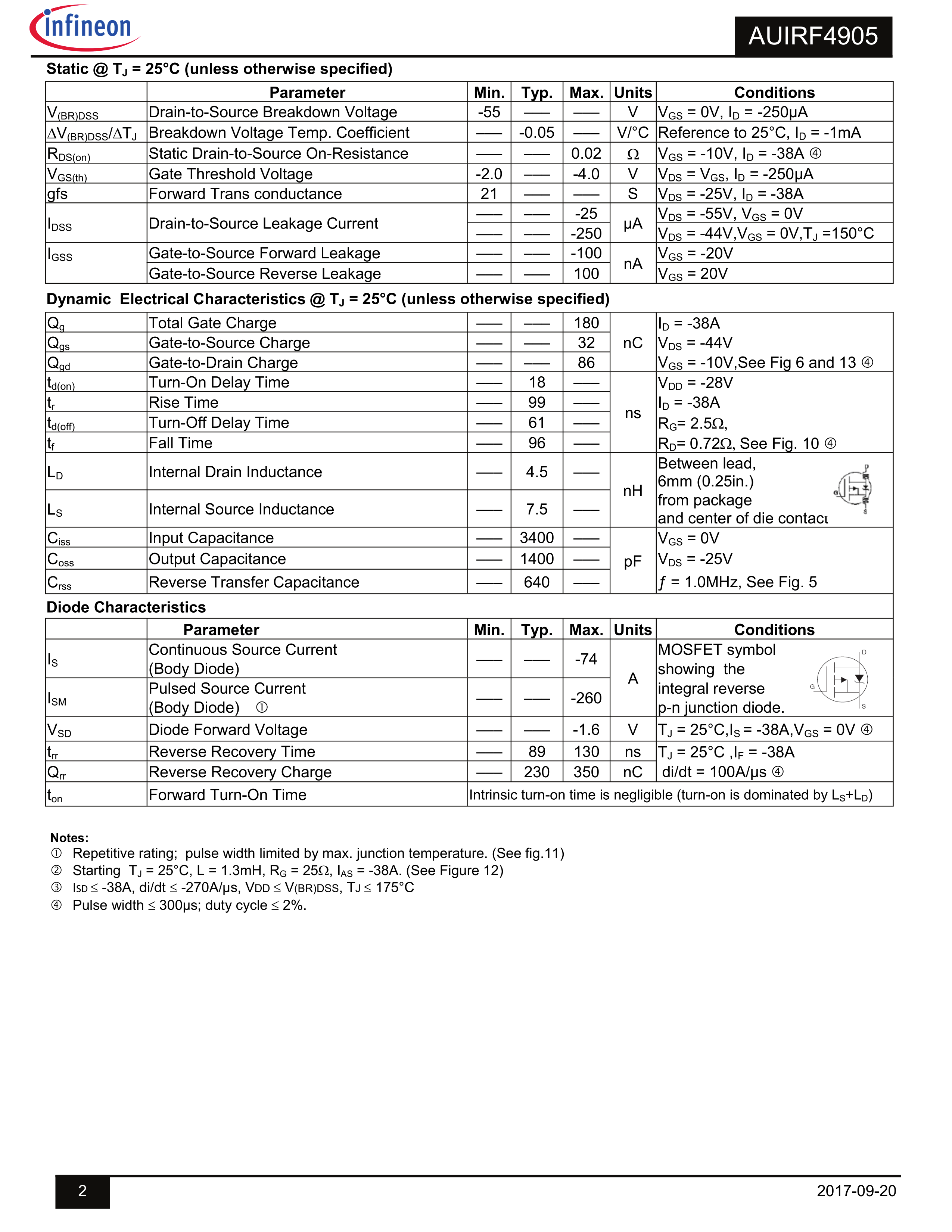 AUIRF4905数据手册TO-220封装Infineon(英飞凌)PDF规格书,中英文下载