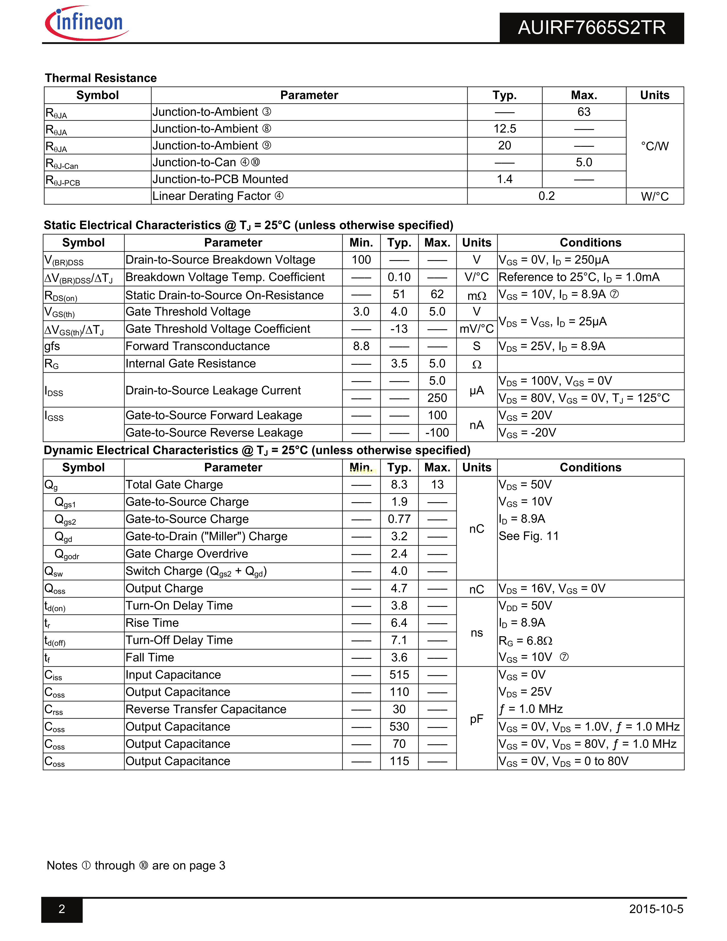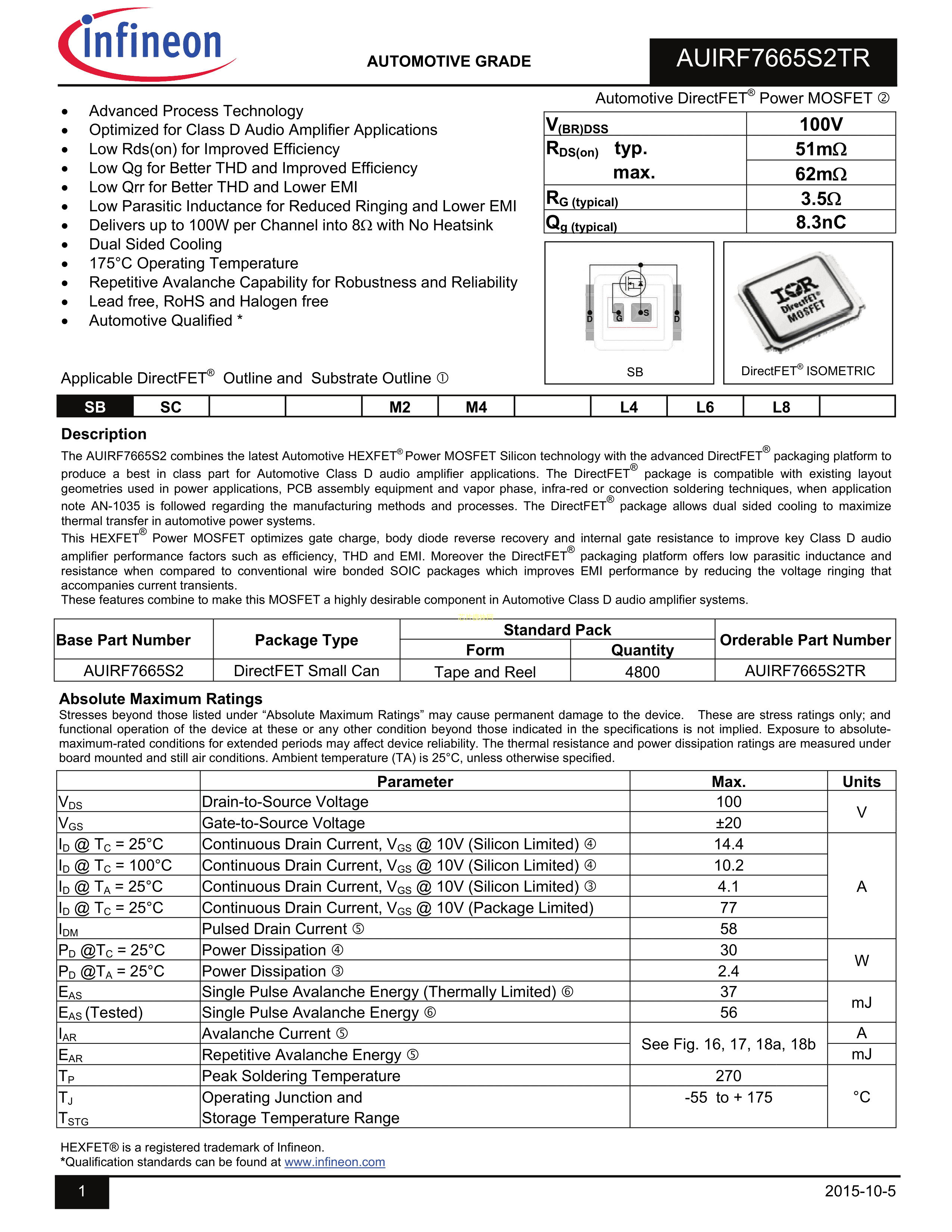 AUIRF7665S2TR数据手册DirectFET-SmallCan封装Infineon(英飞凌)