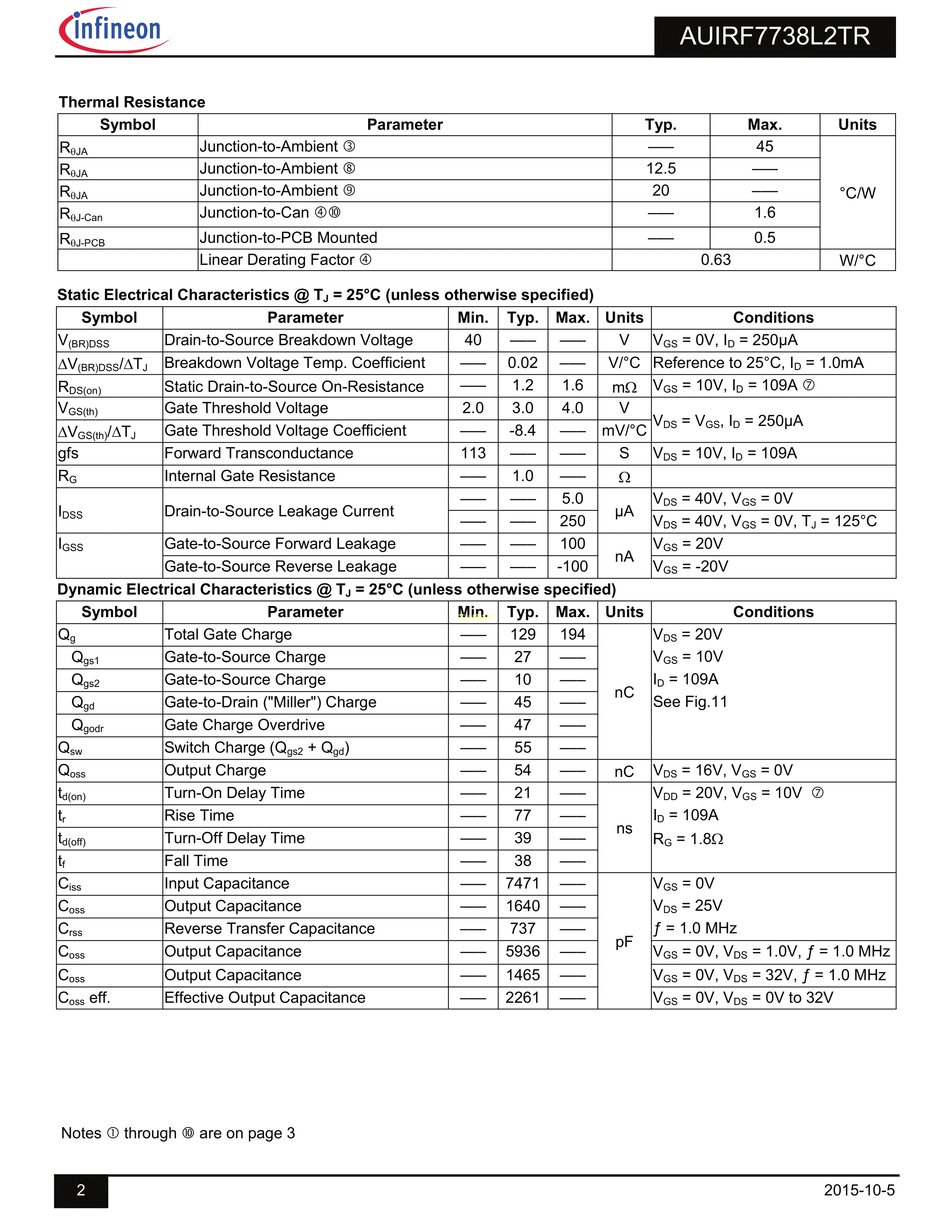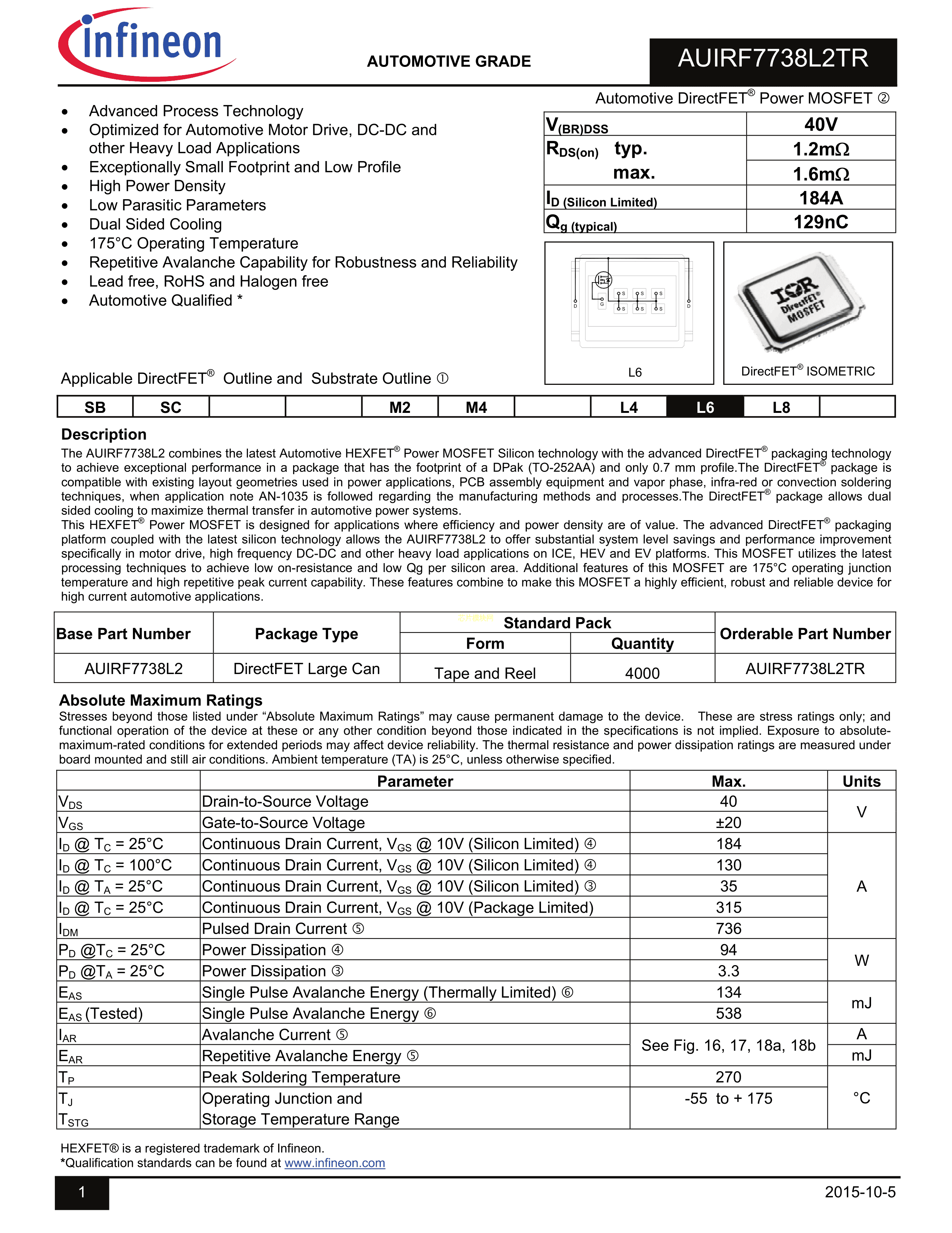 AUIRF7738L2TR数据手册DirectFET-LargeCan封装Infineon(英飞凌)