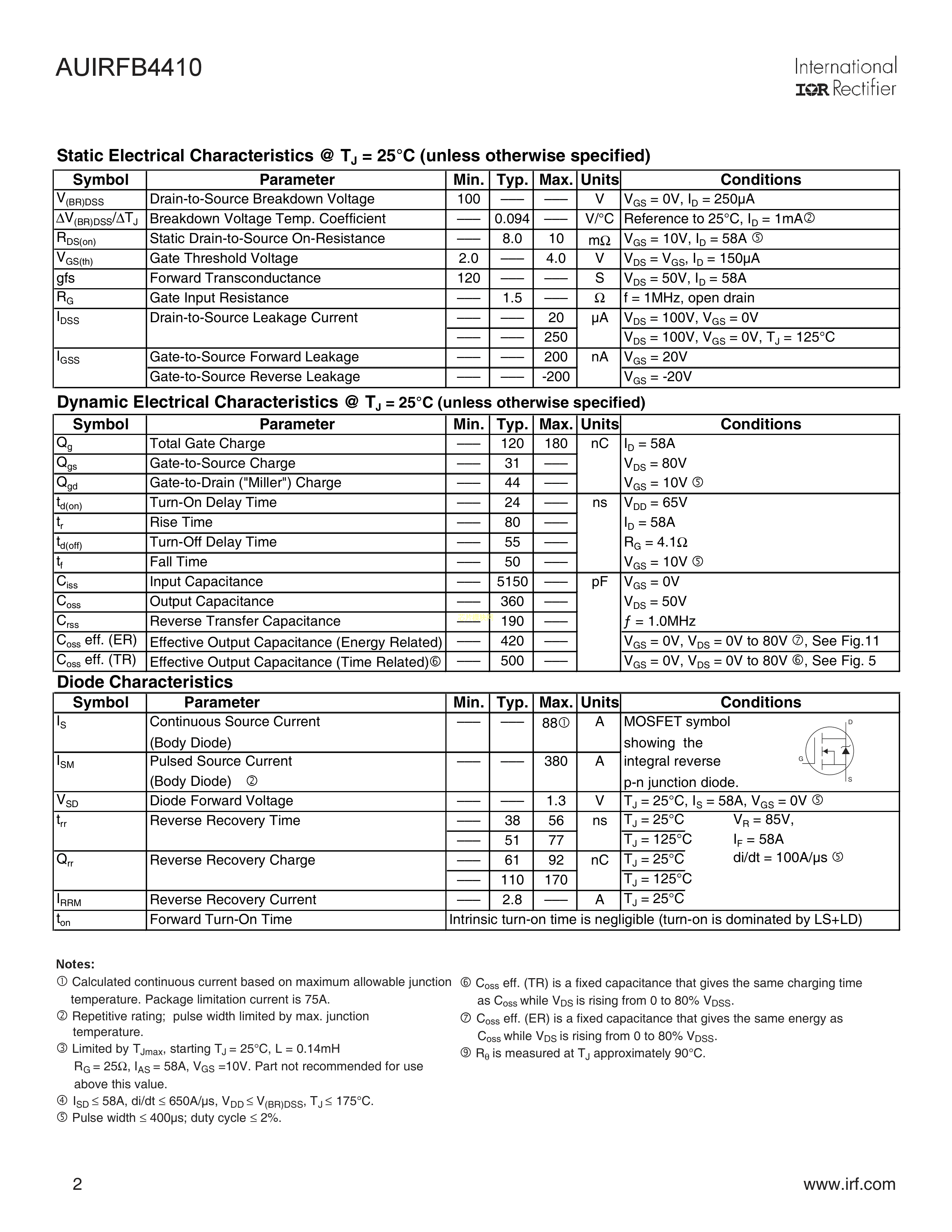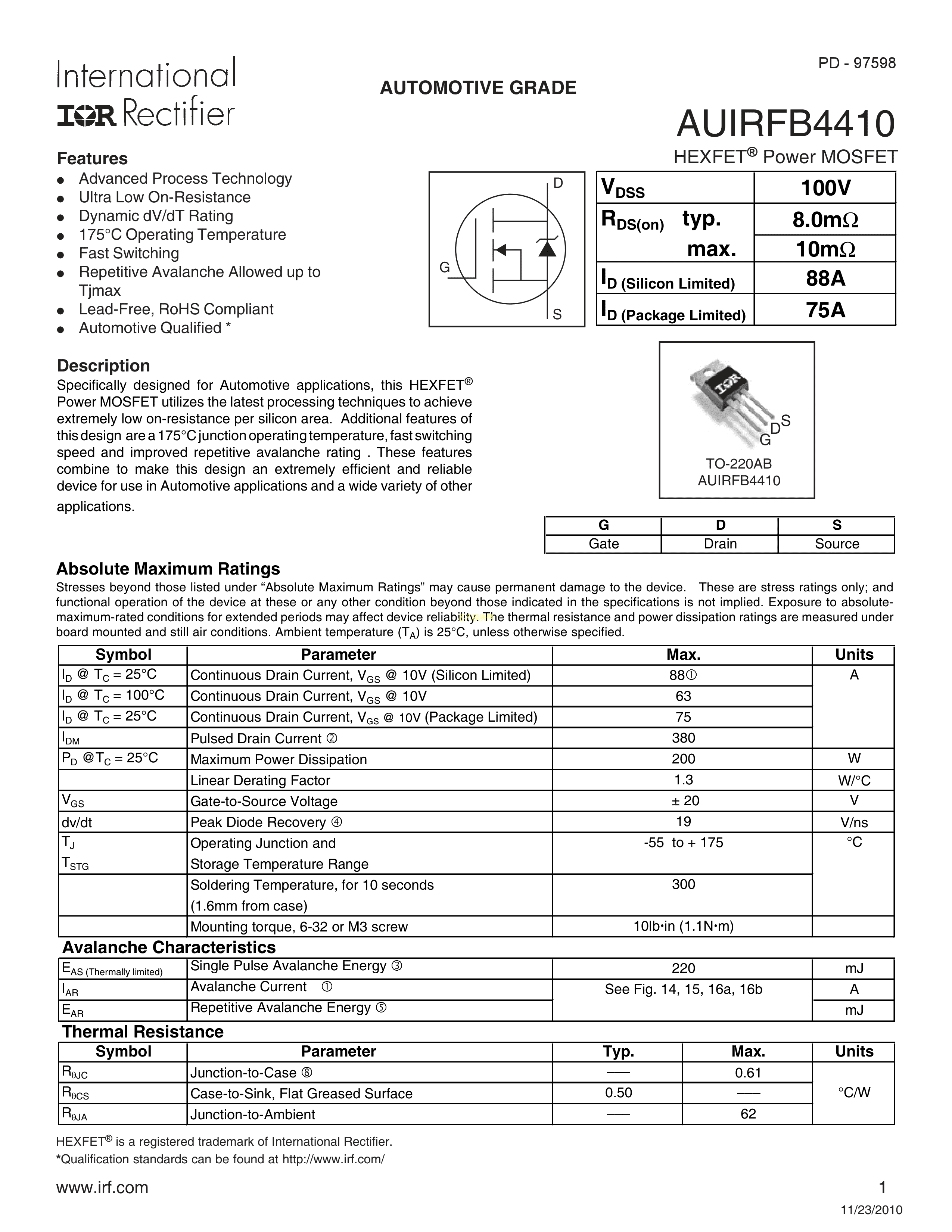 AUIRFB4410数据手册TO-220AB封装Infineon(英飞凌)PDF规格书,中英文下载
